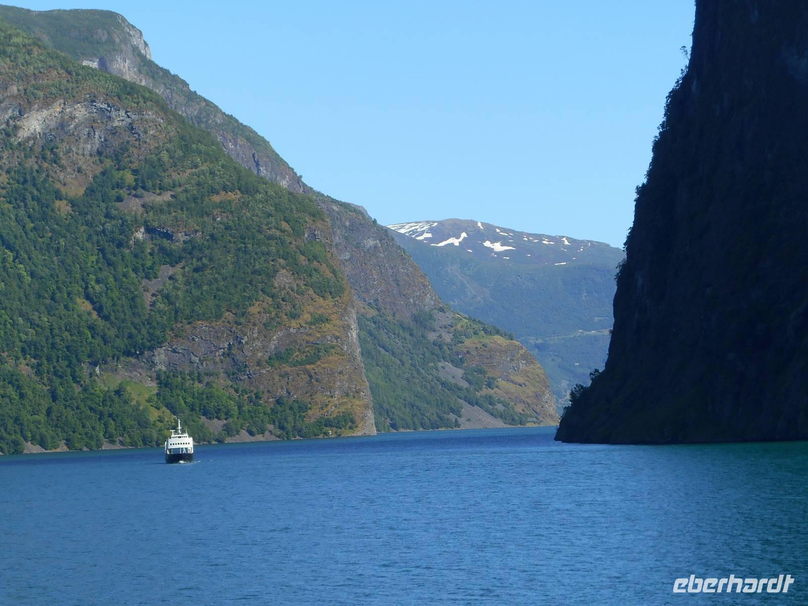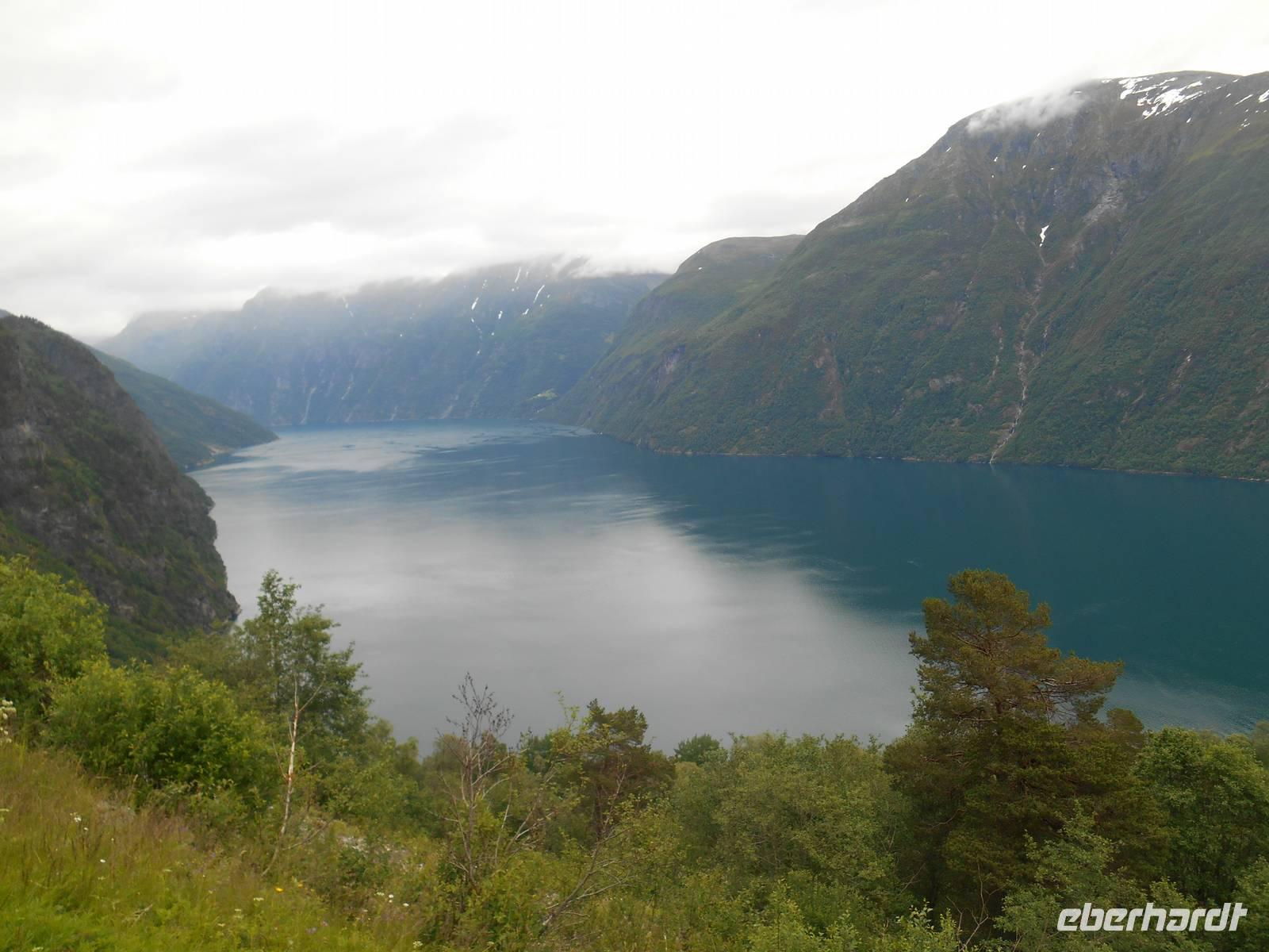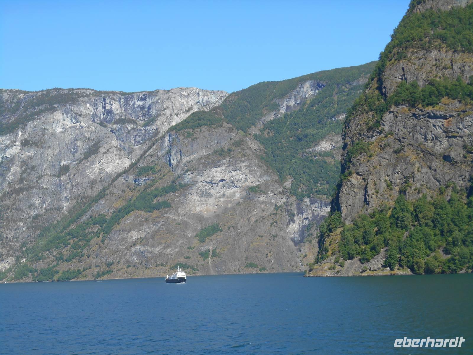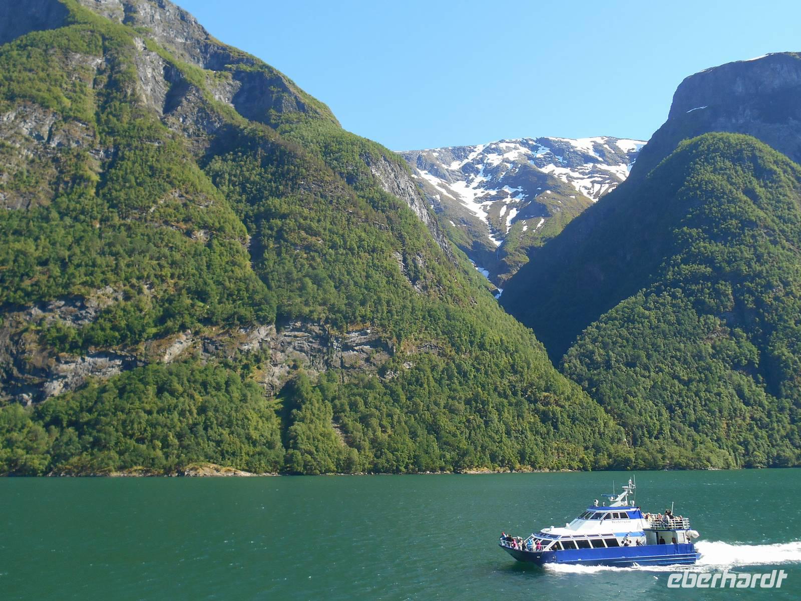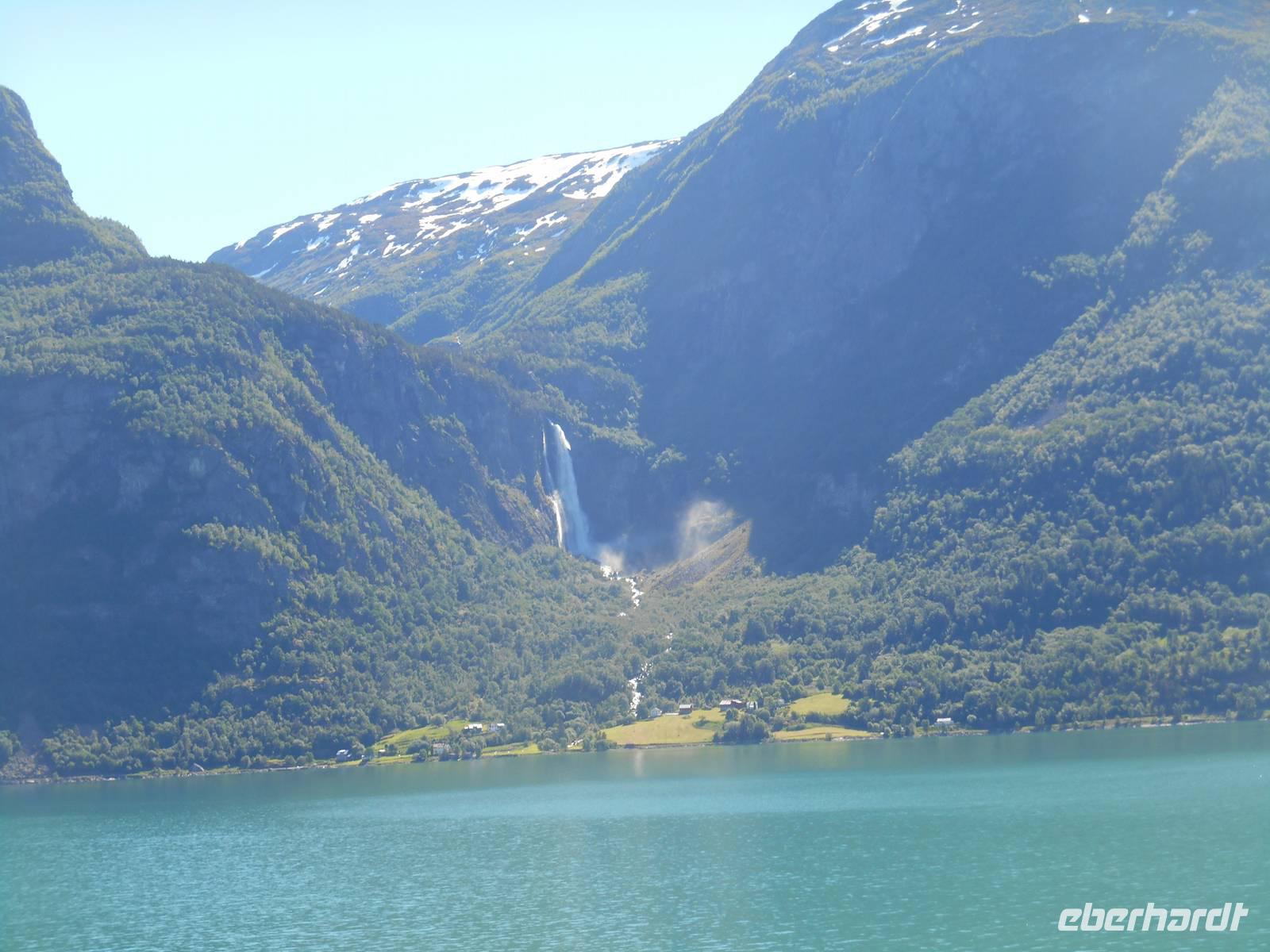 Wir fuhren heute über die Sognefjellstraße, der Reichsstraße 55. Der mit 1.434 Metern höchstgelegene Gebirgspass Nordeuropas ist seit 1938 für Autos befahrbar. Die Passüberquerung ist eine der ältesten Verbindungswege zwischen Ost und West, sie war die Hauptroute vom gesamten Gudbrandsdal zu den Küstensiedlungen in Sogn und bis nach Bergen. An Waren wurden hier hauptsächlich Salz, Hering und Fisch aus dem Westen und Häute, Butter, und Eisen aus dem Osten transportiert - in beiden Richtungen auf dem eigenen Rücken oder zu Pferd. Unterwegs nutzten wir die reichlichen Möglichkeiten für Fotostopps, obwohl es das Wetter heute wieder mal nicht so gut mit uns meinte. Schließlich erreichten wir Skjolden am Lustrafjord bzw. am inneren Ende des Sognefjords, hier waren wir übrigens etwa 200 Kilometer vom Meer entfernt. Entlang der Nordseite des Lustrafjords und mit herrlichen Blicken auf den Fjord und die zahlreichen Wasserfälle erreichten wir Kaupanger, von wo wir am Nachmittag mit dem Schiff nach Gudvangen ablegten. Nach einer herrlichen Fahrt durch die verschiedenen Fjordarme des Sognefjordes kamen wir am späten Nachmittag in Gudvangen, am südlichen Ende des schmalen Nærøyfjordes, an. Mit dem Bus fuhren wir nun in Richtung Bergen weiter. Auf unserem Weg dorthin legten wir einen Stopp am Tvindefoss ein, ein herrlicher Wasserfall - eine wahre „Wassersymphonie"! Schließlich erreichten wir Voss, das administrative, kommerzielle und touristische Zentrum eines ausgedehnten Tals (Vossevangen) inmitten der Bergwelt zwischen Sogne- und Hardangerfjord. Die fruchtbaren Böden haben die Region zum bedeutendsten landwirtschaftlichen Nutzgebiet nach Südostnorwegen, Trondheim-Gebiet und Gudbrandsdal gemacht. Am Abend erreichten wir schließlich das zentral gelegene Rica Hotel in Bergen, unser Domizil für die nächsten zwei Nächte. Die meisten Hotelzimmer waren leider extrem klein und nicht wirklich einladend- nichts desto trotz, die ideale Lage im Zentrum der Stadt überzeugte letztendlich.