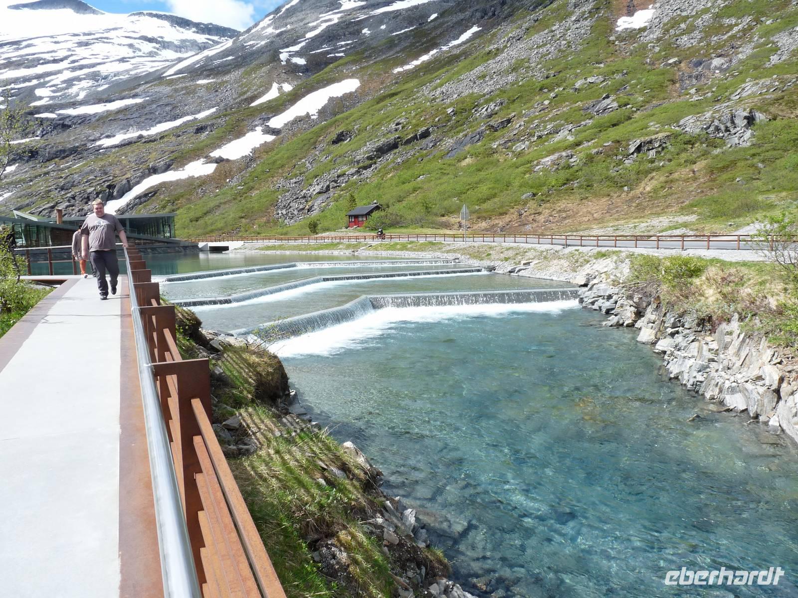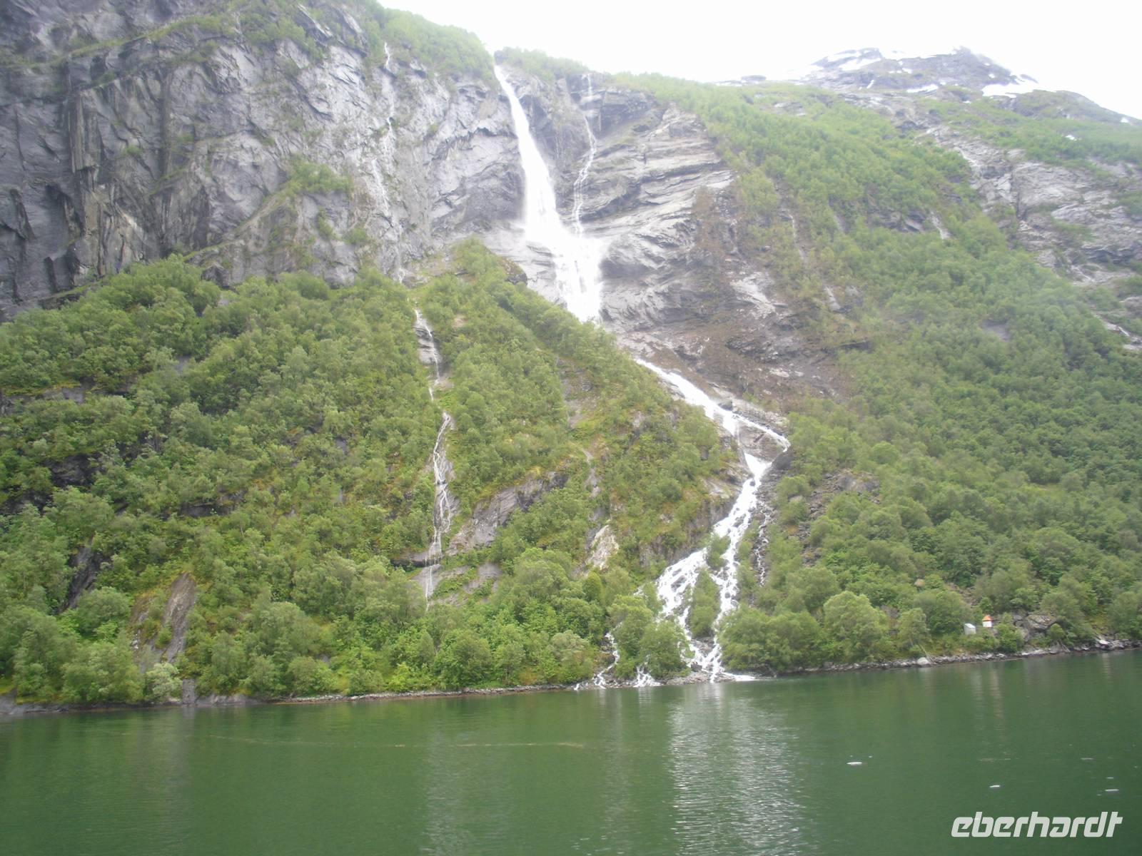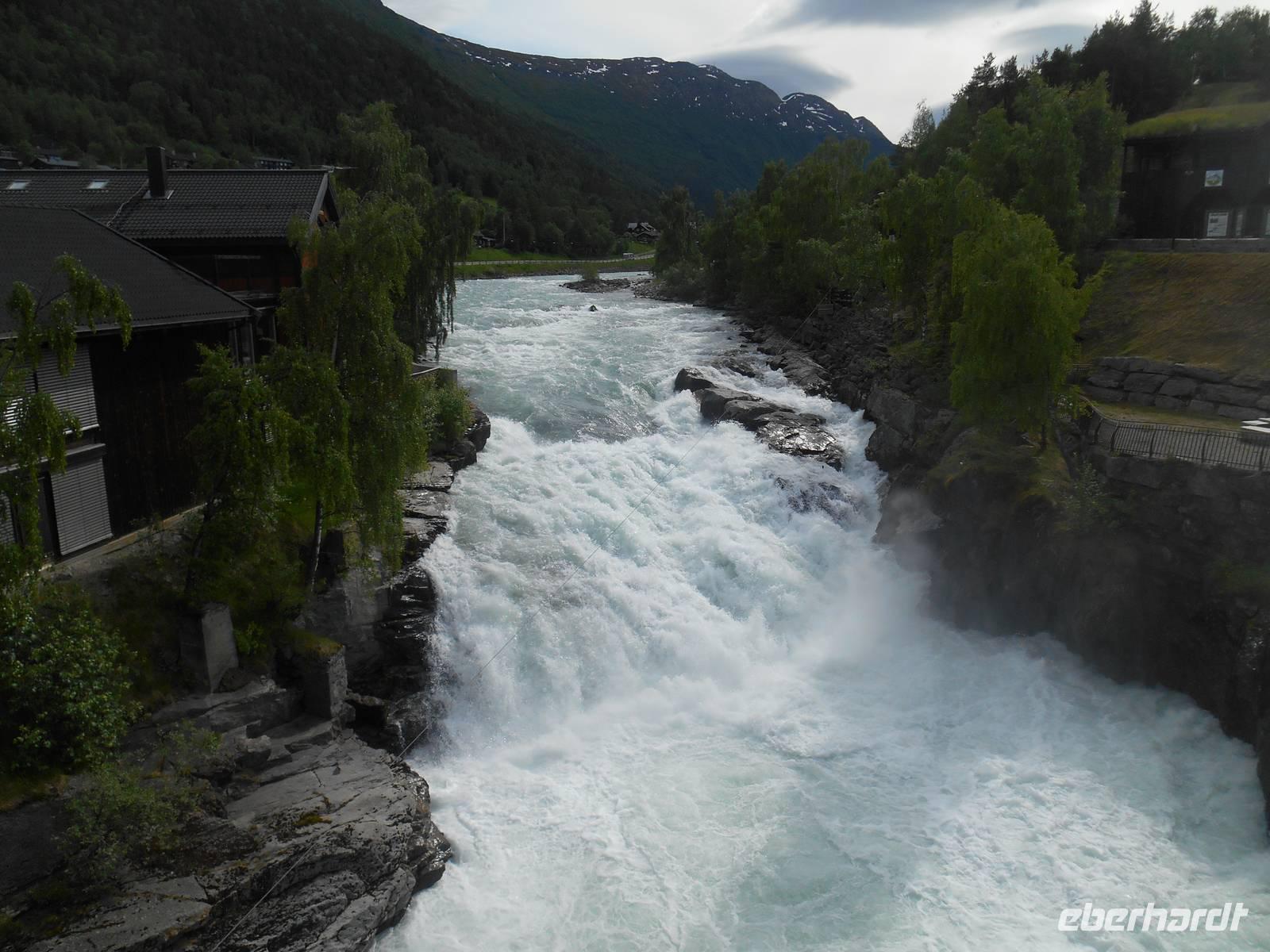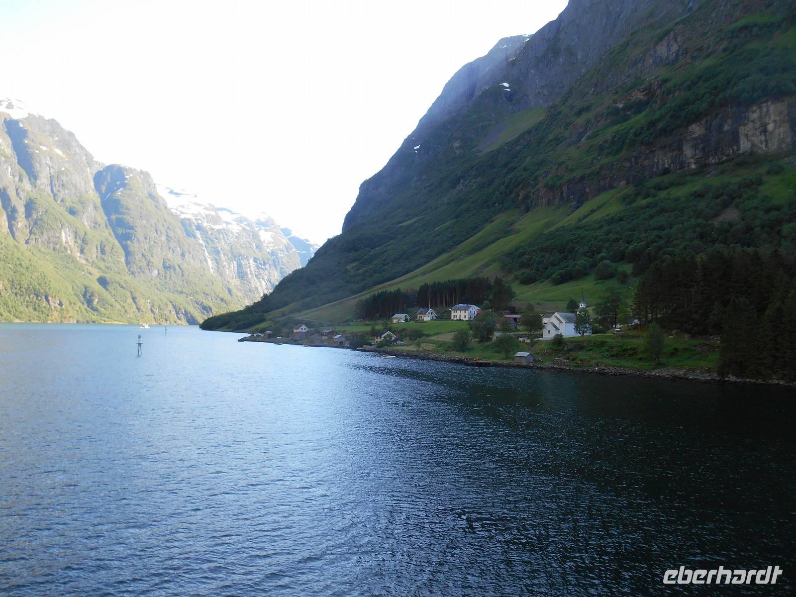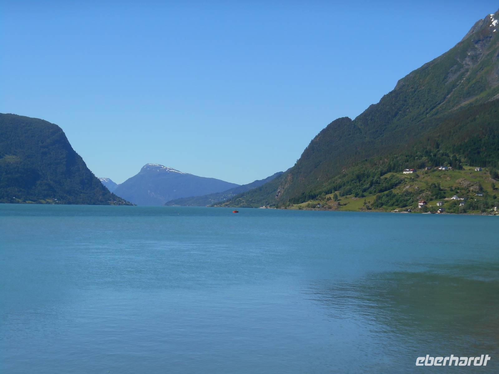 Wir fuhren heute über die Sognefjellstraße, der Reichsstraße 55. Der mit 1.434 Metern höchstgelegene Gebirgspass Nordeuropas ist seit 1938 für Autos befahrbar. Die Passüberquerung ist eine der ältesten Verbindungswege zwischen Ost und West, sie war die Hauptroute vom gesamten Gudbrandsdal zu den Küstensiedlungen in Sogn und bis nach Bergen. An Waren wurden hier hauptsächlich Salz, Hering und Fisch aus dem Westen und Häute, Butter, und Eisen aus dem Osten transportiert - in beiden Richtungen auf dem eigenen Rücken oder zu Pferd. Unterwegs nutzten wir die reichlichen Möglichkeiten für Fotostopps, obwohl es das Wetter heute wieder mal nicht so gut mit uns meinte. Schließlich erreichten wir Skjolden am Lustrafjord bzw. am inneren Ende des Sognefjords, hier waren wir übrigens etwa 200 Kilometer vom Meer entfernt. Entlang der Nordseite des Lustrafjords und mit herrlichen Blicken auf den Fjord und die zahlreichen Wasserfälle erreichten wir Kaupanger, von wo wir am Nachmittag mit dem Schiff nach Gudvangen ablegten. Nach einer herrlichen Fahrt durch die verschiedenen Fjordarme des Sognefjordes kamen wir am späten Nachmittag in Gudvangen, am südlichen Ende des schmalen Nærøyfjordes, an. Mit dem Bus fuhren wir nun in Richtung Bergen weiter. Auf unserem Weg dorthin legten wir einen Stopp am Tvindefoss ein, ein herrlicher Wasserfall - eine wahre „Wassersymphonie"! Schließlich erreichten wir Voss, das administrative, kommerzielle und touristische Zentrum eines ausgedehnten Tals (Vossevangen) inmitten der Bergwelt zwischen Sogne- und Hardangerfjord. Die fruchtbaren Böden haben die Region zum bedeutendsten landwirtschaftlichen Nutzgebiet nach Südostnorwegen, Trondheim-Gebiet und Gudbrandsdal gemacht. Am Abend erreichten wir schließlich das zentral gelegene Rica Hotel in Bergen, unser Domizil für die nächsten zwei Nächte. Die meisten Hotelzimmer waren leider extrem klein und nicht wirklich einladend- nichts desto trotz, die ideale Lage im Zentrum der Stadt überzeugte letztendlich.