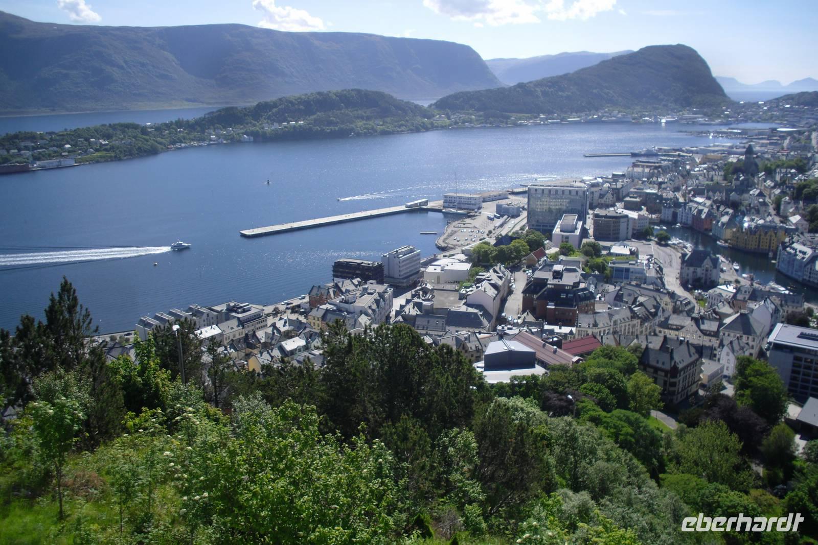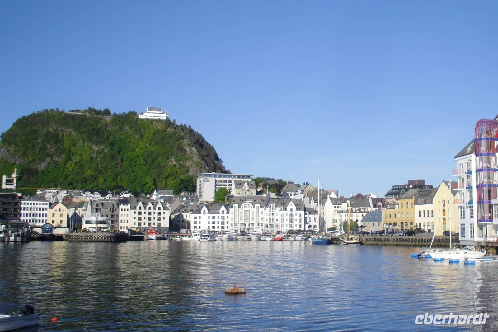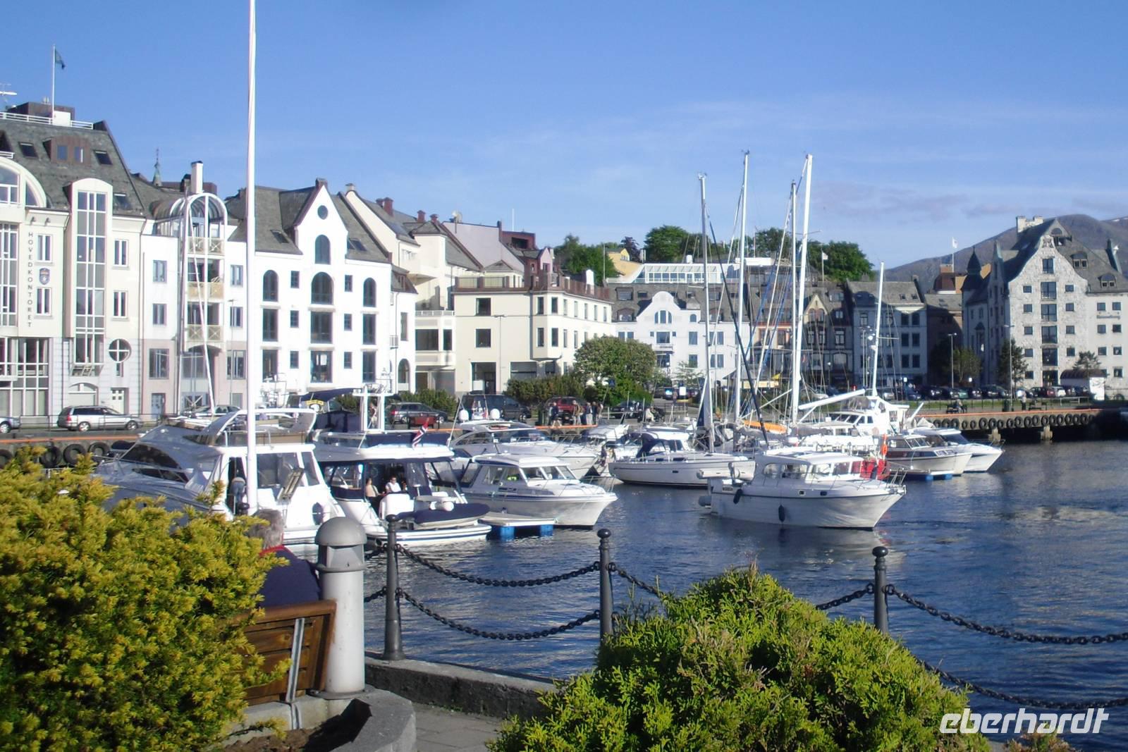 Die Fahrt führte uns heute vorerst zum Varden, dem 407 Meter hohen Hausberg von Molde. Hier oben konnten wir das bekannte "Moldepanorama" genießen, denn man hat einen herrlichen Blick über den Fjord und auf die schneebedeckten Gipfel der Romsdaler Alpen - wir hatten übrigens riesiges Glück und der Wettergott hatte ein Einsehen mit uns! Nun sollte es allerdings weiter in Richtung Trollstigen gehen. Die umgebenden Berge hier sind schroff - Namen wie Kongen (König), Dronningen (Königin) und Bispen (Bischoff) bestätigen die Majestät dieser Bergwelt. Hoch oben stürzt sich der Stigfossen ins üppig grüne Isterdal, und mittendurch steigt die Trollstigen-Straße an der Bergseite empor. Nach einer Bauzeit von acht Jahren wurde der Trollstigen 1936 eröffnet und selbst heute ist die Straße ein gutes Beispiel für hohe Ingenieur- und Baukunst. Übersetzen könnte man den Namen "Trollstigen" übrigens mit "Zauberweg". Was sind nun eigentlich Trolle? - Es sind im nordischen Volksglauben Dämonen in Riesengestalt. Bereits seit grauer Vorzeit leben in den Bergen und in den alten Hünengräbern Norwegens die Trolle. Sie sind - wie auch die Wichteln und Zwerge - elbische Wesen. Ihre Herkunft ist unbekannt. Einem Geistlichen, der sie vertreiben wollte, klagten sie einmal, sie seien herabgestürzte Engel. Einer anderen Geschichte zufolge sind sie Nachkommen der alten Riesen, die immer weiter geschrumpft sind und weiter schrumpfen. Die Trolle sind gedrungene, plumpe, erdfarbene Wesen mit mächtigen Knollennasen; manche haben einen Schwanz und einen zotteligen Pelz. Die Kleider sind grün wie das Moos an einem Waldsee oder grau wie die Flechten auf den Fjellen. Es ist nicht leicht, Bekanntschaft mit einem Troll zu machen - das gelingt angeblich nur um die Mittagszeit geborenen Sonntagskindern oder den neunten Kindern von Eltern, die selbst neunte Kinder ihrer Eltern waren. Und das ist auch gut so! Es gibt nämlich ganz unterschiedliche Trolle. Die einen sind den Menschen freundlich und wohlgesonnen. Sie sind gutmütige Geschöpfe, die oft in der Nähe von Menschen wohnen und nachbarschaftlichen Umgang pflegen. Ihnen zu begegnen ist eine Freude und ein besonderes Erlebnis. Andere Trolle aber sind sehr böse, und vor ihnen muss man sich in Acht nehmen. Die norwegischen Bauern wissen ein Lied davon zu singen, wenn das Trollweib zur Saatzeit als Wirbelwind über den Acker fegt und mit ihrem Kleid die Saat auffängt. Auch vertauschen manche Trolle die Kinder der Menschen und legen an ihrer Stelle ein Trollkind unter, einen missgestalteten Wechselbalg. Es gibt also viel zu berichten über die Trolle..., wir mussen aber weiter. In Ålesund angekommen, ging es mit unserem Bus auf den Stadtberg Aksla hinauf - wir wurden bei strahlendem Sonnenschein mit einem tollen Blick auf die Stadt belohnt! Am späten Nachmittag checkten wir schließlich in unserem zentral gelegenen Rica-Parken Hotel in Ålesund ein. Manch einer unserer Gäste nutzte die verbleibende Zeit bis zum Abendessen zu einem Spaziergang durch die Stadt. Wer lässt sich nicht von Ålesund faszinieren? - Die Stadt gibt sich jung, doch die Geschichte, die sie erzählt, ist voller Dramatik. In einer stürmischen Winternacht vor über einhundert Jahren brannte der gesamte Stadtkern bis auf die Grundmauern nieder. Nur wenige Häuser überlebten die Flammen und zehntausend Menschen verloren ihr Zuhause. Wie ein Vogel Phönix aus der Asche erhob sich eine neue Stadt im charakteristischen Jugendstil mit einer Vielfalt an Türmen, Spitzen und wunderschönen Ausschmückungen, die aus einer Phantasiewelt zu stammen scheinen. Nicht ohne Grund wurde Ålesund im Jahre 2007 von den Norwegern zur schönsten Stadt des Landes ernannt.
