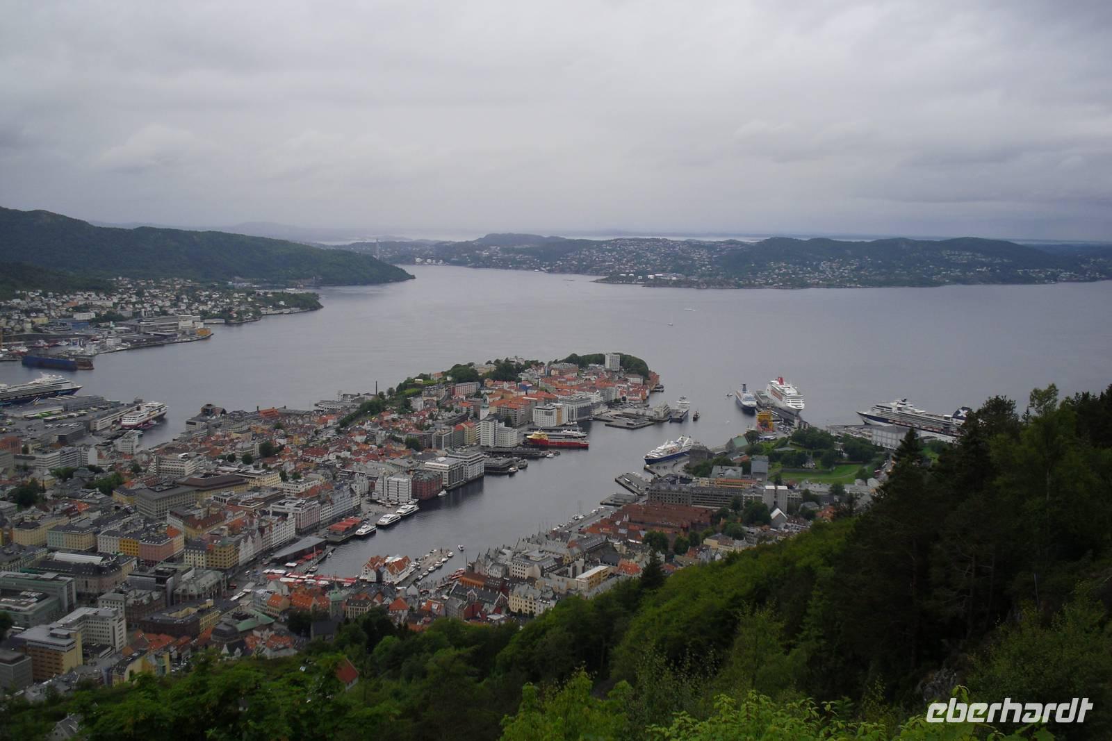 Nach einem reichhaltigen Frühstücksbuffet begannen wir mit unserer etwa 2-stündigen Stadtrundfahrt durch Bergen. Seit König Olaf Kyrre im 11. Jahrhundert mit seinen Wikingerschiffen in der Hafenbucht Vågen anlegte und Bergen dort gründete, zieht die Stadt Menschen aus aller Welt an. Viele Besucher kamen und gingen, andere ließen sich in der norwegischen Hafenstadt nieder. Viele Einheimische verließen ihre traute Umgebung und lernten während ihrer Wanderjahre andere Länder, Leute und Sitten kennen, ehe sie zurückkamen. So konnte sich Bergen zu einem Schmelztiegel verschiedener Kulturen und zu "Norwegens internationalster Stadt" entwickeln. Bergen wuchs um den Hafen herum nach und nach zu einer Stadt heran. Handel, Schifffahrt und Handwerk waren ihre Existenzgrundlage. Schon früh wurde Bergen die größte Stadt des Nordens und Norwegens erste Haupt- und Residenzstadt des Königs. Bereits im 14. Jahrhundert war die Stadt so bedeutend geworden, dass die Hanseaten auf Bryggen ein Kontor gründeten, das noch heute zu sehen ist. Nachdem wir interessante Informationen über diese Stadt erhalten hatten, konnten wir heute mal nach individuellen Bedürfnissen bummeln und etwas Freizeit genießen. Alle unsere Gäste nutzten dabei die Gelegenheit, mit der einzigen Standseilbahn Skandinaviens zum Berg Fløyen hinauf zu fahren. Vom sogenannten "Dach von Bergen" hat man eine fantastische Aussicht über die Stadt, den Schiffsverkehr, die Fjorde und nicht zuletzt die umliegenden Inseln. Eine Aussicht, die einen beeindruckenden Überblick über die Vielfalt der Stadt und der näheren Umgebung gewährt. Eine Aussicht, die den Blick auf das offene Meer, auf die 50 km nördlich gelegene Insel Fedje sowie auf die südlich gelegenen Inseln der Region Sunnhordaland erlaubt. Bergen machte übrigens heute seinem Ruf als regenreichste Großstadt keine Ehre, denn hier soll es an etwa 250 Tagen im Jahr regnen - wir durften hier übrigens einen "fast" regenfreien Tag verbringen!