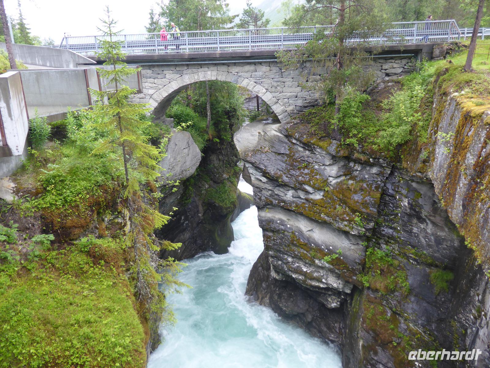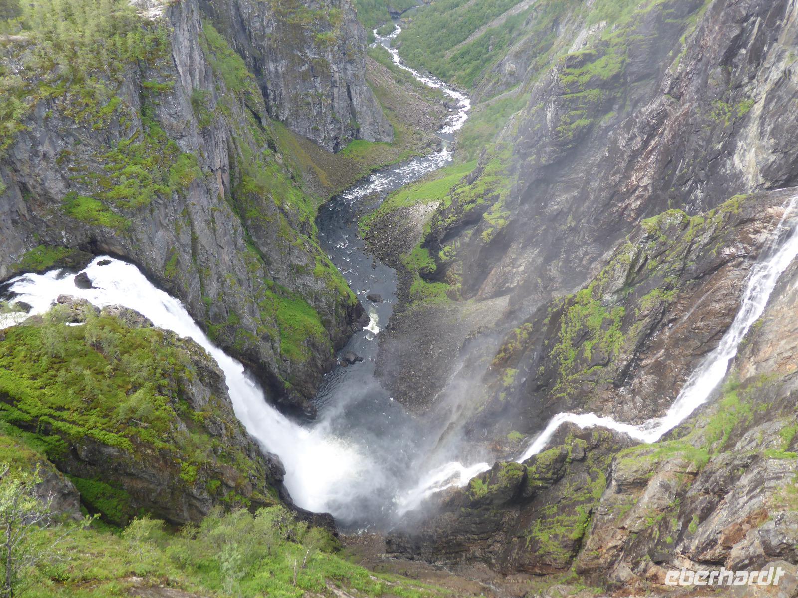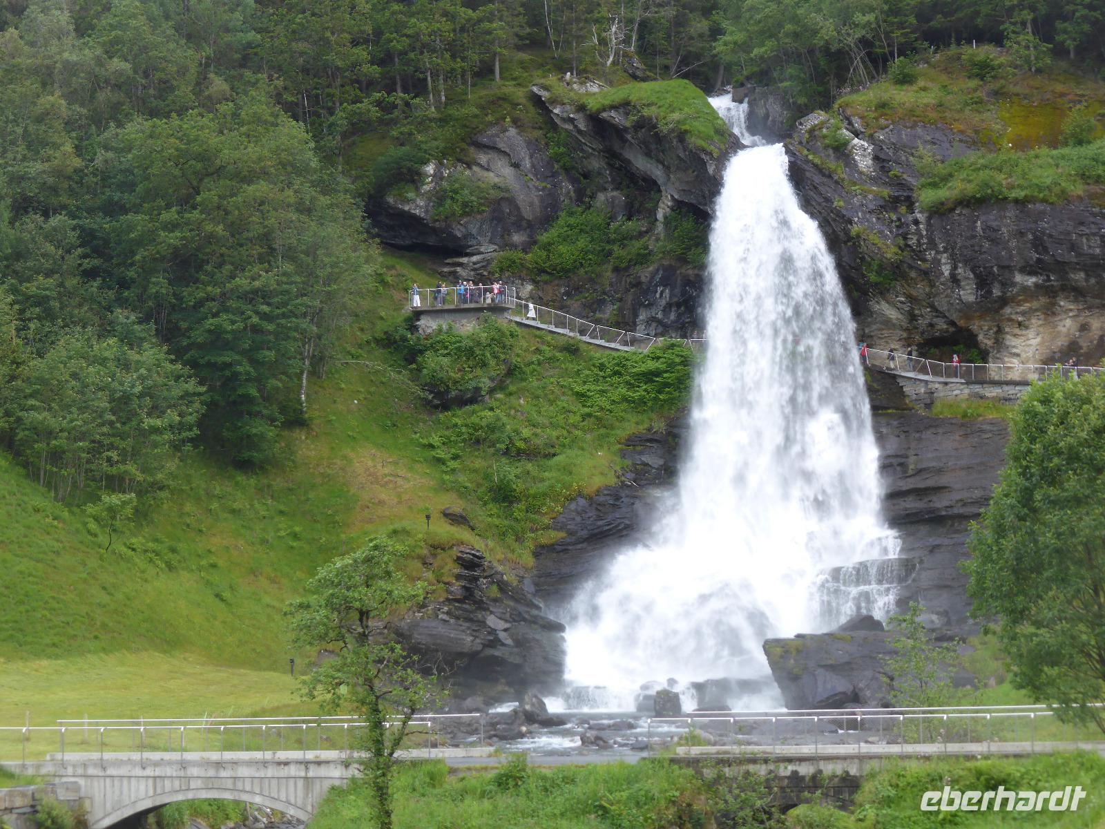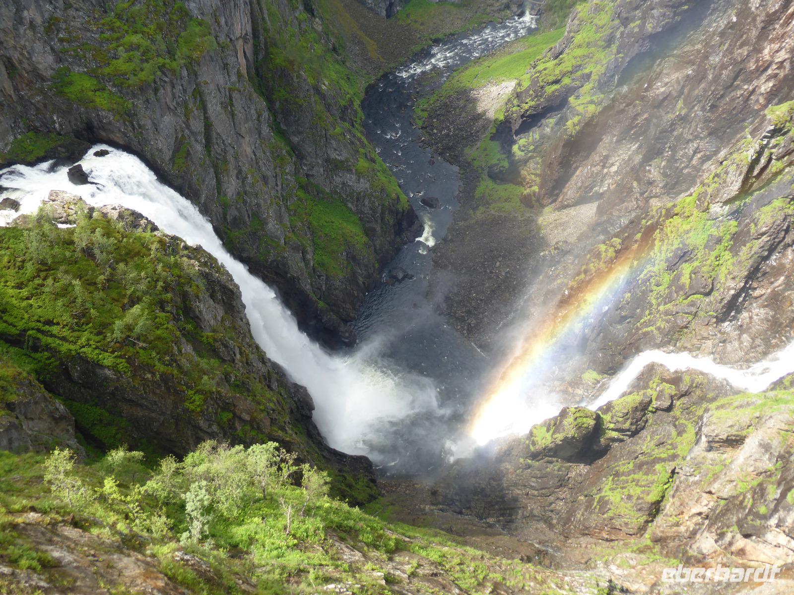 Doch bevor wir diesen Fjord erreichten, legten wir einen Stopp am Steindalsfossen ein. Dieser Wasserfall ist eine Besonderheit, da man hinter dem Wasser entlang gehen kann ohne nass zu werden. Er entstandt 1699 als der Fluss seinen Verlauf änderte. Entlang der schmalen Straßen fuhren wir entlang des malerischen Hardangerfjordes. Die Engstellen meisterte Dieter wieder mit Bravour. Den Hardangerfjord überquerten wir mit der spektakulären Hardangerbrücke, welche 2013 eröffnet wurde. Auf dem Weg zur Hardangervidda, dem „Dach Norwegens" passierten wir im Mabötal den Vöringfossen. Er gehört zu den bekanntesten Wasserfällen Norwegens. Von zwei Standorten aus konnten wir die Kraft des Wassers bewundern. Aus touristischen Gründen wird der Wasserfall in den Sommermonaten zur Energiegewinnung nicht „abgedreht".
