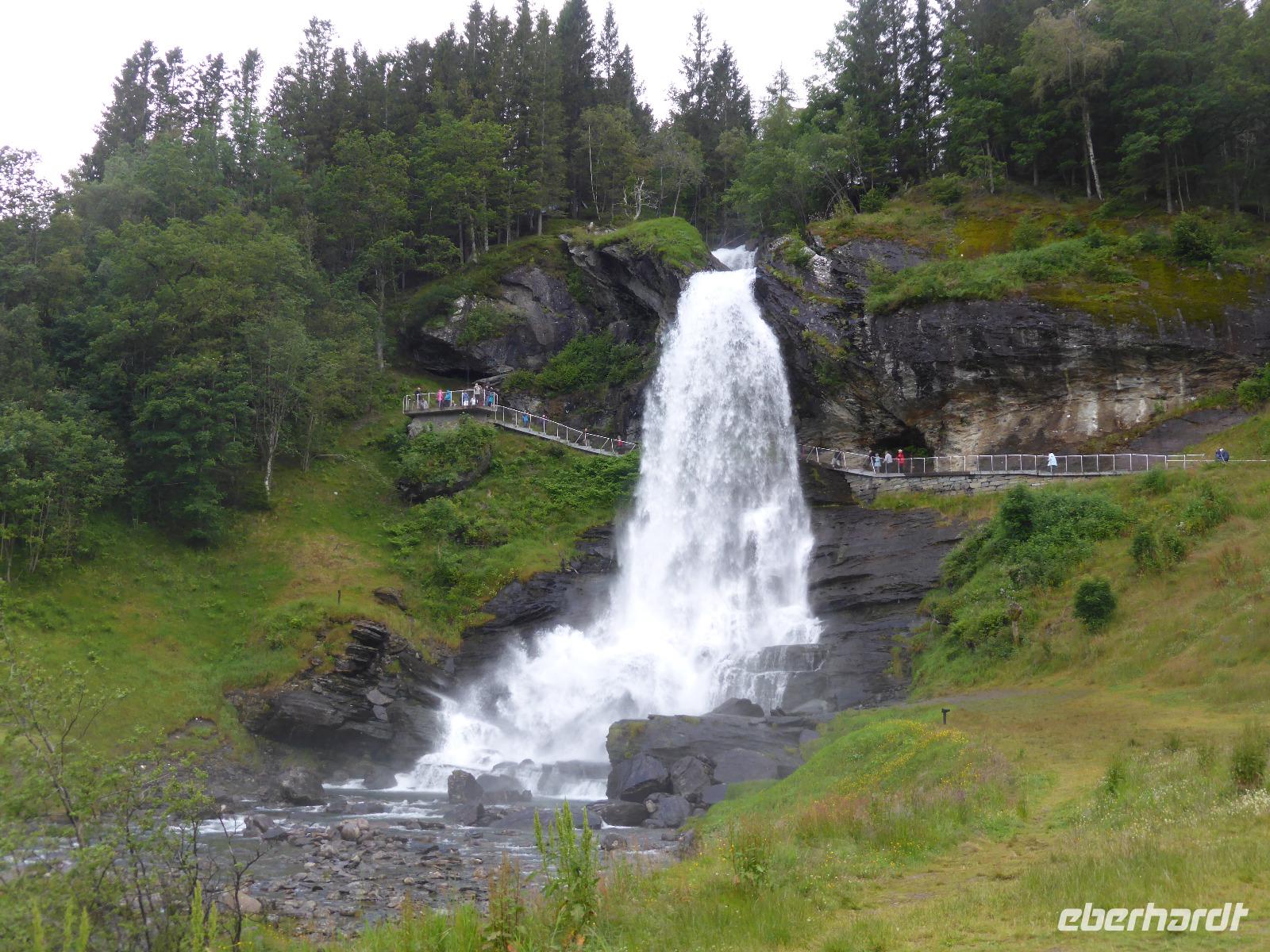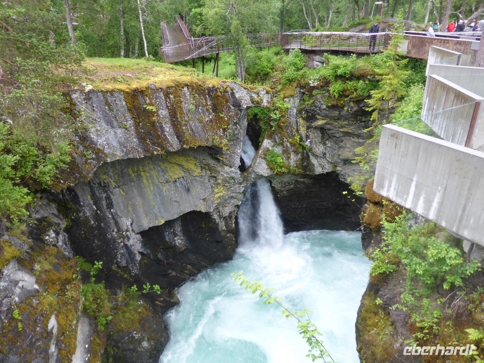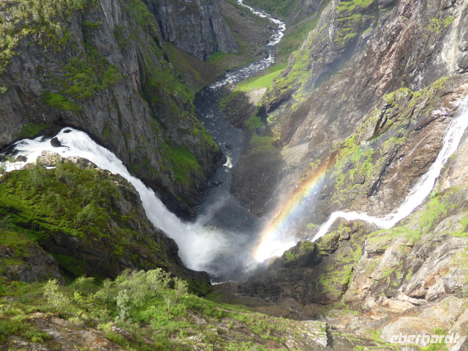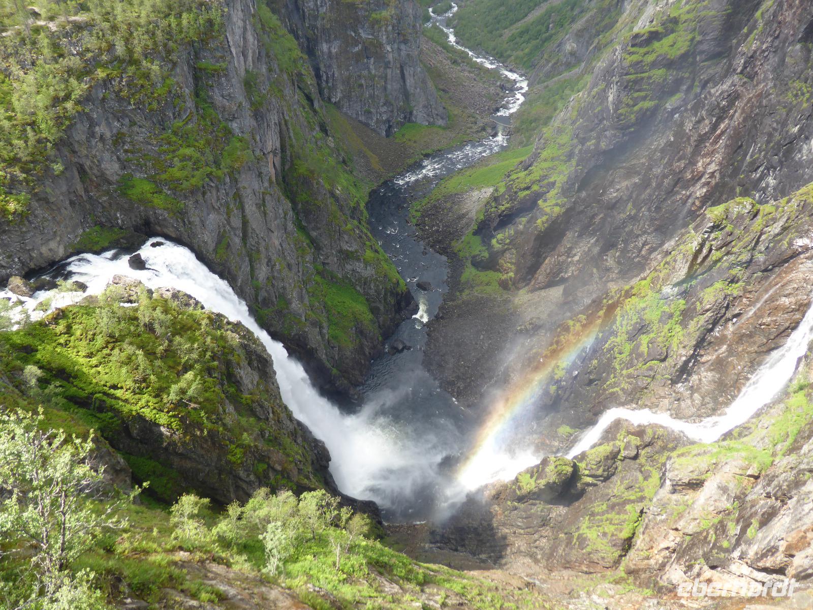 Doch bevor wir diesen Fjord erreichten, legten wir einen Stopp am Steindalsfossen ein. Dieser Wasserfall ist eine Besonderheit, da man hinter dem Wasser entlang gehen kann ohne nass zu werden. Er entstandt 1699 als der Fluss seinen Verlauf änderte. Entlang der schmalen Straßen fuhren wir entlang des malerischen Hardangerfjordes. Die Engstellen meisterte Dieter wieder mit Bravour. Den Hardangerfjord überquerten wir mit der spektakulären Hardangerbrücke, welche 2013 eröffnet wurde. Auf dem Weg zur Hardangervidda, dem „Dach Norwegens" passierten wir im Mabötal den Vöringfossen. Er gehört zu den bekanntesten Wasserfällen Norwegens. Von zwei Standorten aus konnten wir die Kraft des Wassers bewundern. Aus touristischen Gründen wird der Wasserfall in den Sommermonaten zur Energiegewinnung nicht „abgedreht".