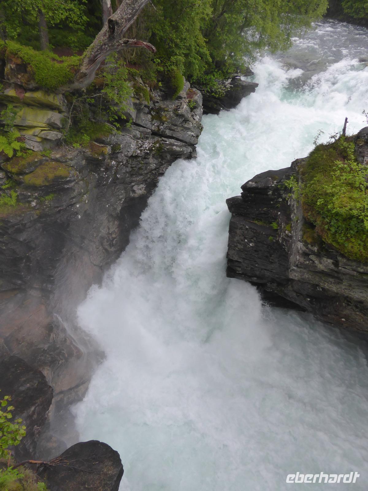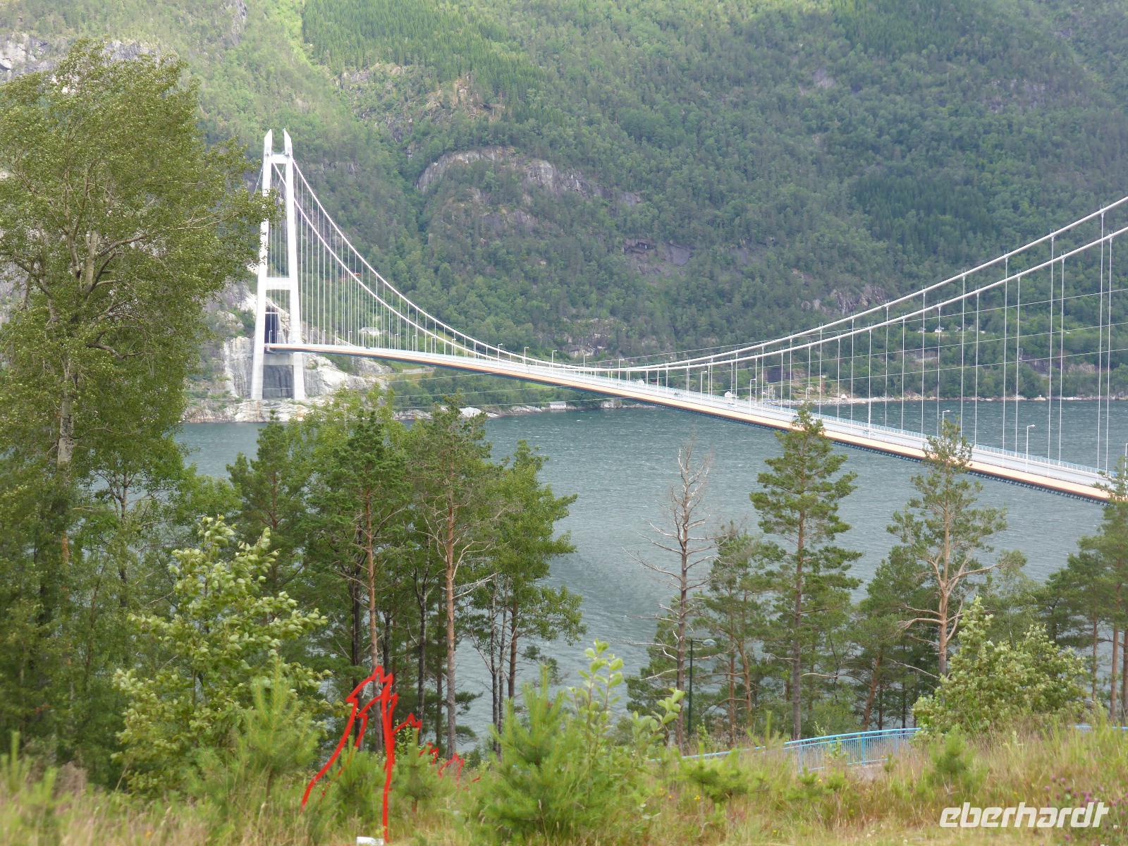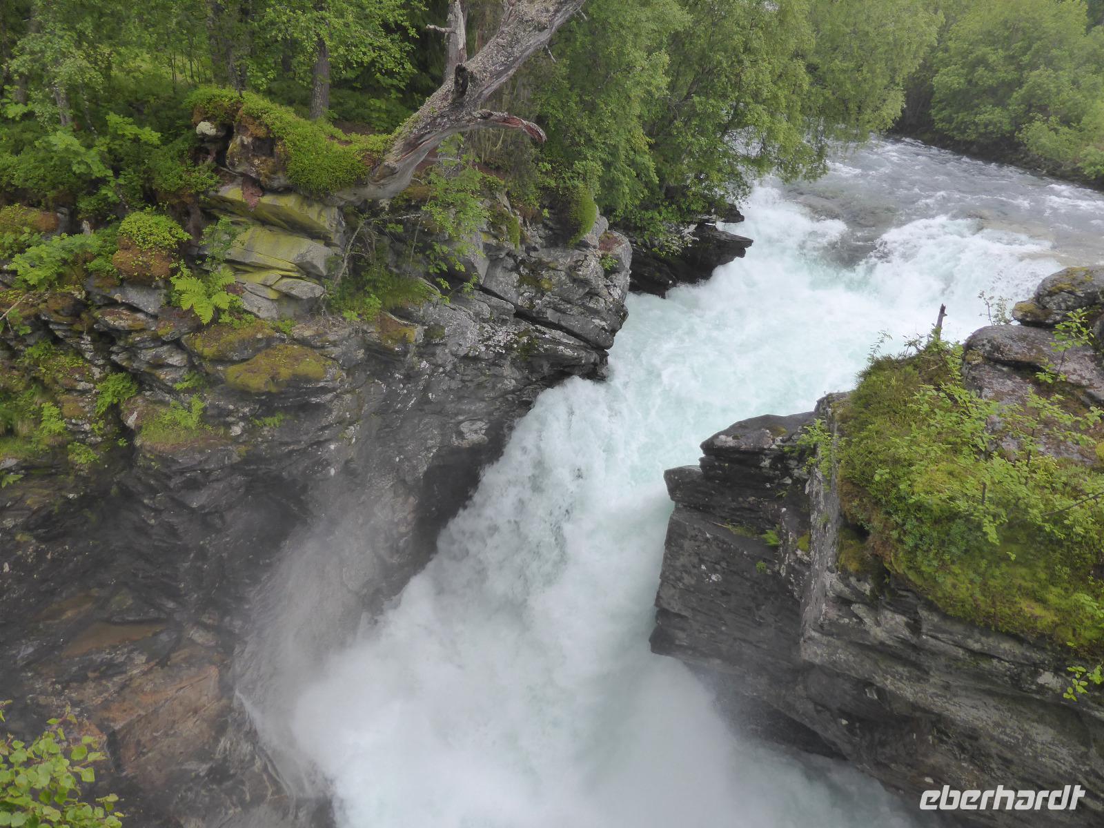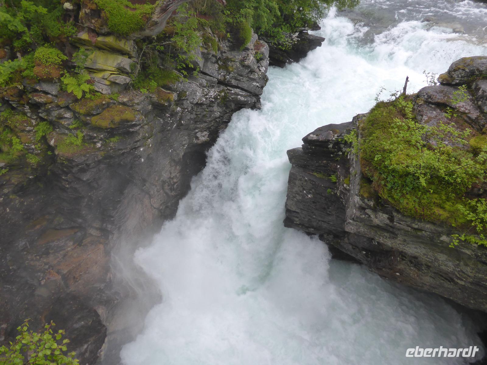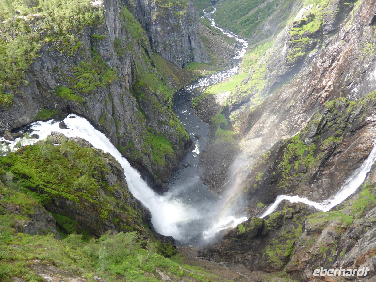 Doch bevor wir diesen Fjord erreichten, legten wir einen Stopp am Steindalsfossen ein. Dieser Wasserfall ist eine Besonderheit, da man hinter dem Wasser entlang gehen kann ohne nass zu werden. Er entstandt 1699 als der Fluss seinen Verlauf änderte. Entlang der schmalen Straßen fuhren wir entlang des malerischen Hardangerfjordes. Die Engstellen meisterte Dieter wieder mit Bravour. Den Hardangerfjord überquerten wir mit der spektakulären Hardangerbrücke, welche 2013 eröffnet wurde. Auf dem Weg zur Hardangervidda, dem „Dach Norwegens" passierten wir im Mabötal den Vöringfossen. Er gehört zu den bekanntesten Wasserfällen Norwegens. Von zwei Standorten aus konnten wir die Kraft des Wassers bewundern. Aus touristischen Gründen wird der Wasserfall in den Sommermonaten zur Energiegewinnung nicht „abgedreht".