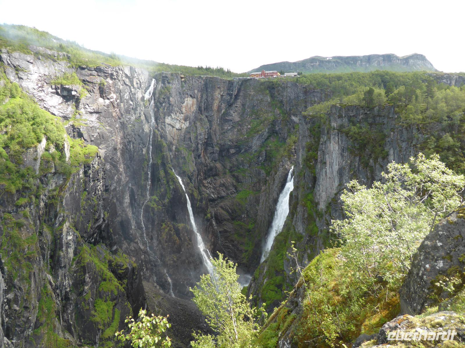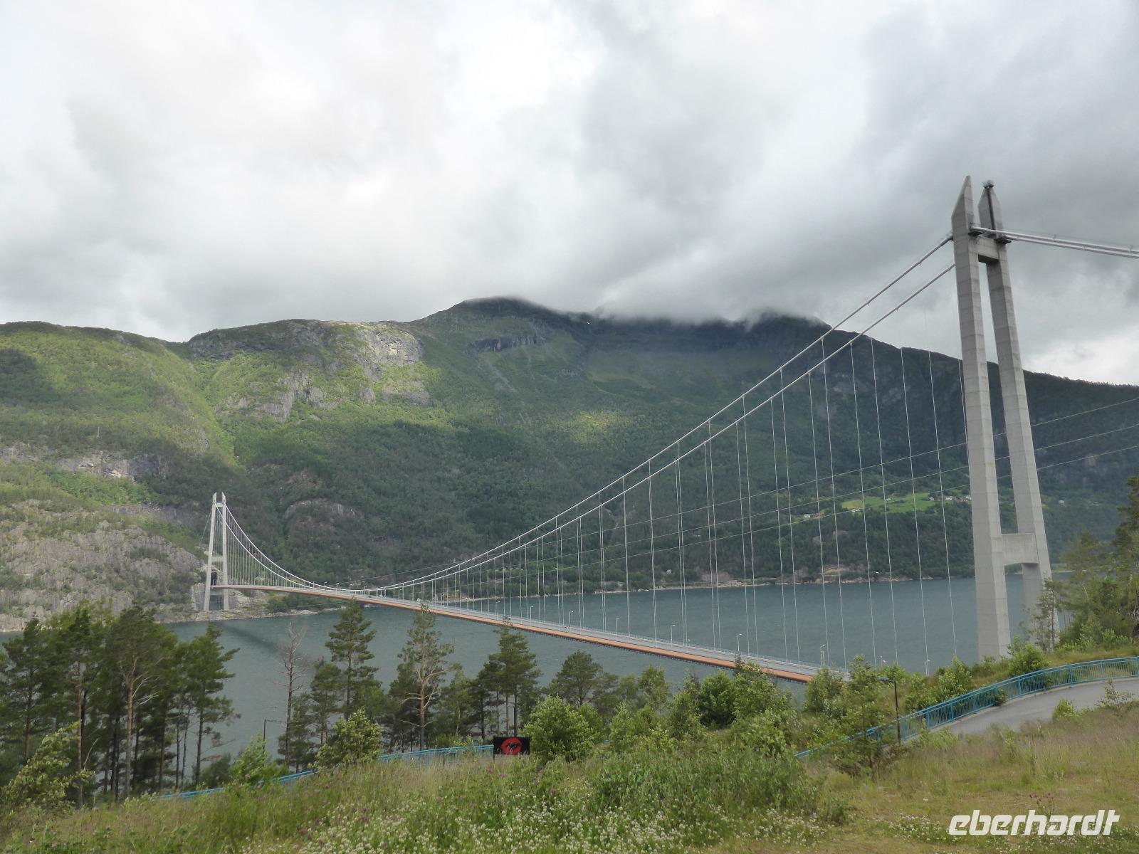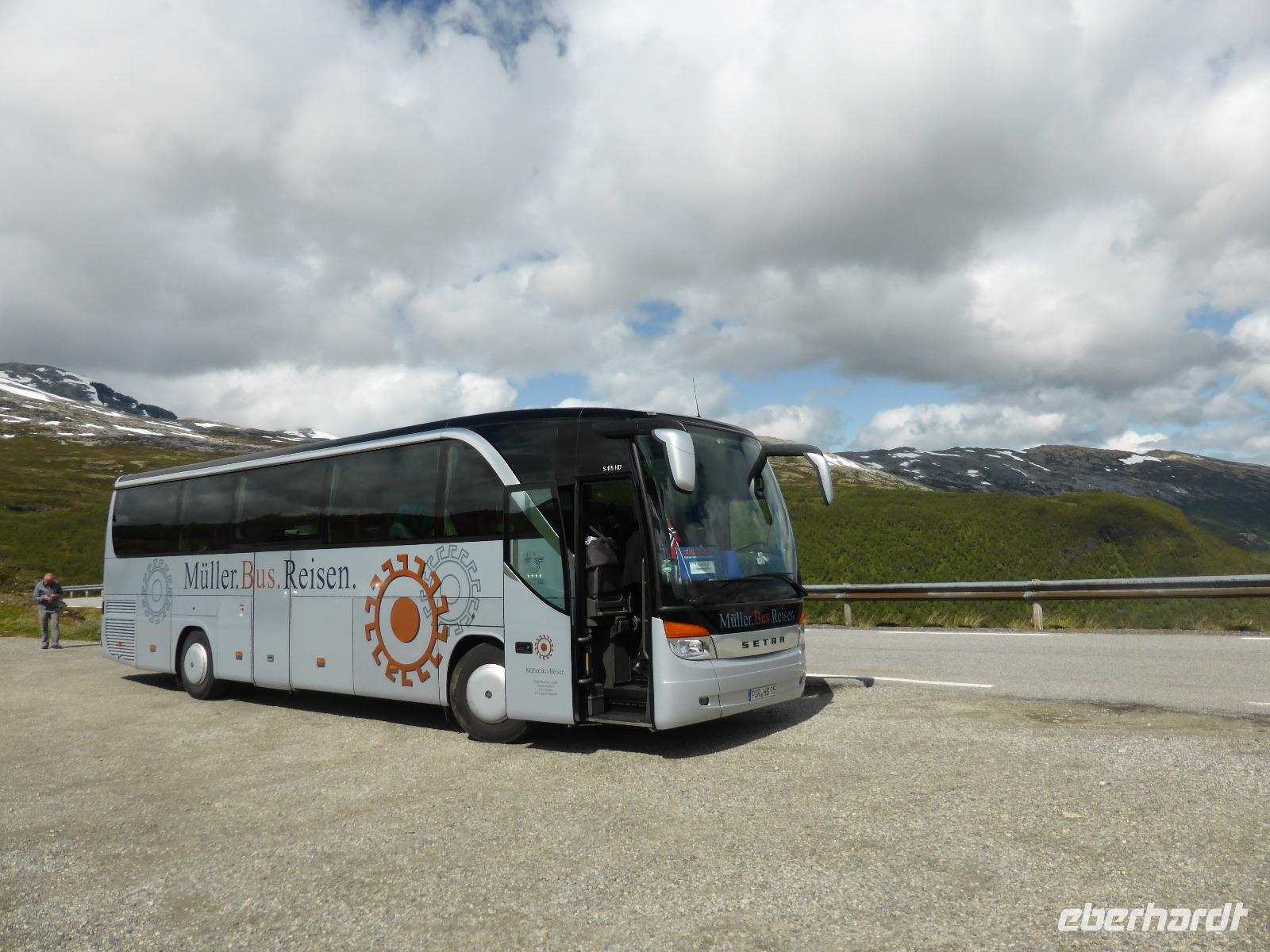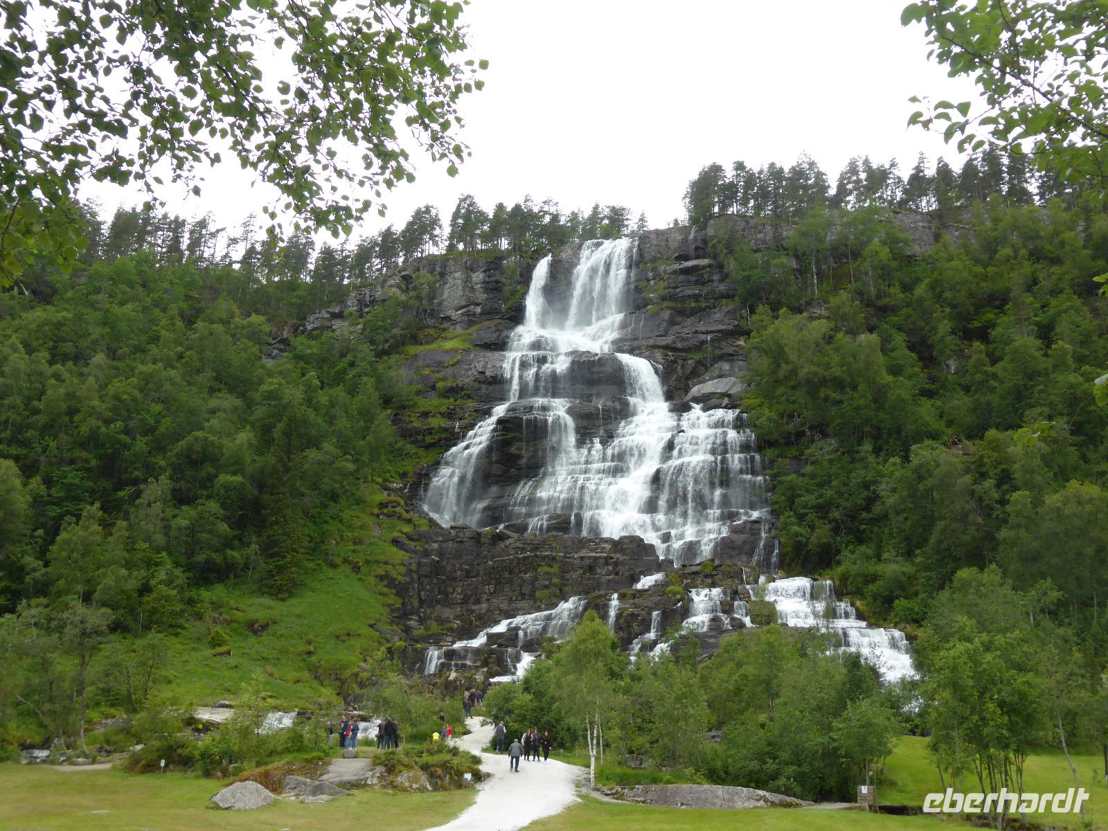 Doch bevor wir diesen Fjord erreichten, legten wir einen Stopp am Steindalsfossen ein. Dieser Wasserfall ist eine Besonderheit, da man hinter dem Wasser entlang gehen kann ohne nass zu werden. Er entstandt 1699 als der Fluss seinen Verlauf änderte. Entlang der schmalen Straßen fuhren wir entlang des malerischen Hardangerfjordes. Die Engstellen meisterte Dieter wieder mit Bravour. Den Hardangerfjord überquerten wir mit der spektakulären Hardangerbrücke, welche 2013 eröffnet wurde. Auf dem Weg zur Hardangervidda, dem „Dach Norwegens" passierten wir im Mabötal den Vöringfossen. Er gehört zu den bekanntesten Wasserfällen Norwegens. Von zwei Standorten aus konnten wir die Kraft des Wassers bewundern. Aus touristischen Gründen wird der Wasserfall in den Sommermonaten zur Energiegewinnung nicht „abgedreht".