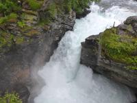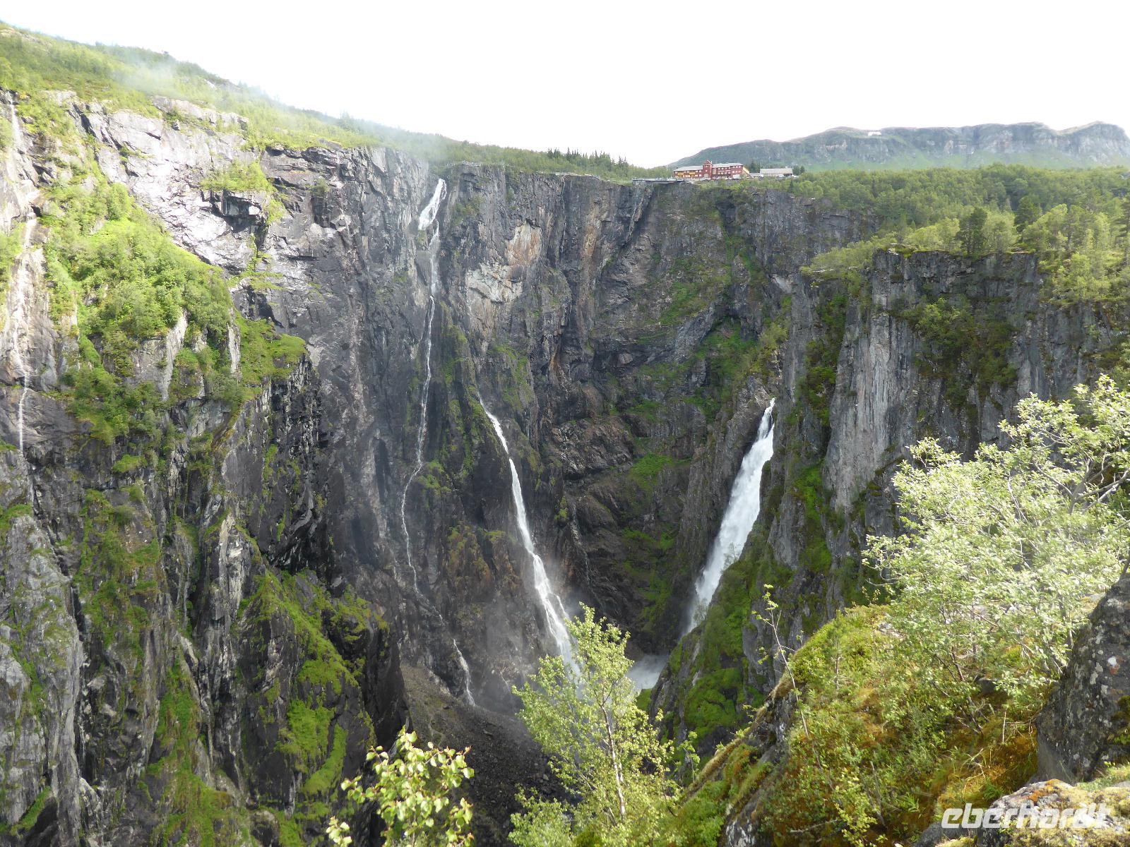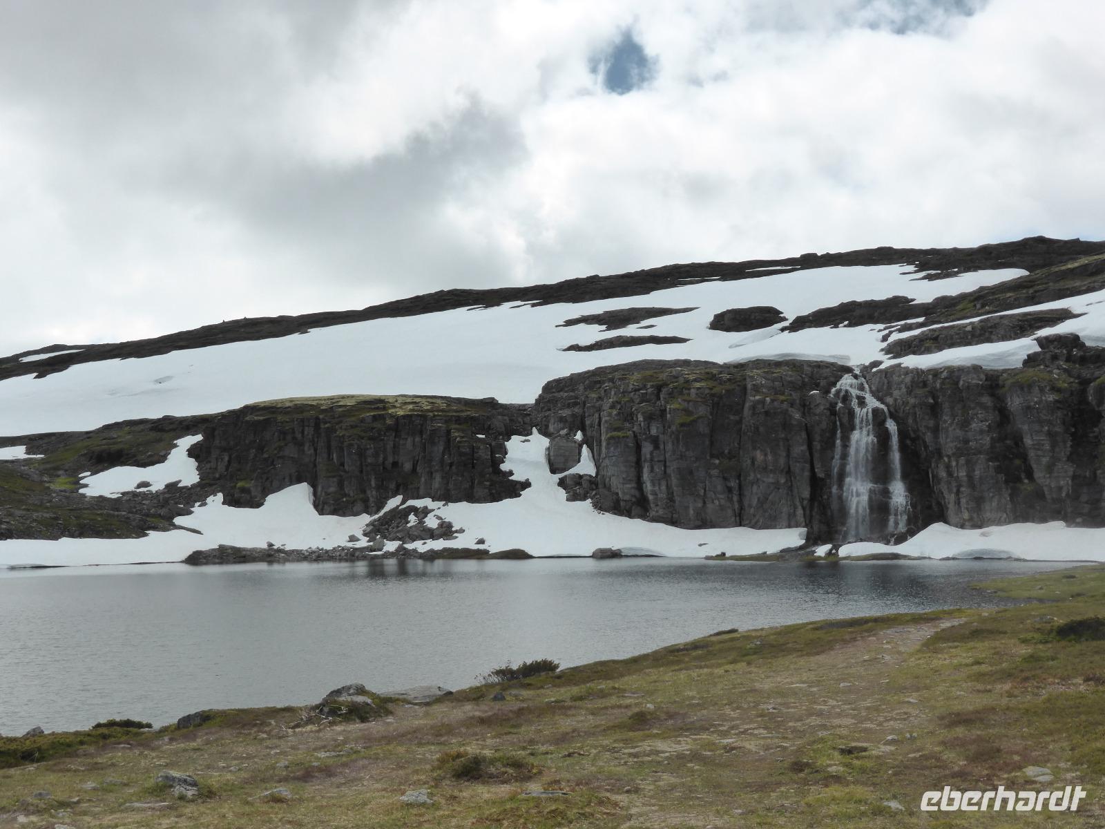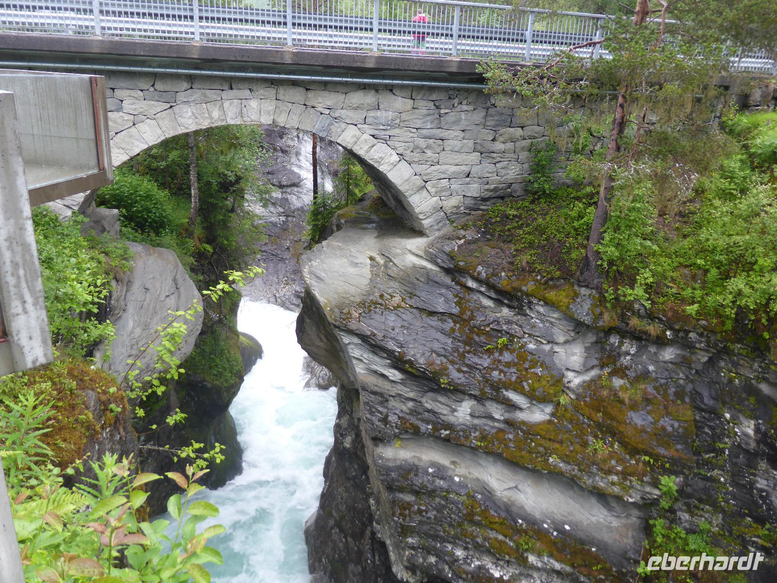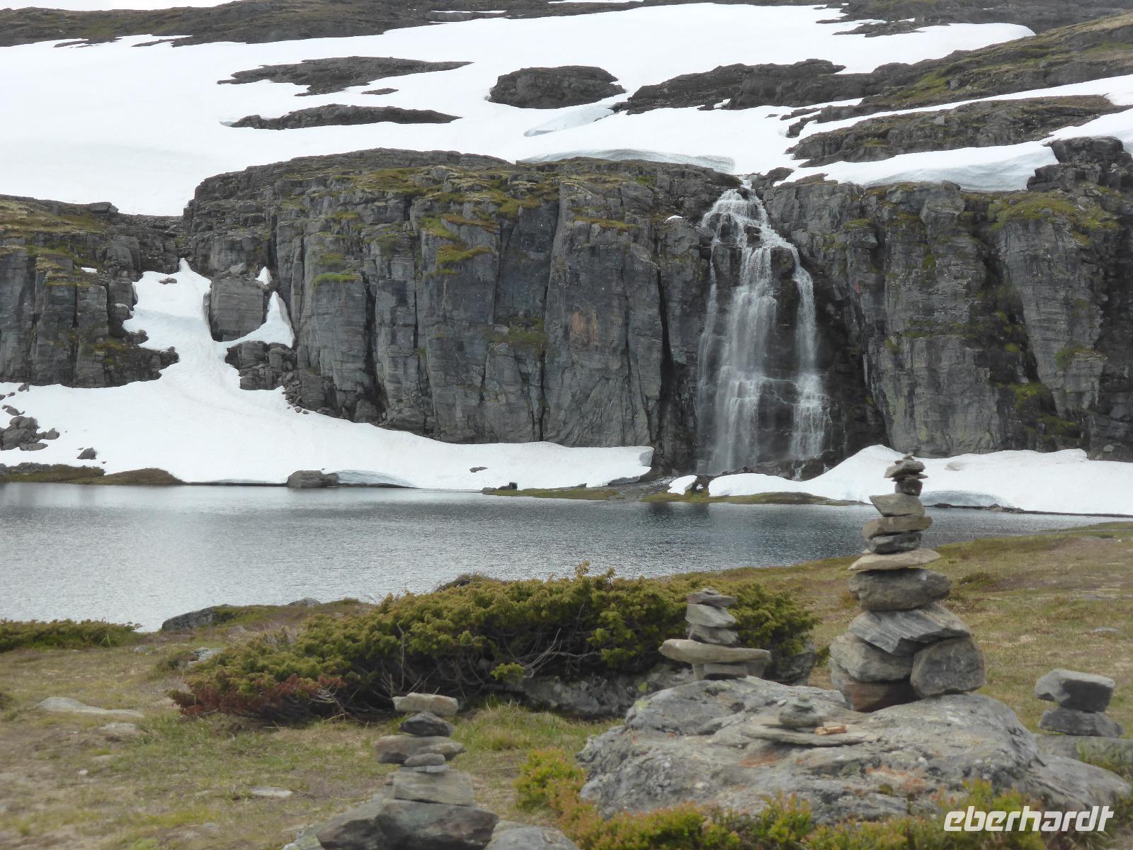 Doch bevor wir diesen Fjord erreichten, legten wir einen Stopp am Steindalsfossen ein. Dieser Wasserfall ist eine Besonderheit, da man hinter dem Wasser entlang gehen kann ohne nass zu werden. Er entstandt 1699 als der Fluss seinen Verlauf änderte. Entlang der schmalen Straßen fuhren wir entlang des malerischen Hardangerfjordes. Die Engstellen meisterte Dieter wieder mit Bravour. Den Hardangerfjord überquerten wir mit der spektakulären Hardangerbrücke, welche 2013 eröffnet wurde. Auf dem Weg zur Hardangervidda, dem „Dach Norwegens" passierten wir im Mabötal den Vöringfossen. Er gehört zu den bekanntesten Wasserfällen Norwegens. Von zwei Standorten aus konnten wir die Kraft des Wassers bewundern. Aus touristischen Gründen wird der Wasserfall in den Sommermonaten zur Energiegewinnung nicht „abgedreht".