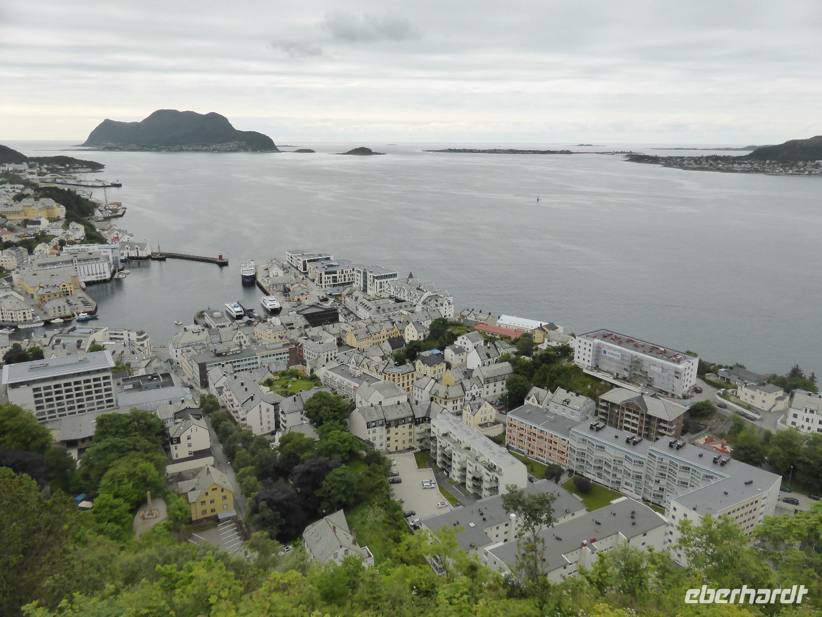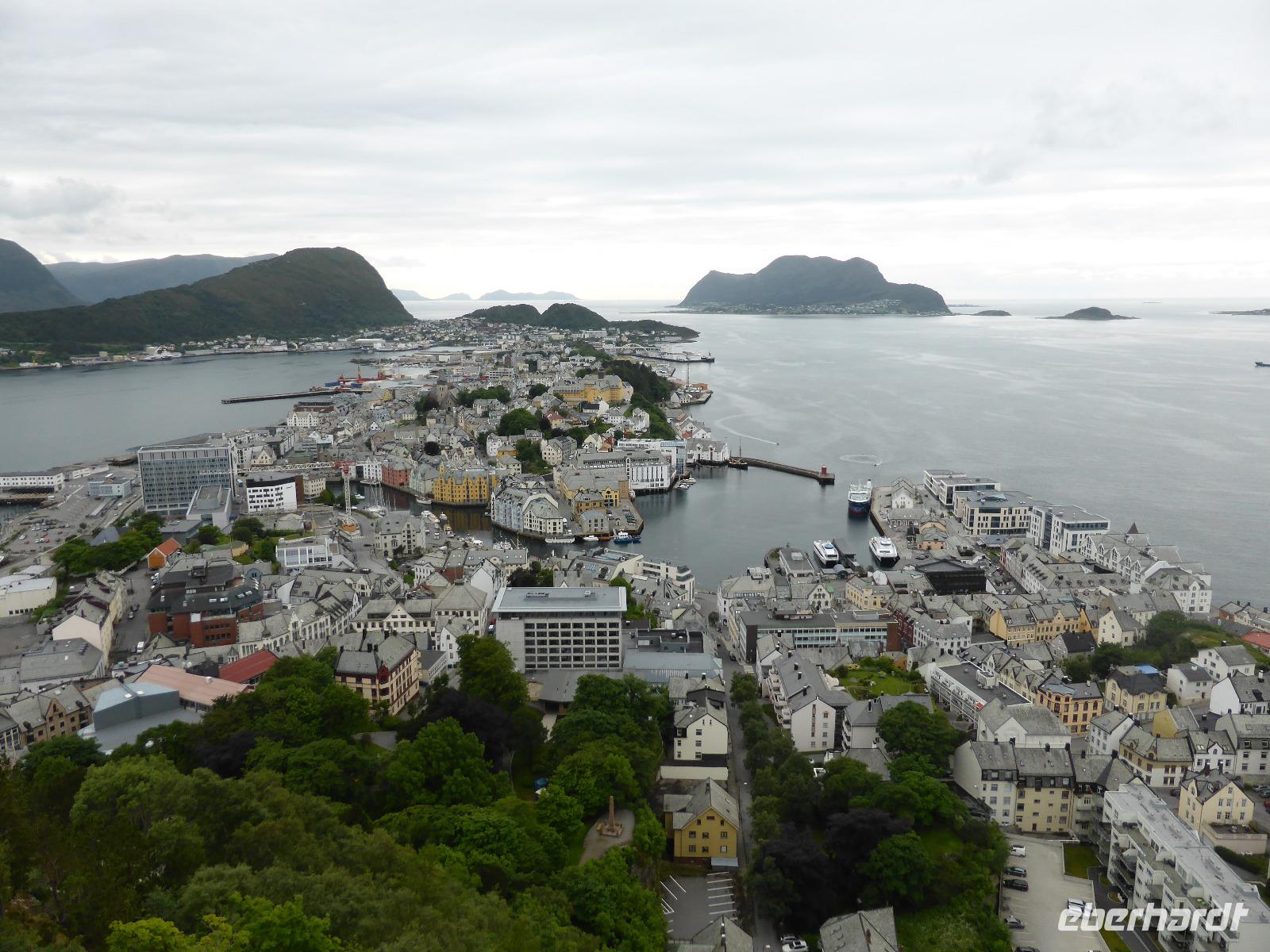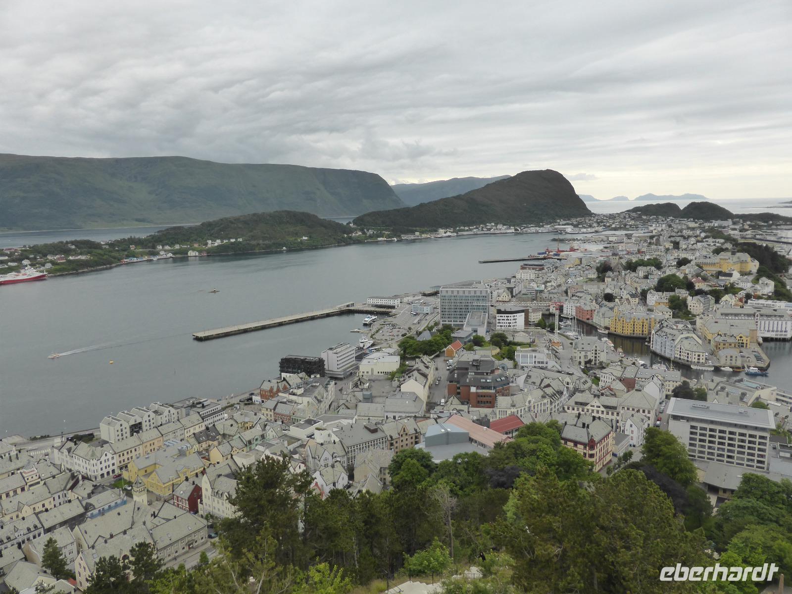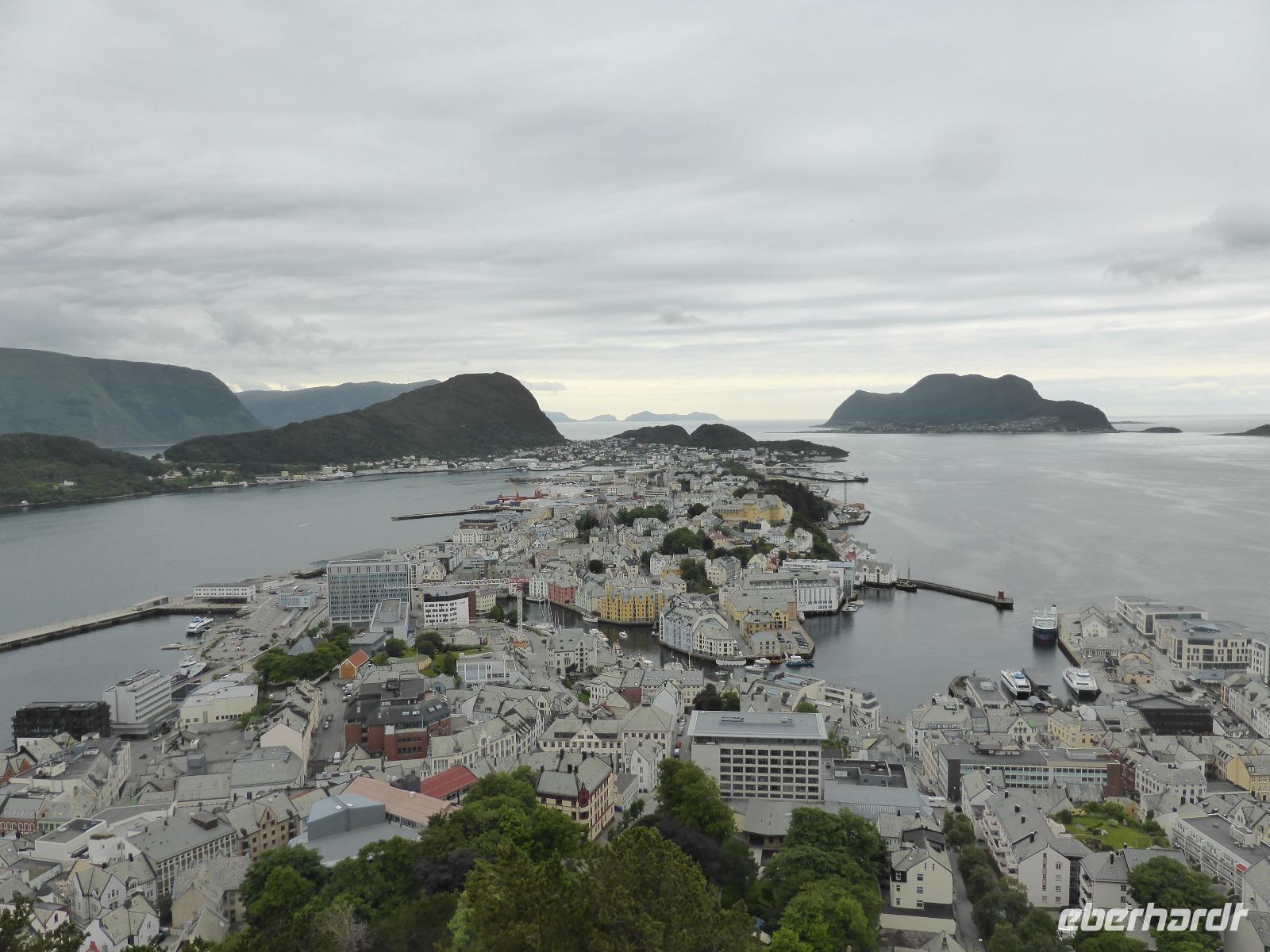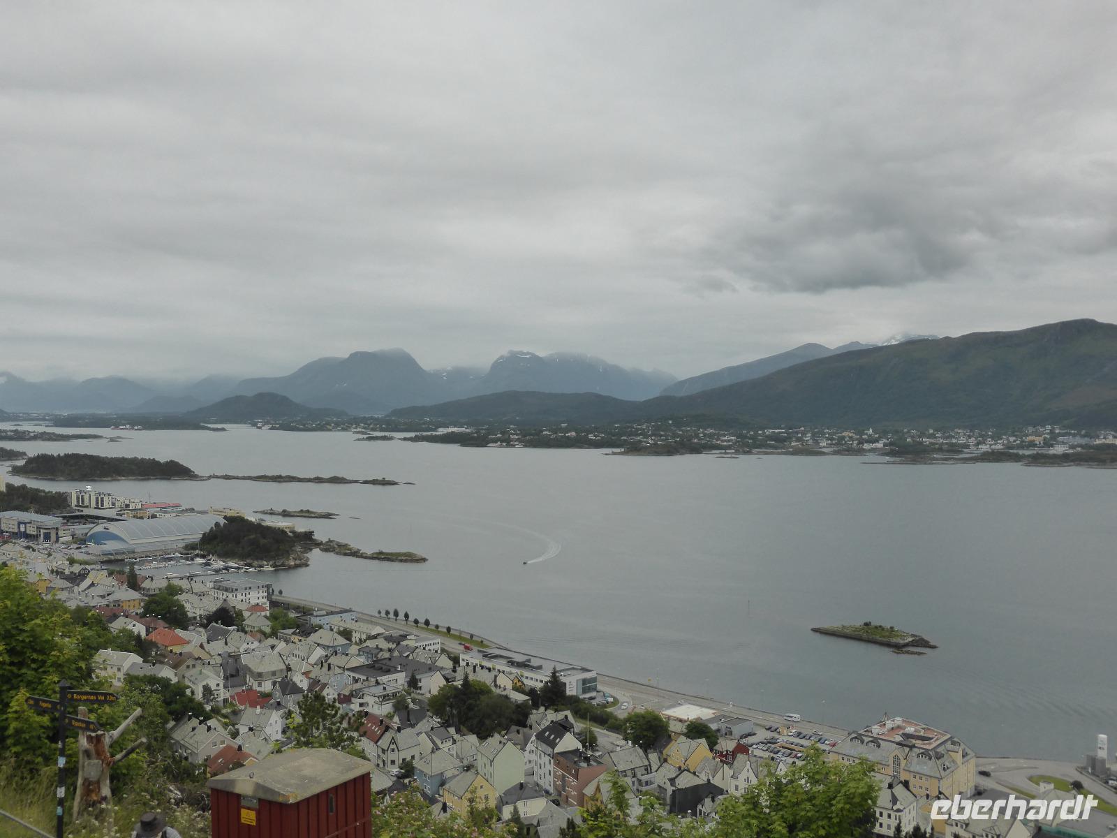 Am Gudbrandsjuvet (20 m tiefe und 5 m breite Schlucht) legten wir einen weiteren Stopp ein, bevor es ins Erdbeertal Valldal ging. Valldall bzw. Sylte ist das nördlichste kommerzielle Obstanbaugebiet. Entlang des Storfjordes erreichten wir Alesund. Die Wolken waren nicht mehr ganz so dicht, sodass wir die Auffahrt auf den Aussichtspunkt Aksla von Alesund wagten. Wir wurden mit einer wunderbaren Sicht auf die Jugendstilstadt belohnt und für den Varden entschädigt.