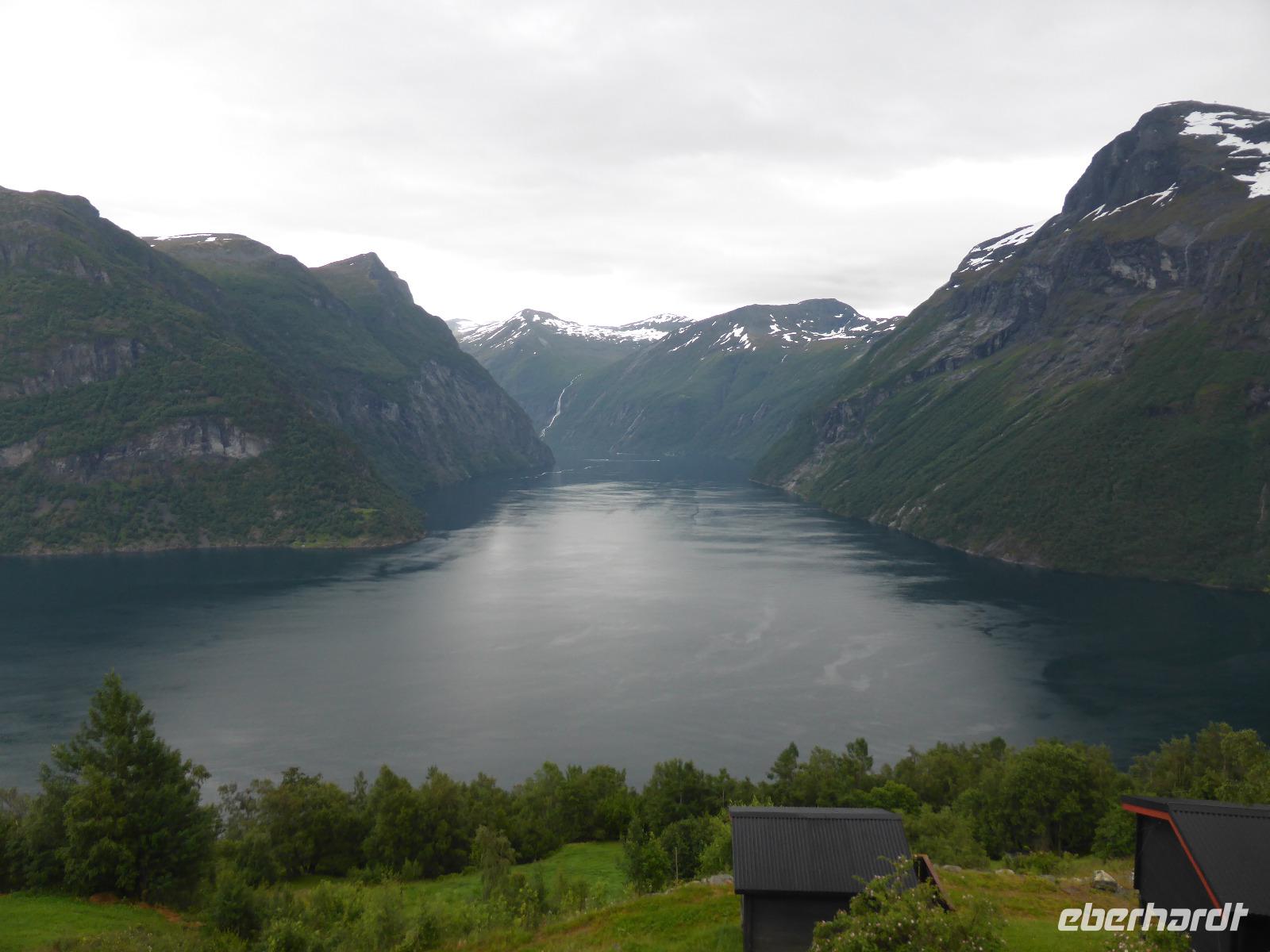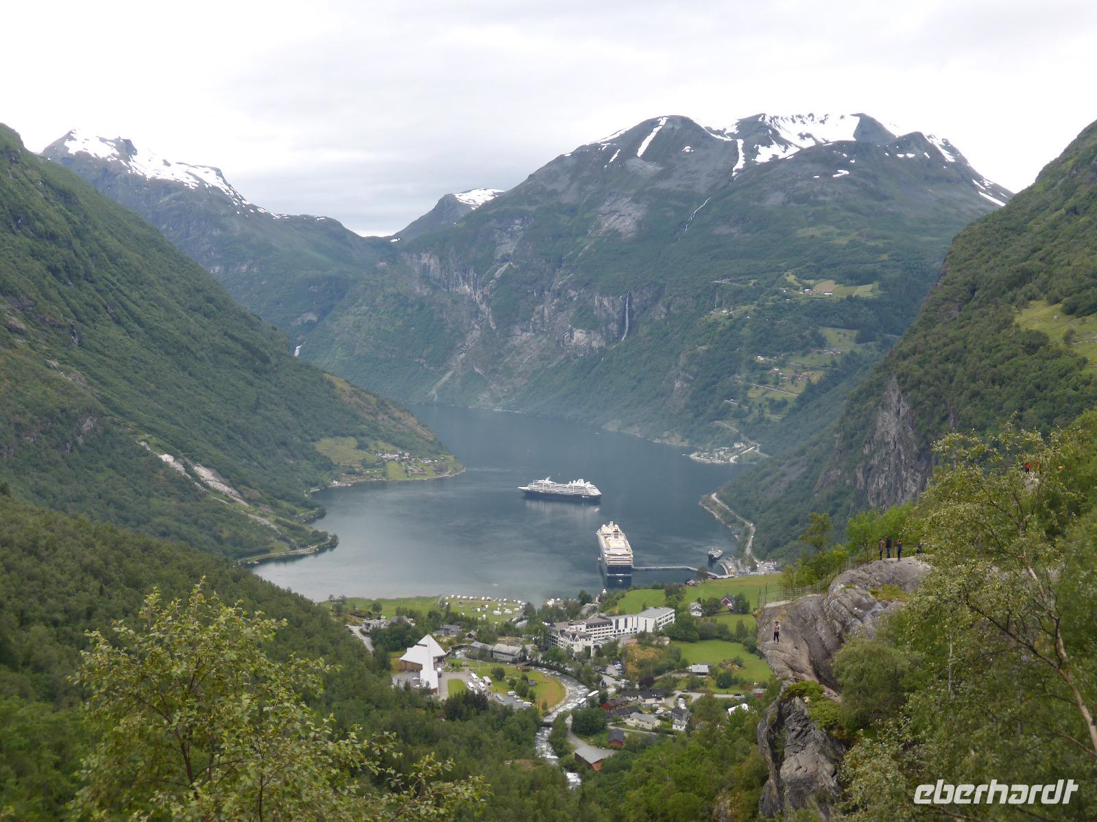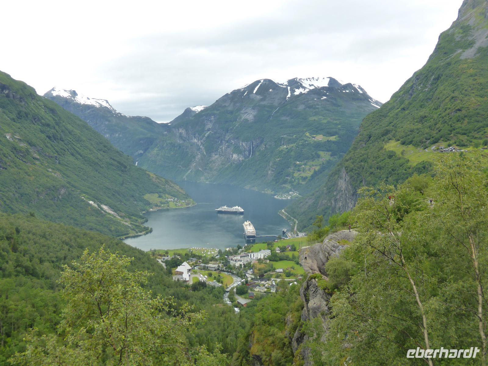 Angekommen in Geiranger lag wieder eine beeindruckende Fahrtstrecke vor uns. Innerhalb von 17 km musste Dieter einen Höhenunterschied von 1500 m in zahlreichen Kurven überwinden. Vom Flydal genossen wir den bekanntesten Blick auf den Geirangerfjord. Mit dem Kreuzfahrtschiff hatte dies noch einen besonderen Reiz. Eine Überraschung war die Fahrt auf den Dalsnibba. Dieser Punkt ist der höchste Aussichtspunkt Norwegens, welcher mit einem Fahrzeug zu erreichen ist. Bevor es wieder zuzog, genossen wir das atemberaubende Panorama.