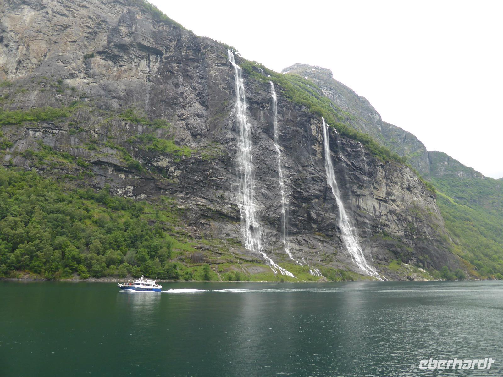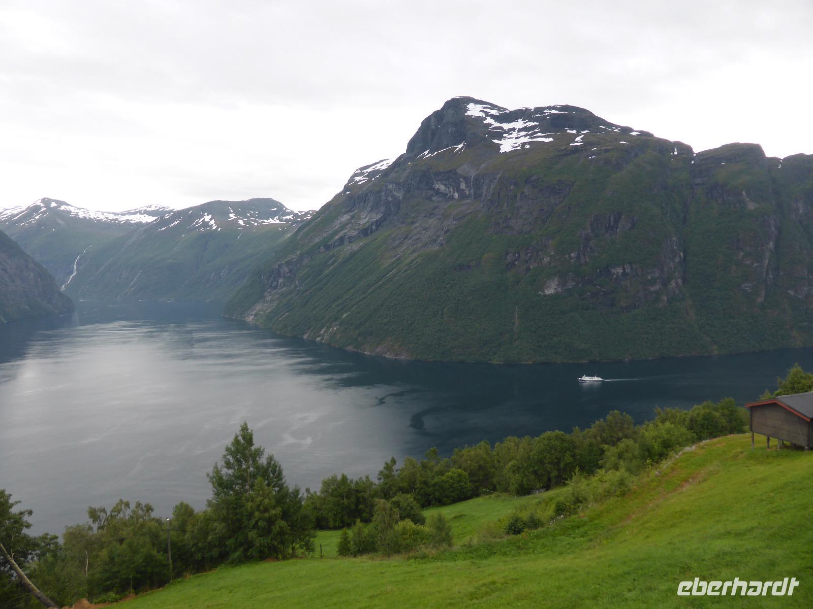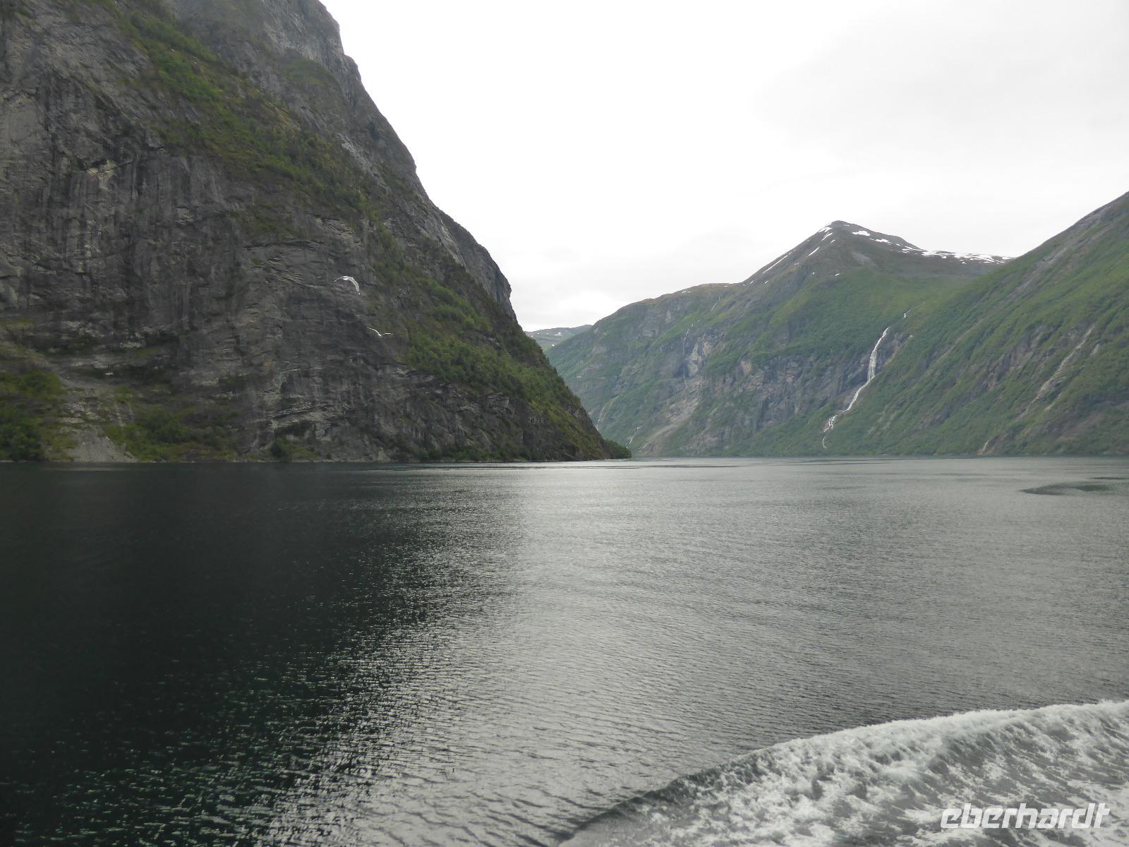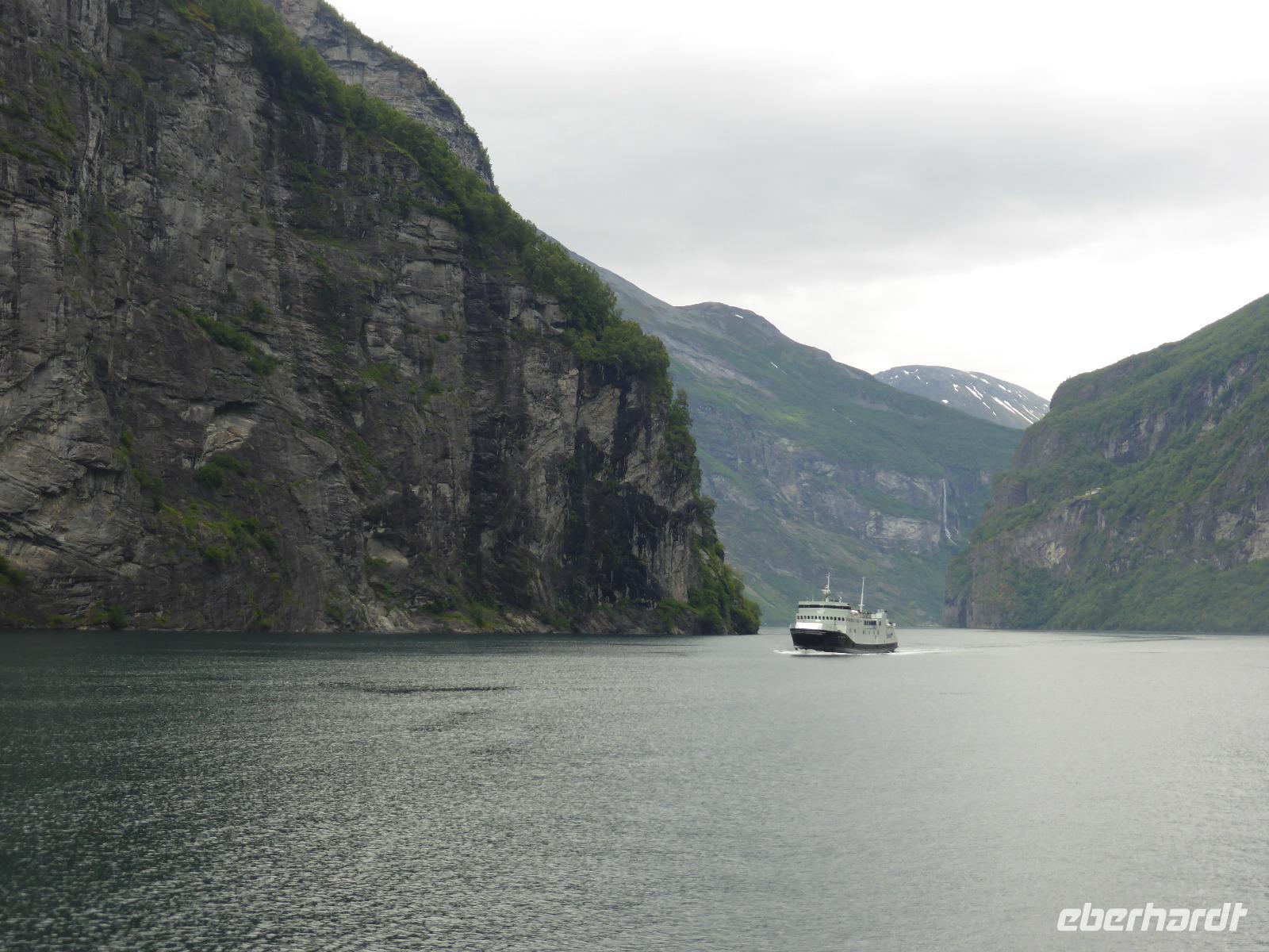 Am Morgen starteten wir zur Fährüberfahrt von Magerholm nach Sykkylven. Auf dem Weg nach Hellesylt konnten wir schon einen schönen Blick in den Geirangerfjord genießen. Pünktlich um 11:00 Uhr legte unsere Fähre für die einstündige Fahrt durch den berühmten Geirangerfjord ab. Diese Fjordfahrt gehört zu den schönsten Naturerlebnissen Norwegens. Während der Fahrt durch den 20 km langen, S-förmigen Geirangerfjord erblickten wir die Wasserfälle „Brautschleier", „Sieben Schwestern" und der „Freier" sowie die verlassenen Fjordhöfe. Früher ließen sich die Menschen an diesen Fjordhöfen wegen des fruchtbaren Bodens nieder.