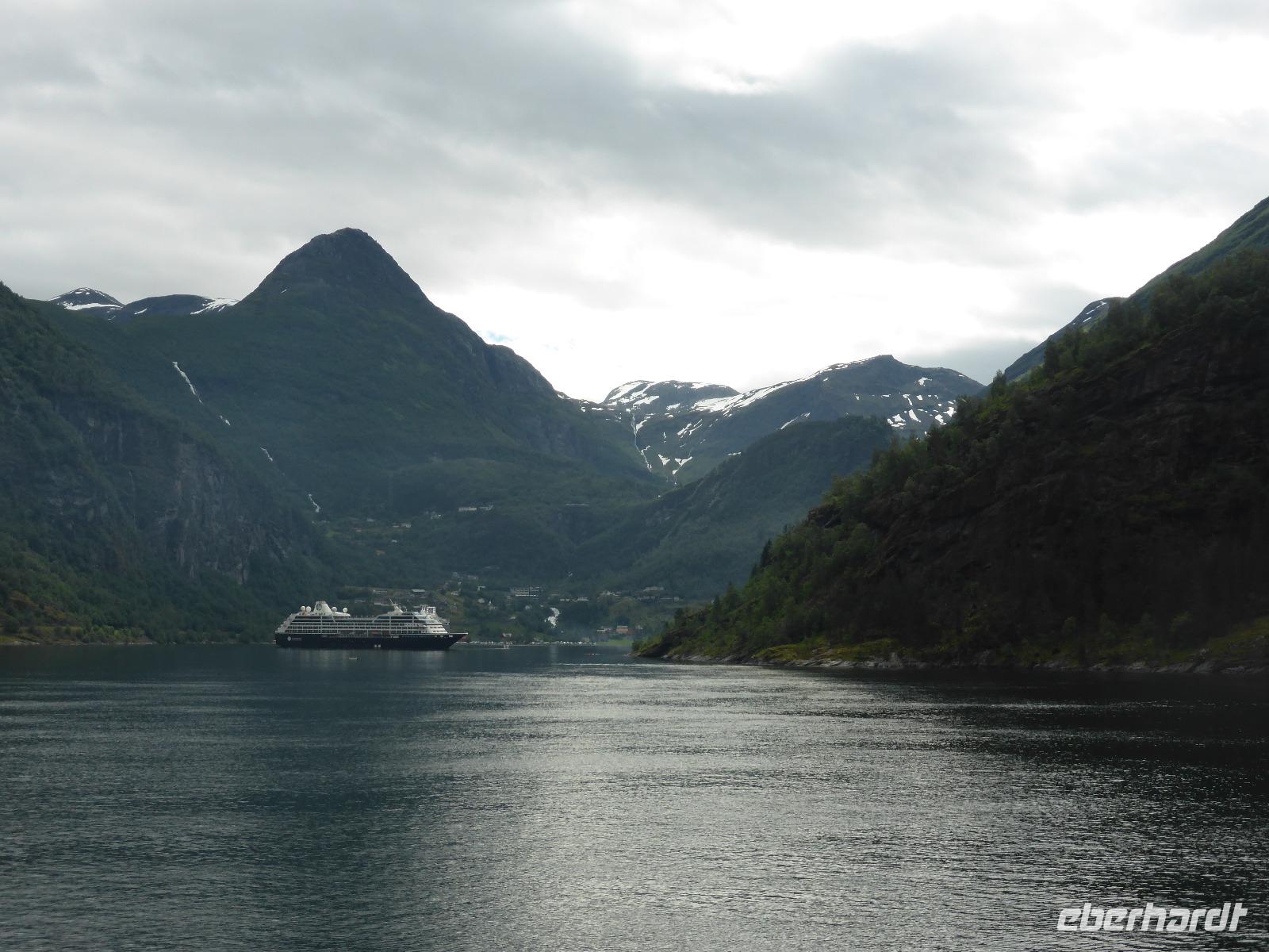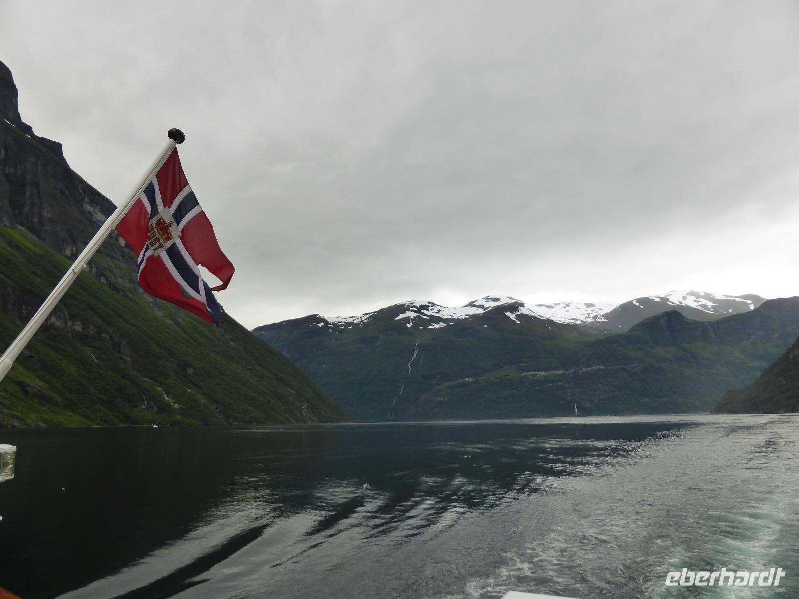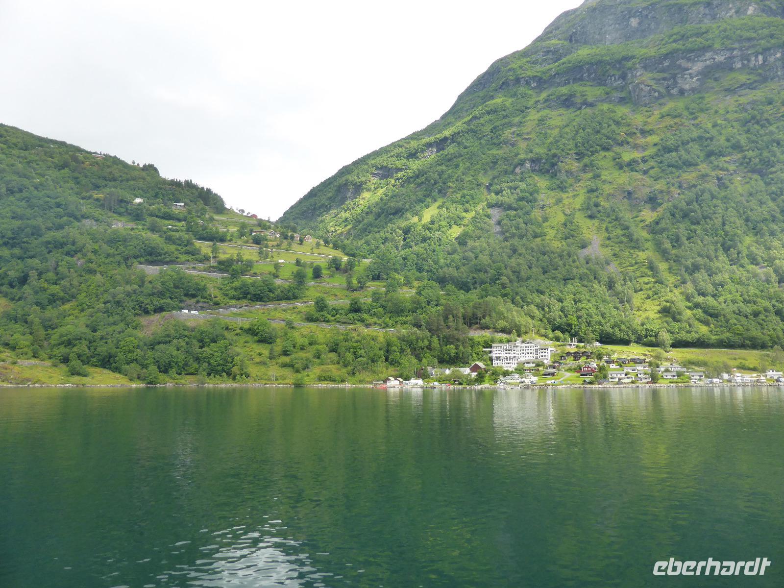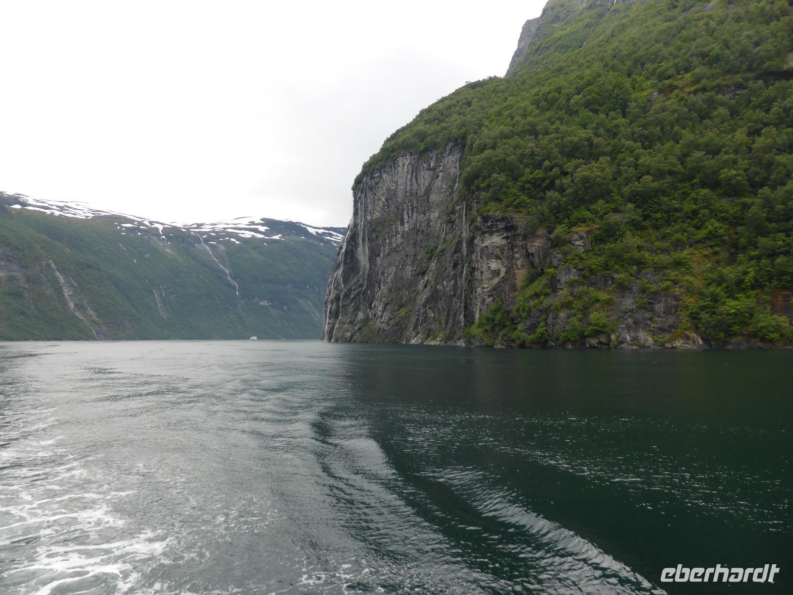 Am Morgen starteten wir zur Fährüberfahrt von Magerholm nach Sykkylven. Auf dem Weg nach Hellesylt konnten wir schon einen schönen Blick in den Geirangerfjord genießen. Pünktlich um 11:00 Uhr legte unsere Fähre für die einstündige Fahrt durch den berühmten Geirangerfjord ab. Diese Fjordfahrt gehört zu den schönsten Naturerlebnissen Norwegens. Während der Fahrt durch den 20 km langen, S-förmigen Geirangerfjord erblickten wir die Wasserfälle „Brautschleier", „Sieben Schwestern" und der „Freier" sowie die verlassenen Fjordhöfe. Früher ließen sich die Menschen an diesen Fjordhöfen wegen des fruchtbaren Bodens nieder.