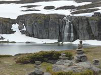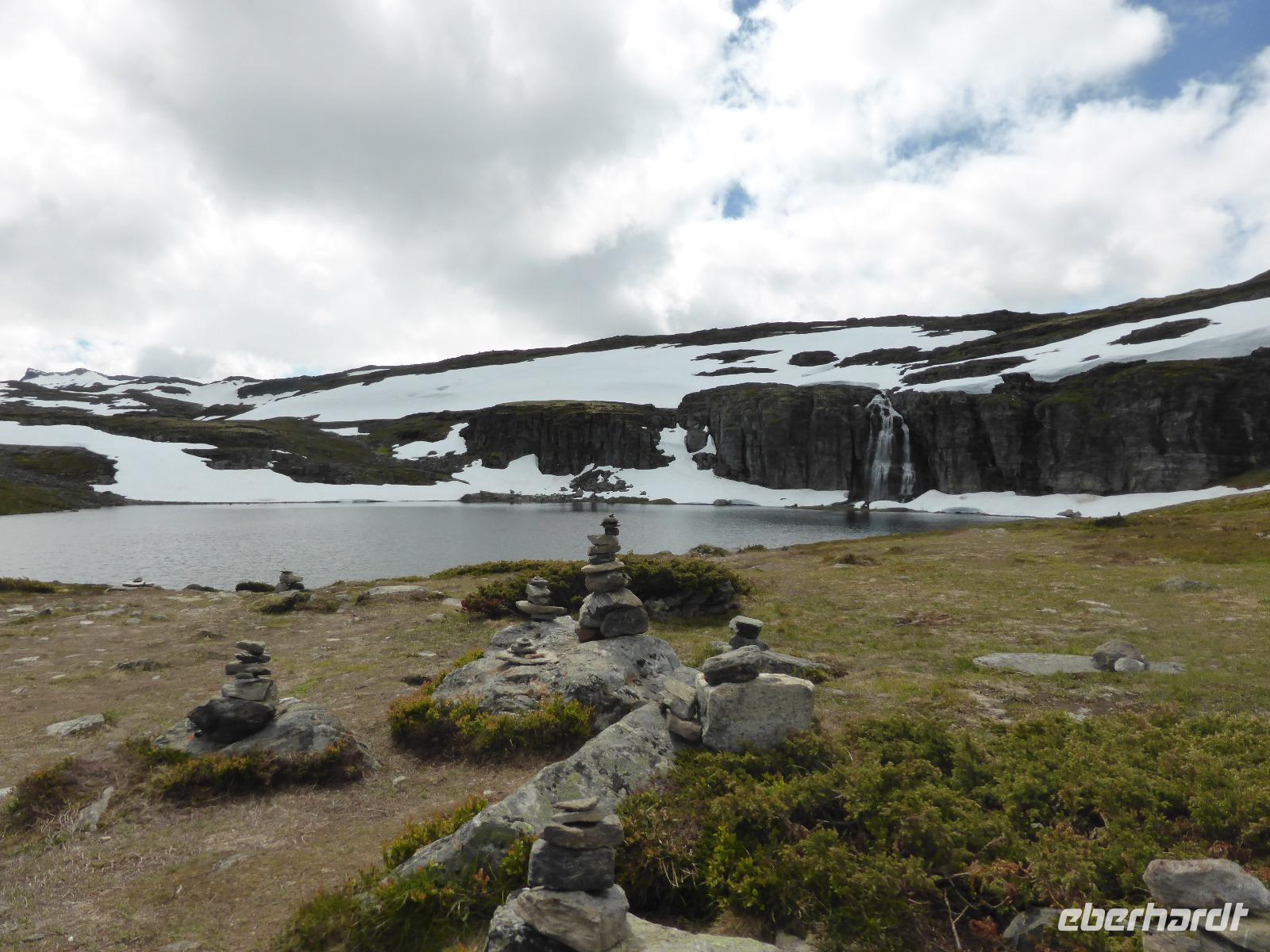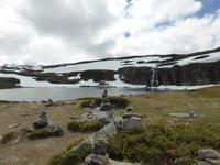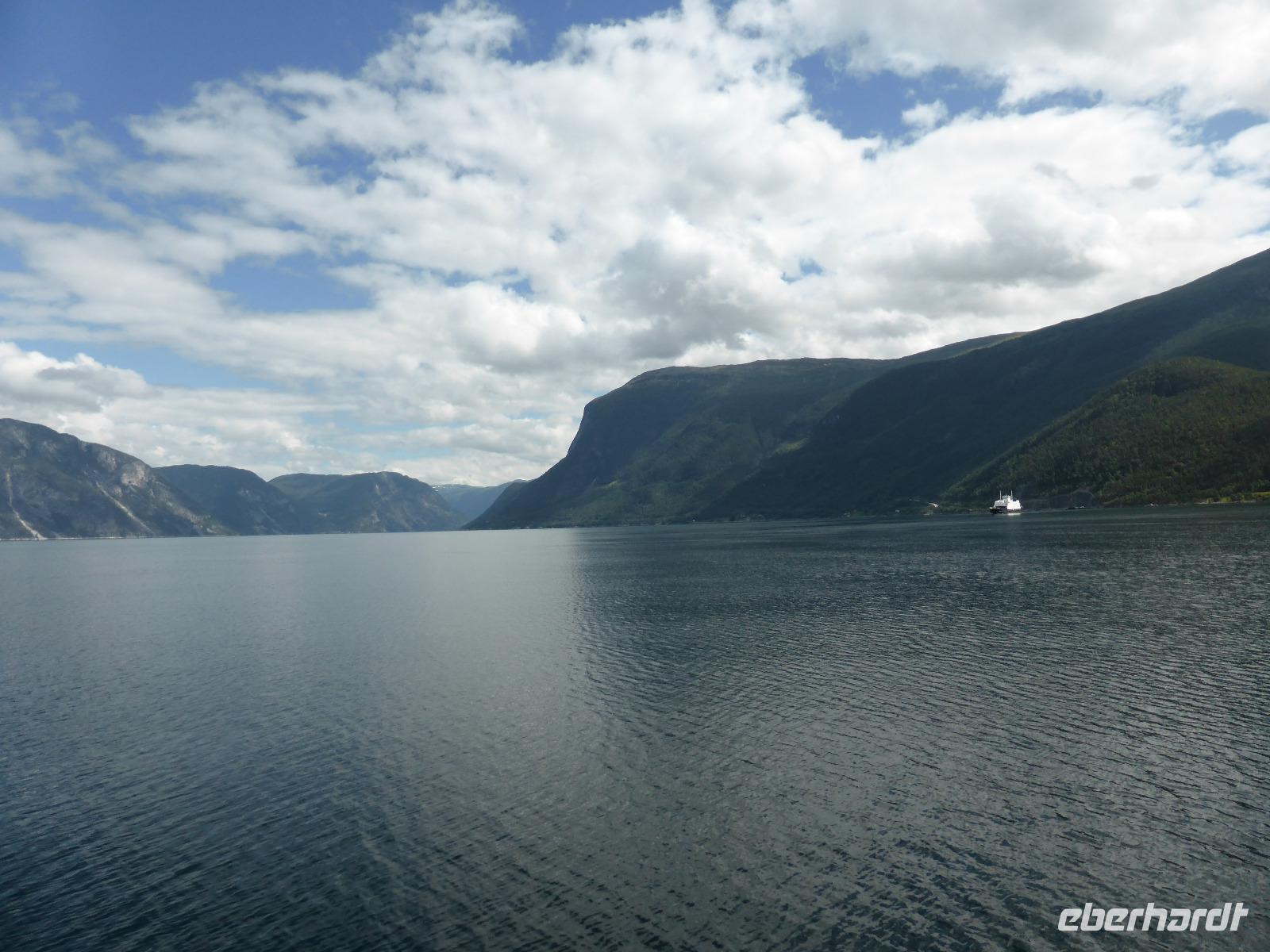 Die Sognefjellstrasse führt zwischen den höchsten Gipfeln des Jotunheimen Nationalparkes im Osten und den ausgedehntesten Gletscherfeldern Europas im Westen hindurch. Dabei überwindet sie den höchsten Straßenpass Norwegens. Der Fantasteinen (Landstreicherstein) stellt die höchste Stelle bei 1434 m dar. Mit verschiedenen Fotostopps erreichten wir dann den Sognefjord, welcher als „König der Fjorde" bezeichnet wird. Er ist 206 km lang und misst an seiner tiefsten Stelle gut 1300 m. Über einen Teilarm setzten wir mit der Fähre von Manheller nach Fodnes über. Im Anschluss wurde es noch spektakulärer - die Schneestrasse. Diese Straße wurde 1967 fertig gestellt und sucht seinesgleichen in Norwegen. Den Höhenunterschied von 1309 m überwand Dieter wieder mit Bravour. Diese Straße war wirklich eine Herausforderung an seine Fahrkünste. An den Parkplätzen Vedehaugane (endlose Bank mit Mülldenkmal) und Flotane konnten wir die funkelnden Gletschermassen sowie die atemberaubende Hochgebirgslandschaft bewundern. Unser Ziel war der Aussichtspunkt Stegasteinen. Diese 30 m lange Aussichtsplattform bot uns einen wunderschönen Blick auf den 650 m tiefer gelegenden Aurlandfjord (Arm des Sognefjordes). Dann folgten auf 5 Kilometer 12 enge Serpentinen sowie eine schmale Straße. Für Unterhaltung sorgten die Rückwärtsfahrkünste einiger Autofahrer.