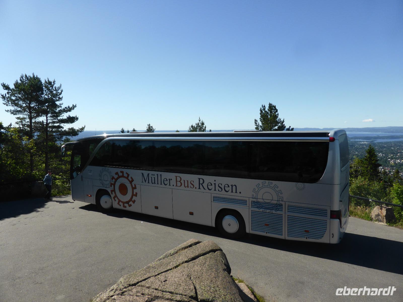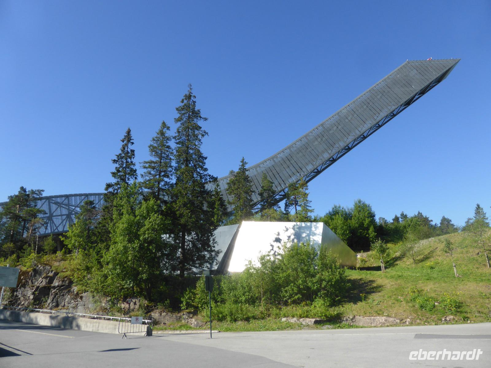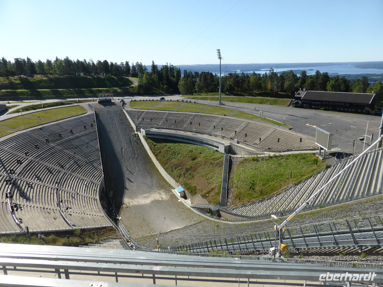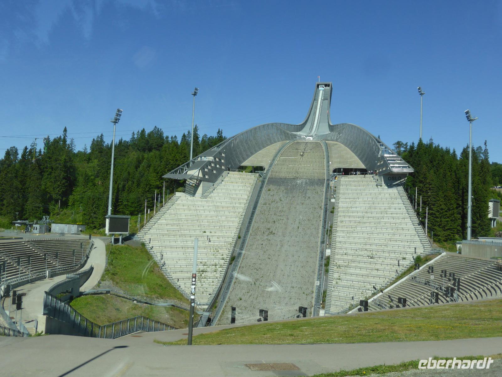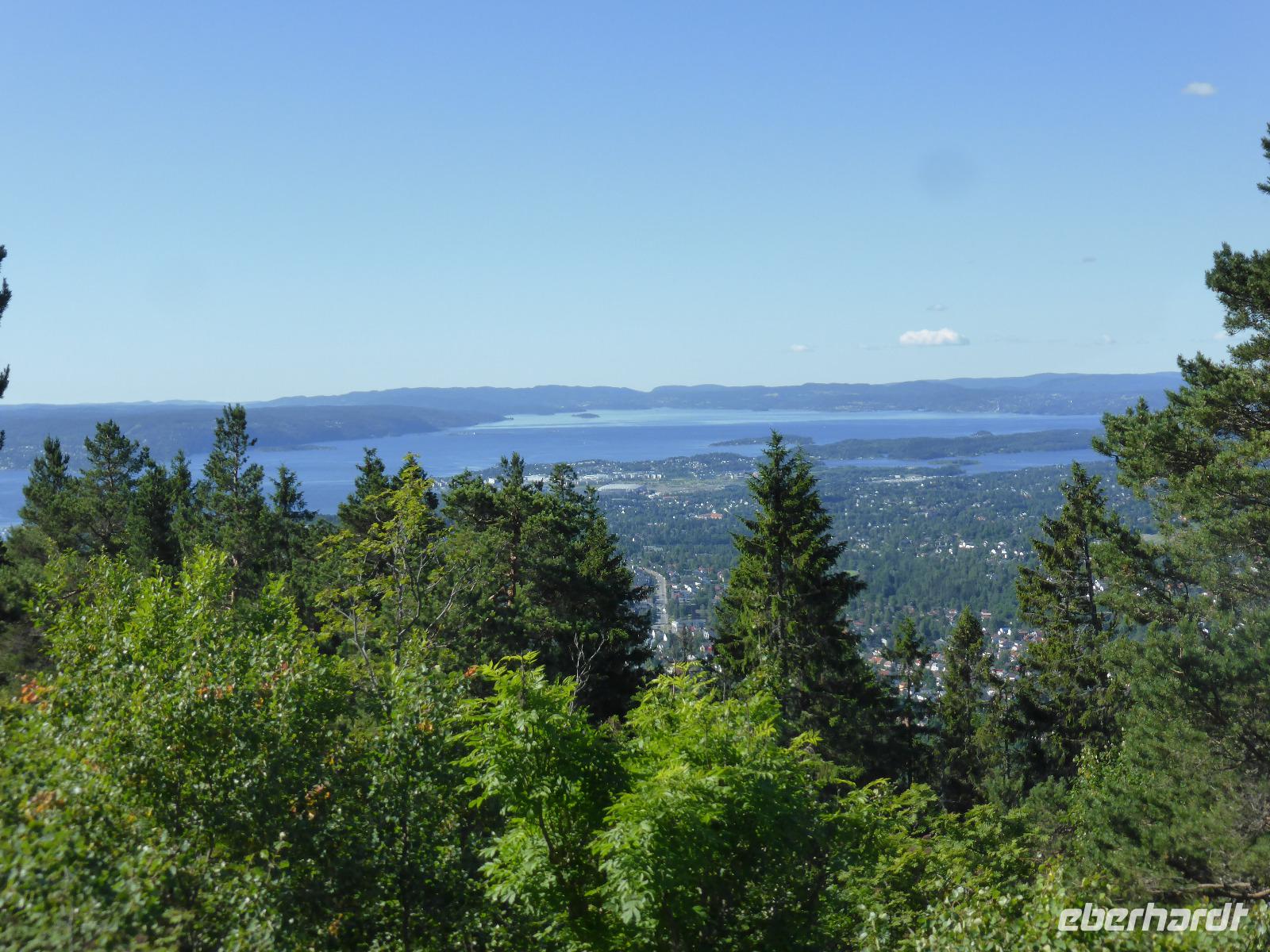 Bei strahlendem Sonnenschein erreichten wir die Sprungschanze auf dem Holmenkollen in Oslo. Bei diesem Blick auf den Oslofjord fiel der Abschied von Norwegen immer schwerer. Vom Kragstötten auf dem Voksenkollen hatten wir nochmals einen phantastischen Blick auf den westlichen und südlichen Oslofjord. Dieser Aussichtspunkt ist nach Hans Krag, dem Straßenbaumeister der Holmen- und Voksenkollenstraße benannt.