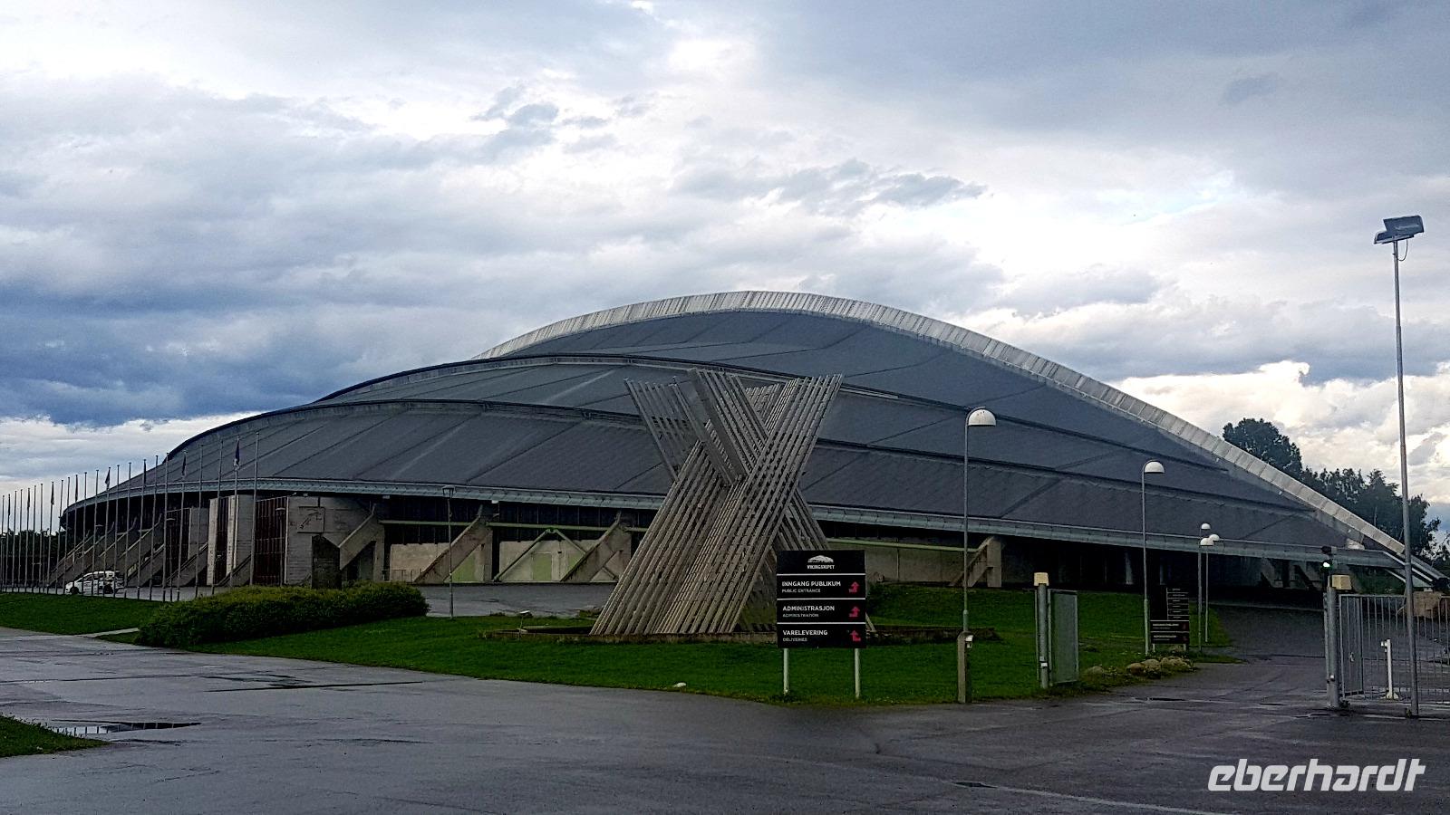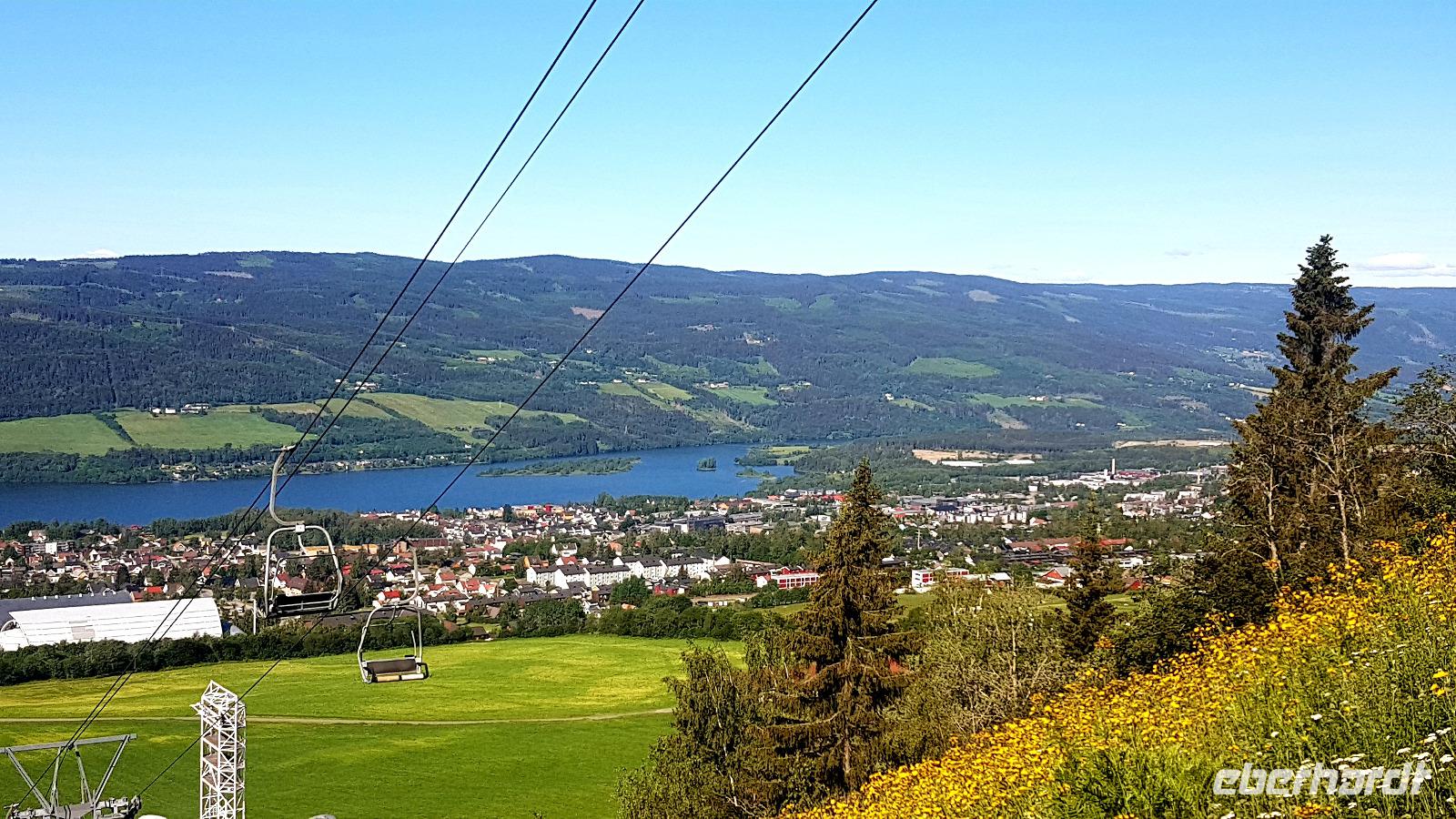 Es geht zur Europastraße 6 zurück und entlang des größten Binnensees Norwegens, dem Mjøsasee. Bei einem Fotostopp am See können wir schon einen Blick voraus auf Lillehammer und die oberhalb davon liegenden Olympischen Schanzenanlagen werfen.