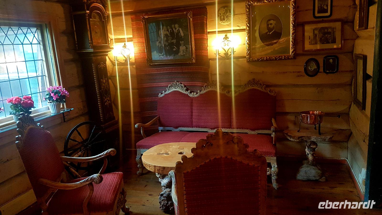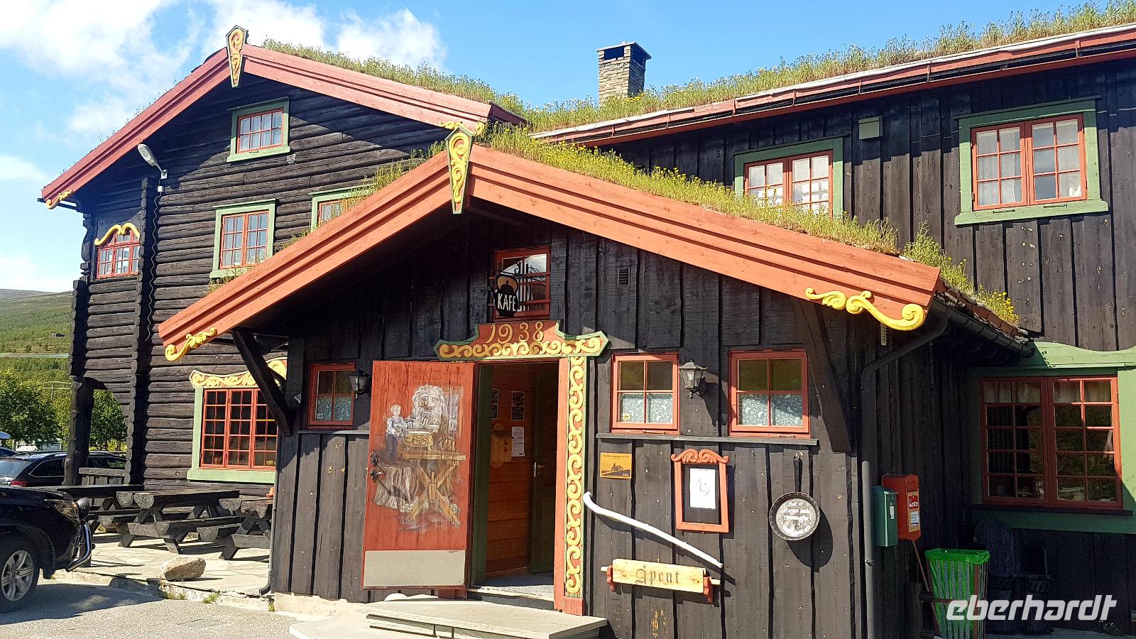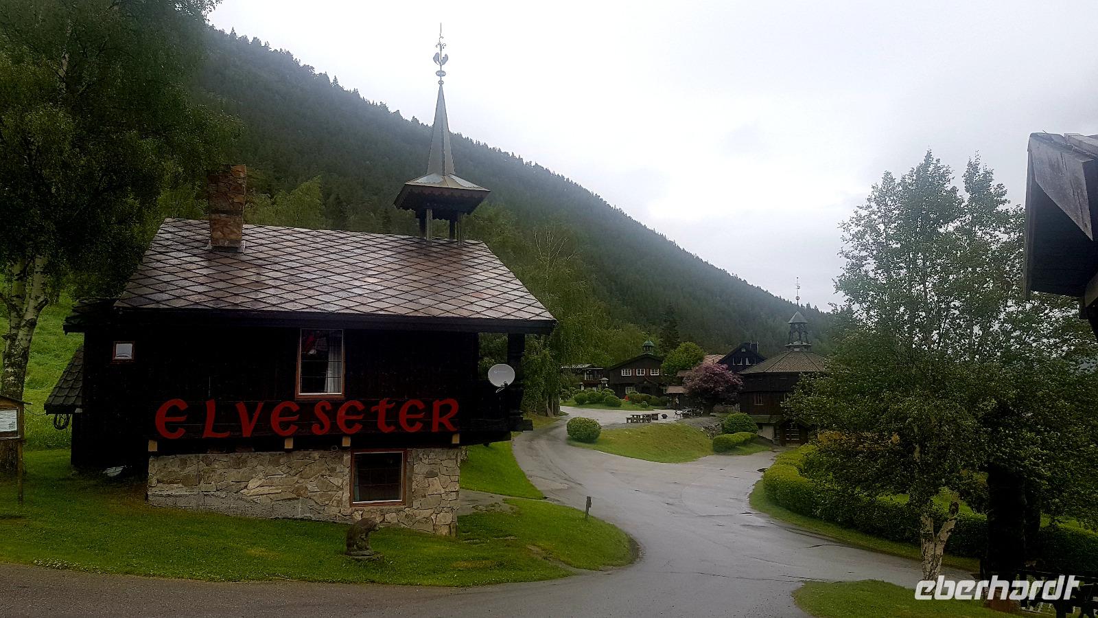 Das Berghotel „Elveseter" verzaubert uns mit seinem Charme und ist wie ein Museum eingerichtet. Dies zeugt davon, mit welcher Liebe dieses Haus familiär als Hotel geführt wird. Die Saga Säule vor dem Haus, erzählt uns die in Stein gemeißelte norwegische Geschichte.