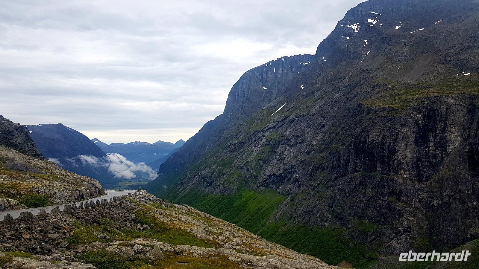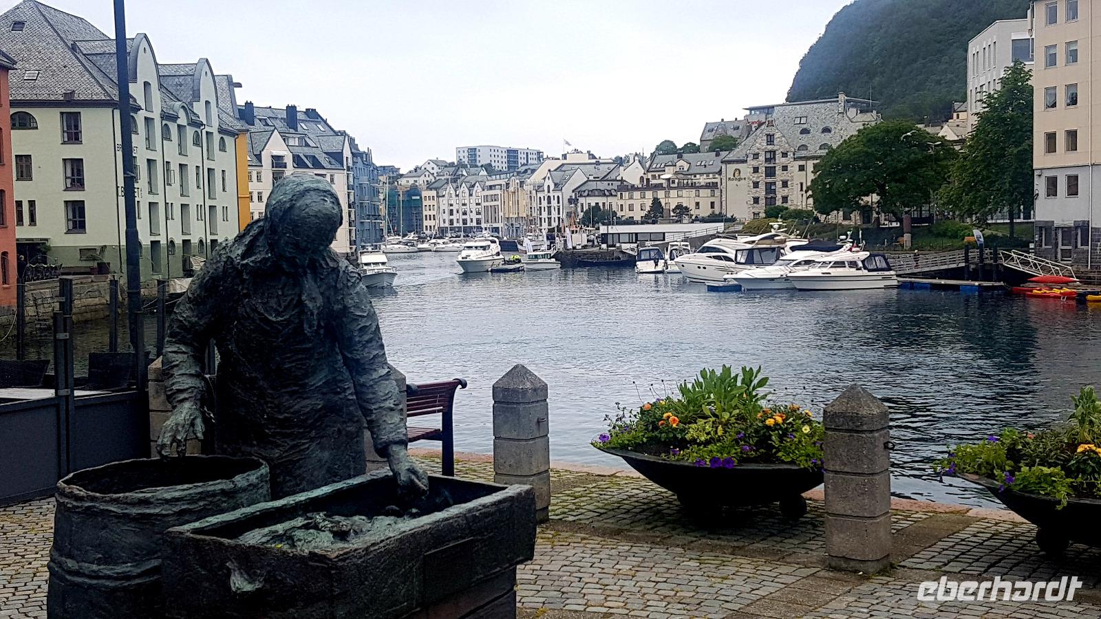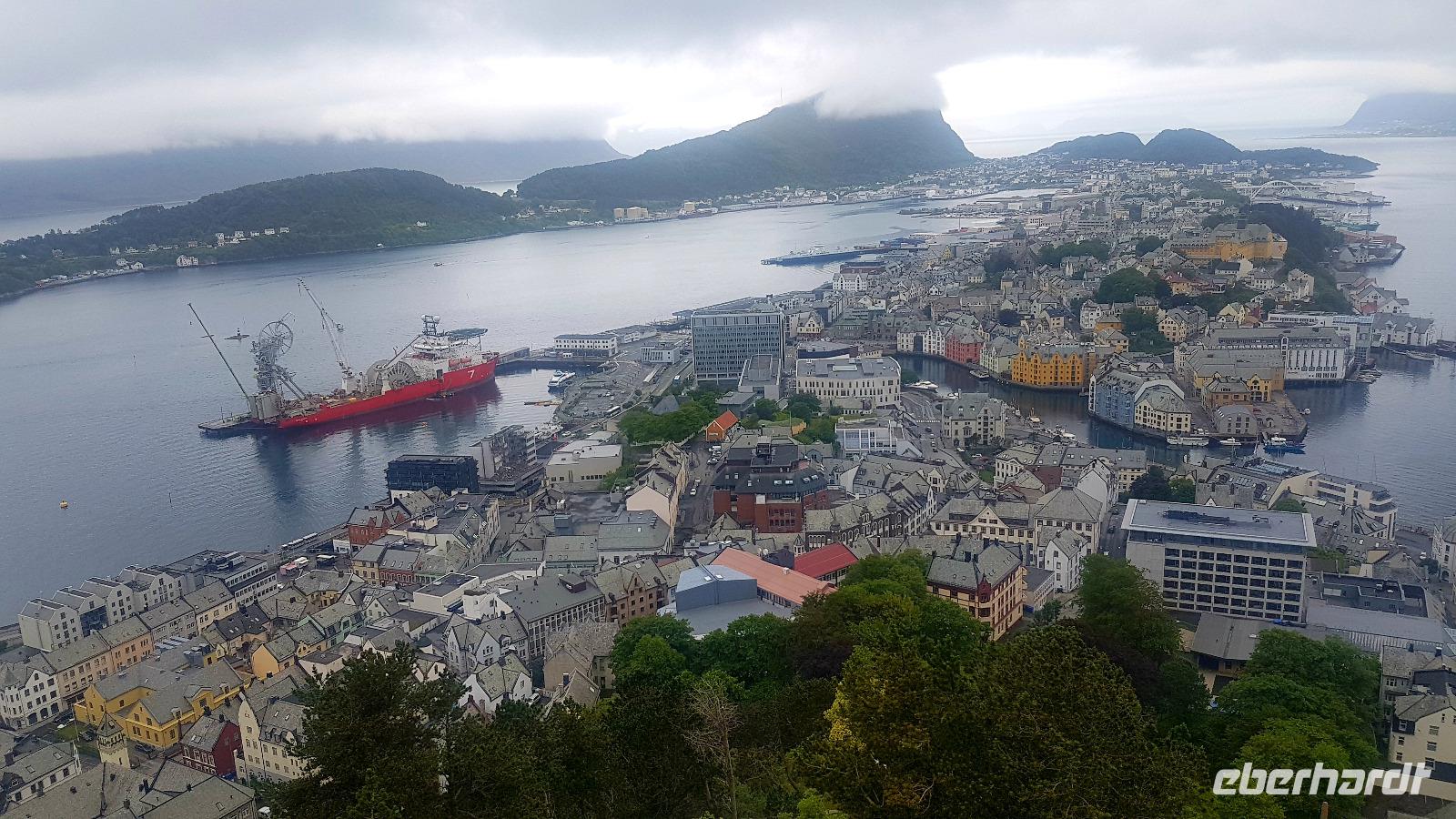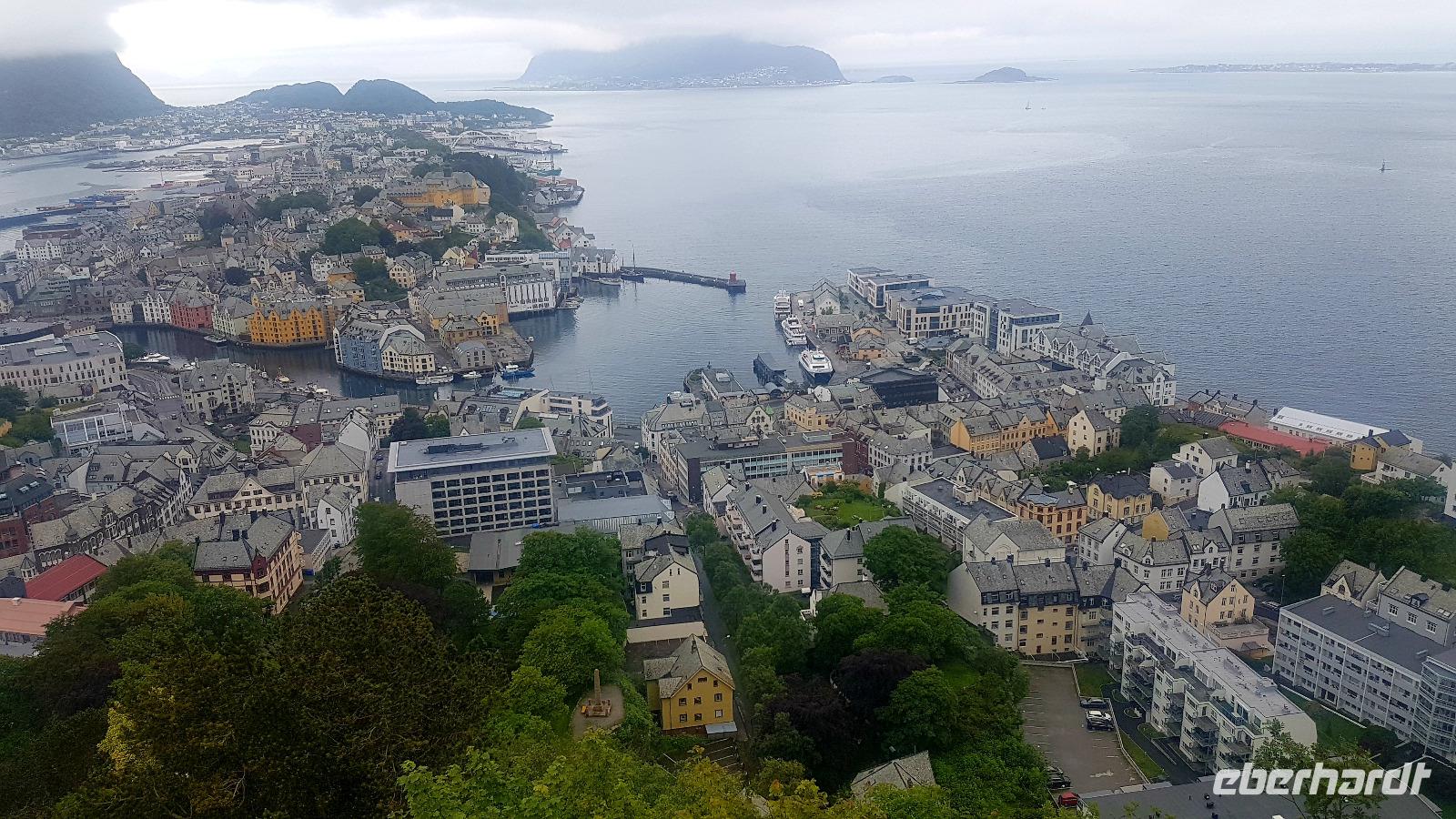 Nun führt uns der Weg über Åndalsness ins Land der Trolle. Von unten bestaunen wir die etwa 1.000 m Höhe der Trollwand. Doch dann geht es die 11 Kehren der Trollstigen hinauf. Oben angekommen genehmigen wir uns eine längere Pause. Die Auffahrt lag zwar im Nebel, aber oben angekommen riss die Wolkendecke auf und gab einen herrlichen Blick ins Tal frei.Über das Vallsdal und einen weiteren Stopp beim Wasserfall Gutbrandsvegen erreichen wir Ålesund, die Stadt des Jugendstils. Diese betrachten wir zunächst von oben. Hier heißt der Hausberg Aksla. Dann beginnt die Abfahrt und am späten Nachmittag bleibt noch Zeit für einen Spaziergang durch die Stadt selbst.