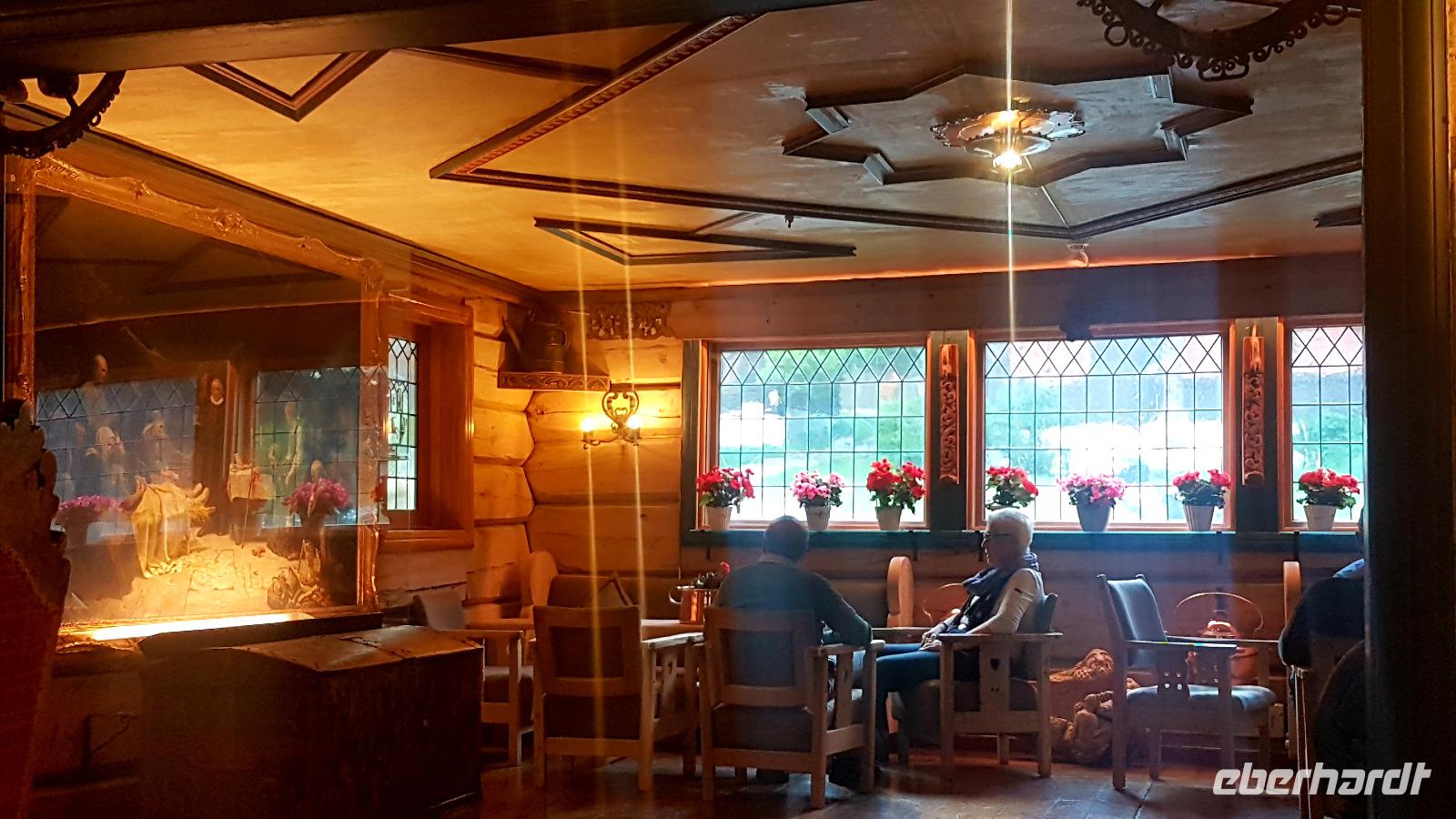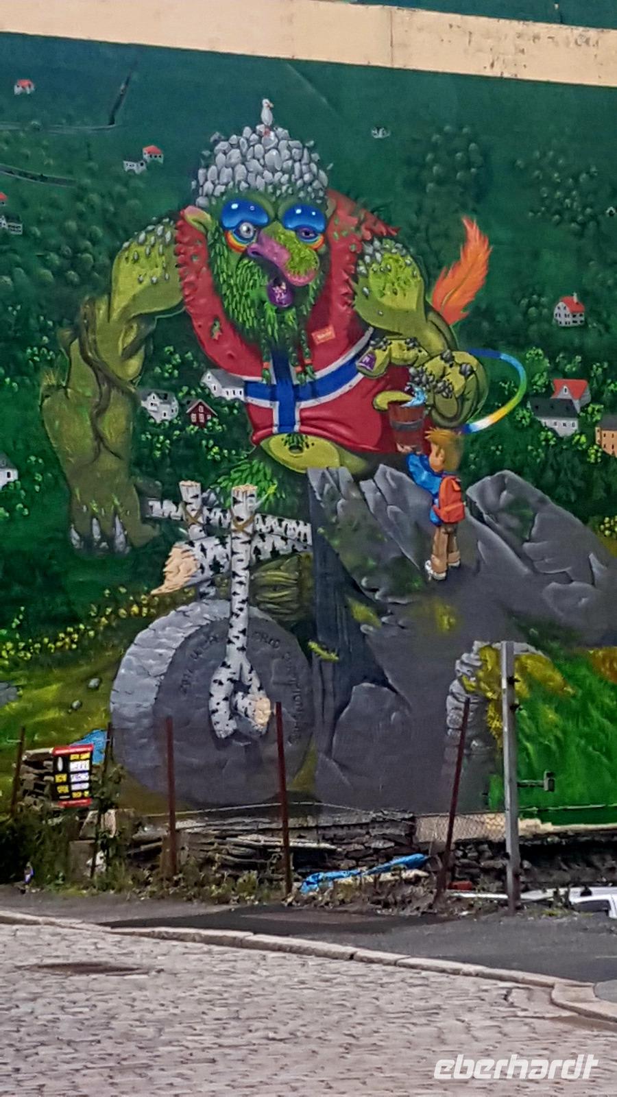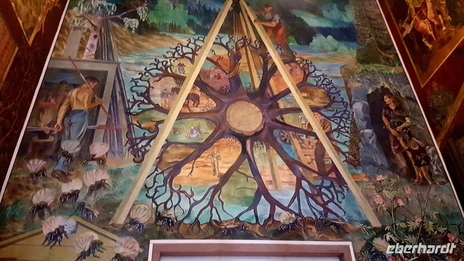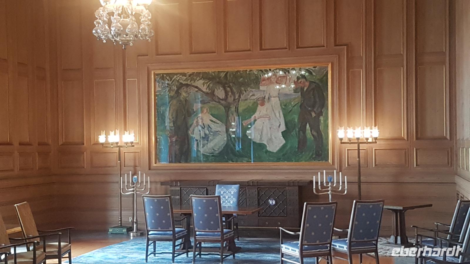 Mit den verbliebenen 15 Gästen schaue ich mir das Rathaus an. Im Hochzeitszimmer können wir einen echten „Munck" bestaunen. Die Malereien an den Wänden der anderen Räumlichkeiten zeigen das Leben der Norweger bei Arbeit und Freizeit, die Bedeutung der Familie und der Natur.
