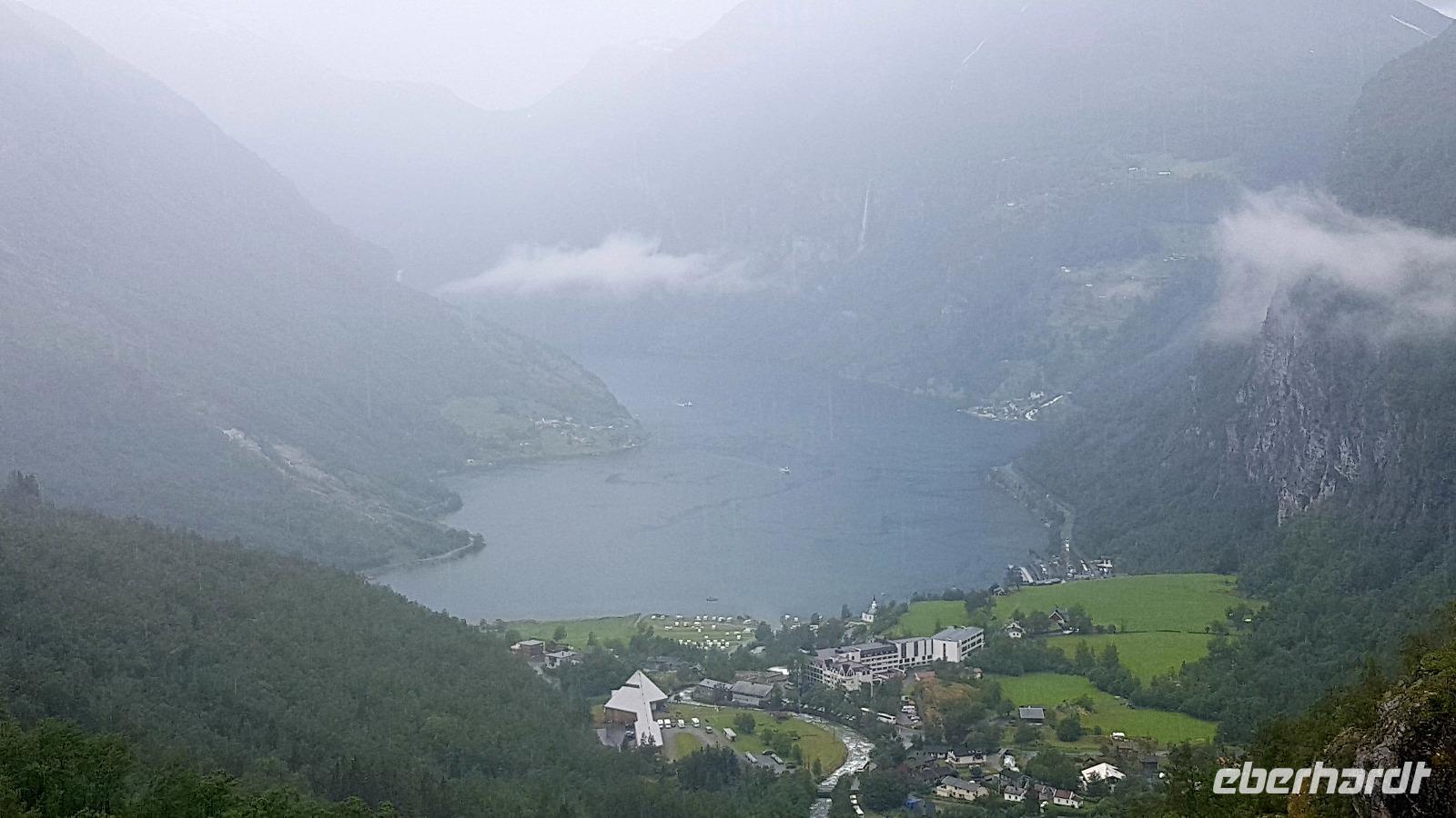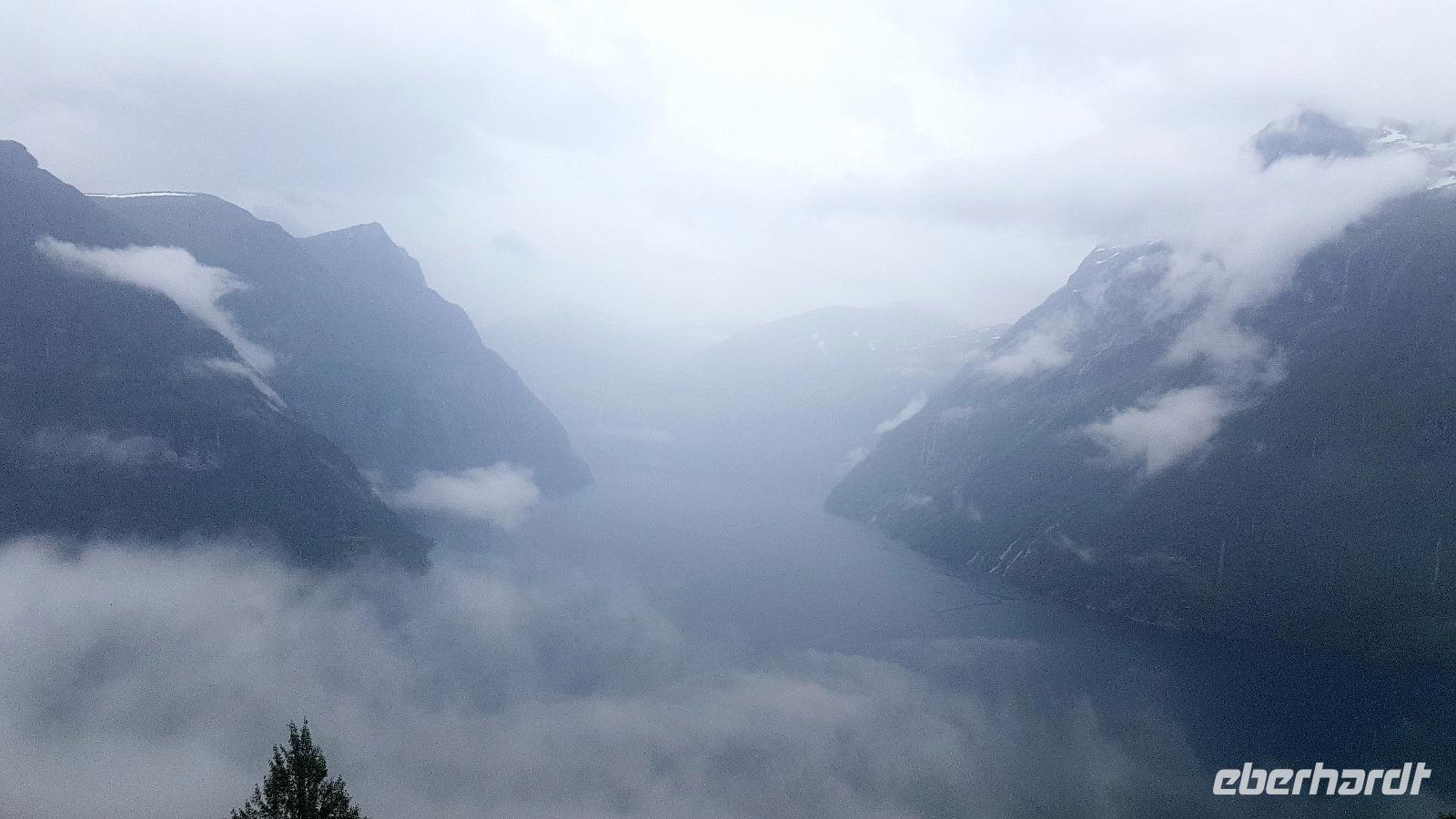 Die Reise geht weiter über die Serpentinen der Geirangerstraße in Richtung Gletschersee, dem Djubvatnet. Auf dem Weg hinauf, halten wir nochmals oberhalb des Fjords.
