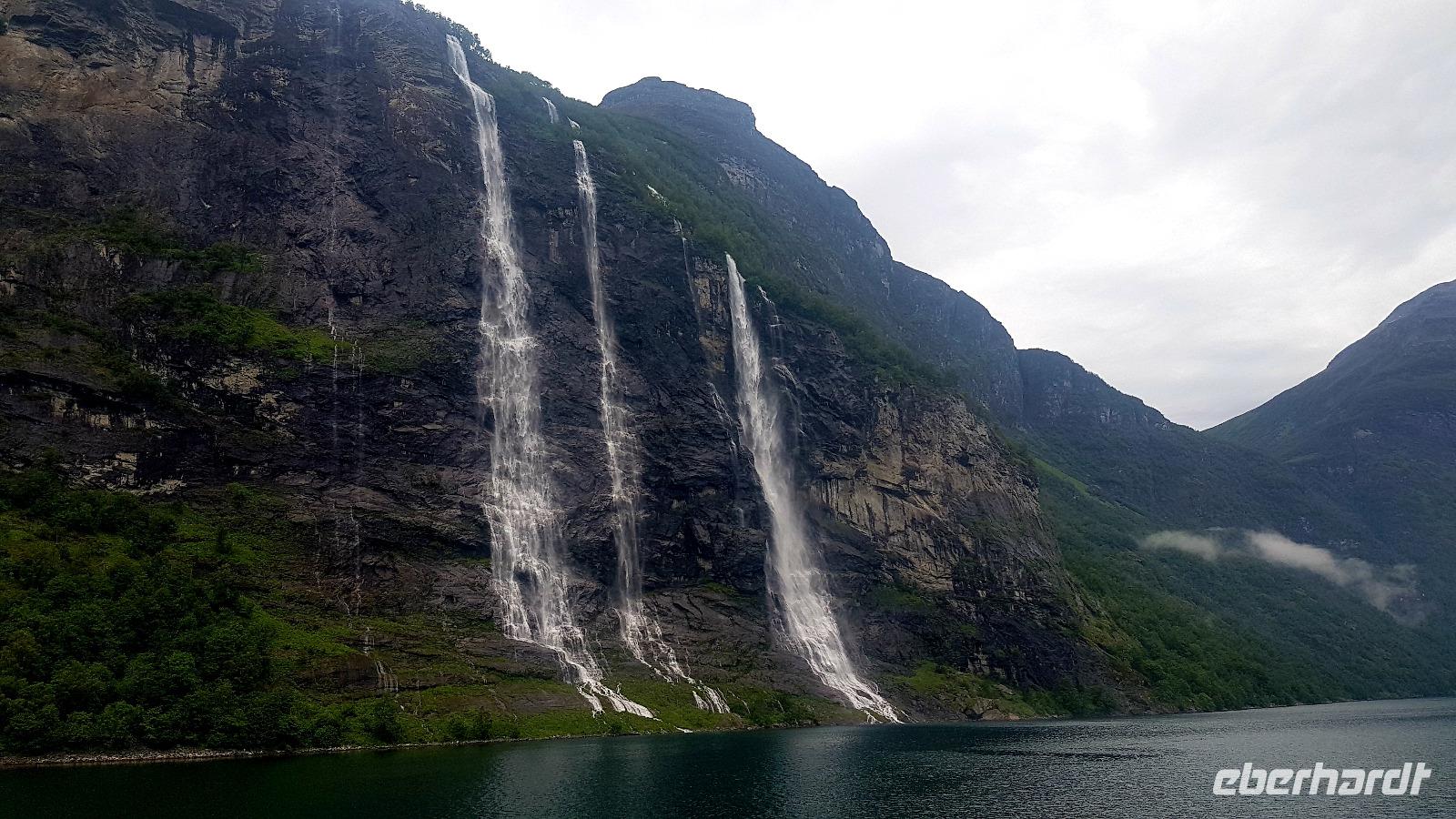 Von hier aus werden wir einen weiteren Höhepunkt unserer Reise erleben! Eine kleine Schiffsrundfahrt durch den Geirangerfjord. Bei einem Fotostopp mit Blick in den Fjord, oberhalb von Hellesylt, regnet es noch heftig. Doch als die Fährfahrt beginnt, endet der Regen und das Wetter klart auf.Steile Felswände und die bekannten Wasserfälle begeistern uns. Die Sonne lässt sich immer öfter blicken und das bereitet natürlich zusätzliche Freude. Wieder an Land spazieren wir durch den Ort Geiranger, wo unser Chauffeur Roy bereits auf uns wartet.