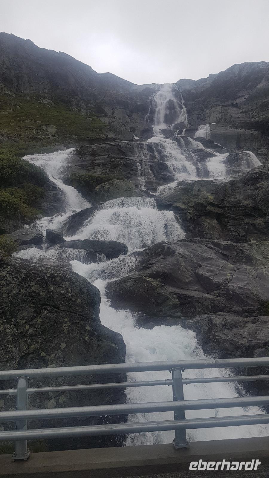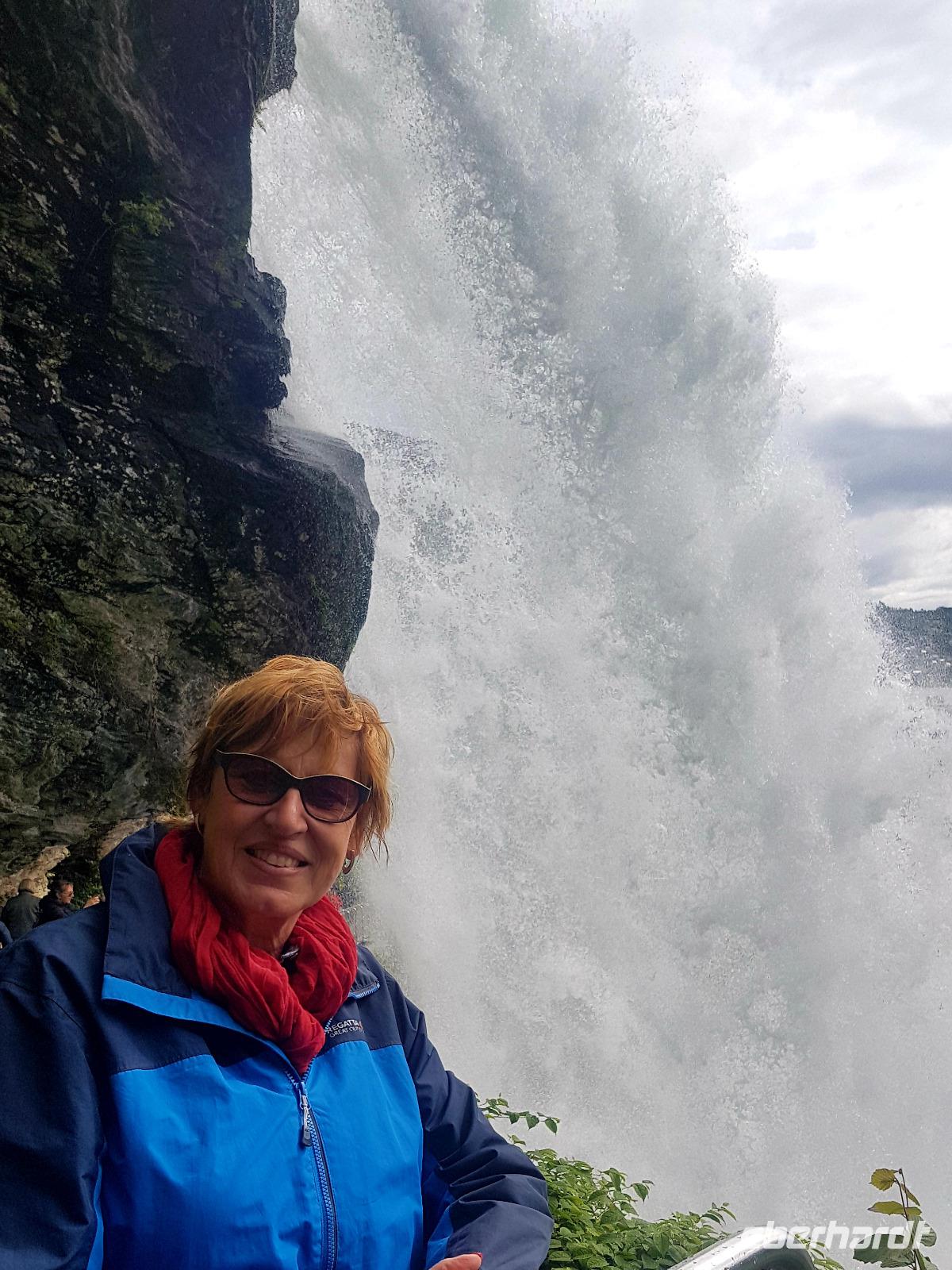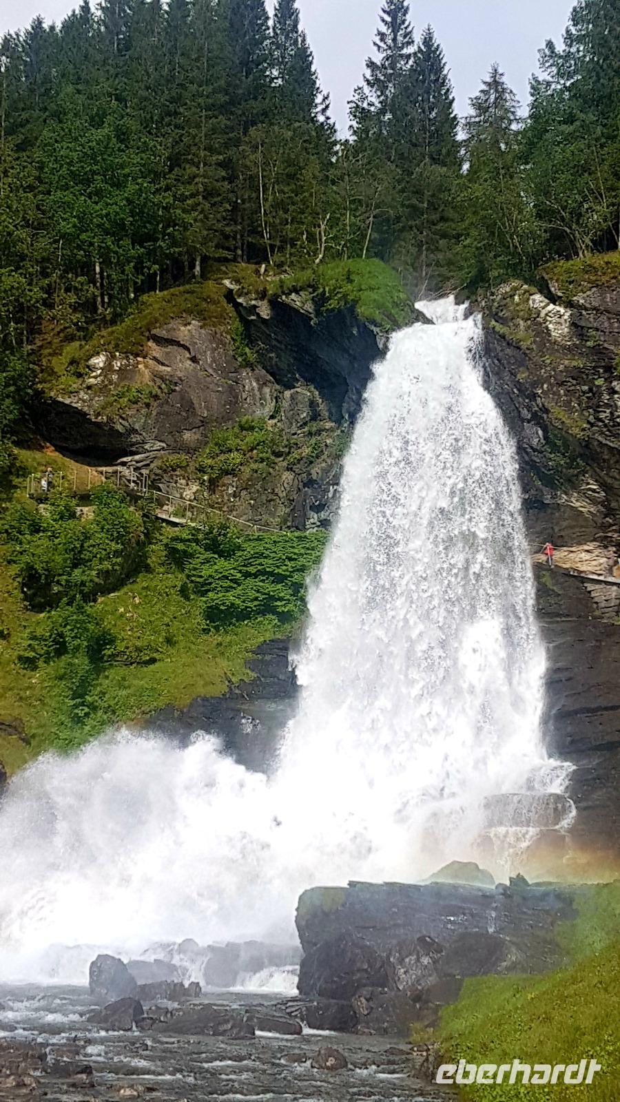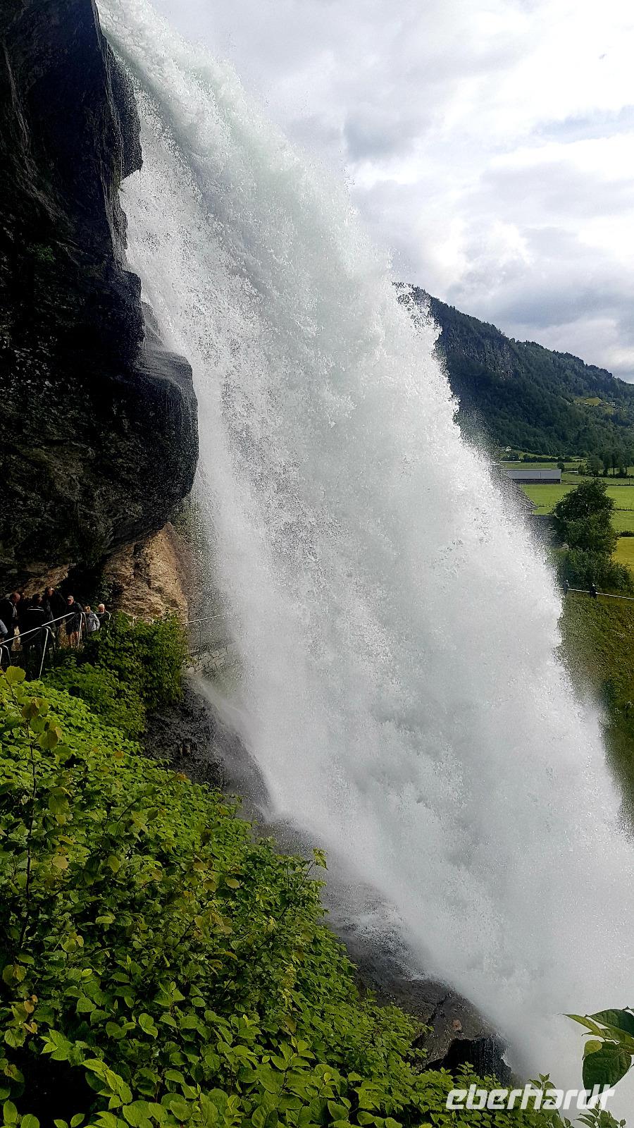 Weitere Wasserfälle erwarten uns auf unserer Fahrt in Richtung der nächsten Hochebene. Bei dem Ersten, dem Steindalsfossen können wir hinter den herabfallenden Wassern entlang gehen und befinden uns somit "unter" dem Wasserfall.