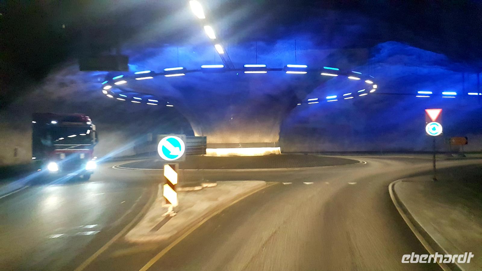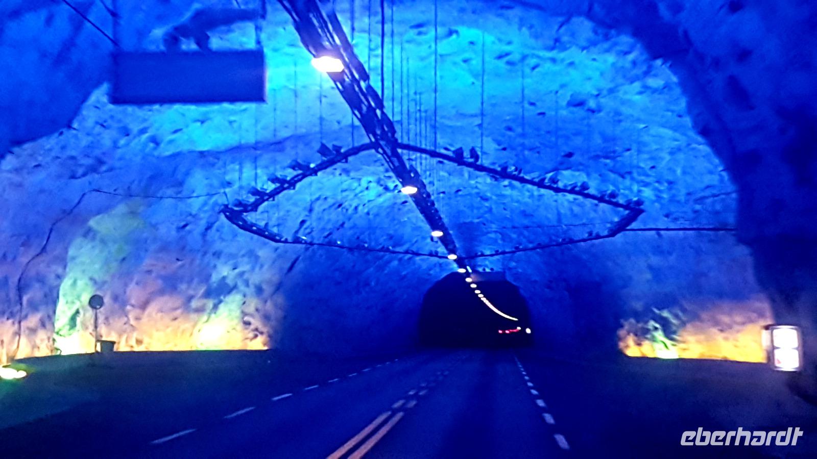 Der Lærdalstunnel ist über 24 km lang. Mit Lichteffekten ausgestattete Halteinseln sollen die Konzentration des Autofahrers erhalten und helfen, Unfälle zu vermeiden. So wird selbst eine, für manche stressige Tunneldurchfahrt, zu einem schönen Erlebnis.In Flåm am Auerlandsfjord machen wir unsere Mittagspause. Hier ist der Ausgangspunkt der Bahnreise in das 22 km entfernte Myrdal. Dabei überwindet der Zug über 800 Höhenmeter, eine Panoramafahrt, die aber heute leider nicht auf dem Programm steht.