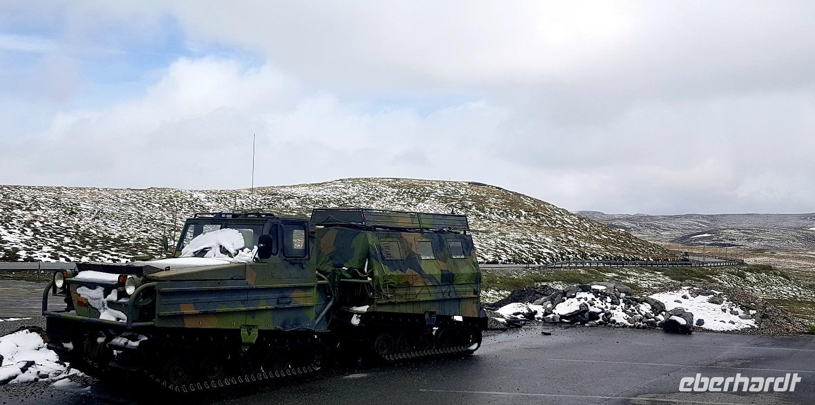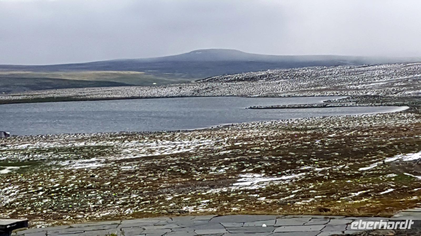 Bei der Fahrt über die Hardangervidda, ein weiterer großer Nationalpark, wechseln sich Seen, Moor- und Grasflächen einander ab. Die Hochebene liegt auf etwa 1.100 m und ist die größte Europas. Wir halten öfter an, um eindrucksvolle Fotos schießen zu können. Es schneit und die Temperatur liegt bei 4 Grad Celsius.