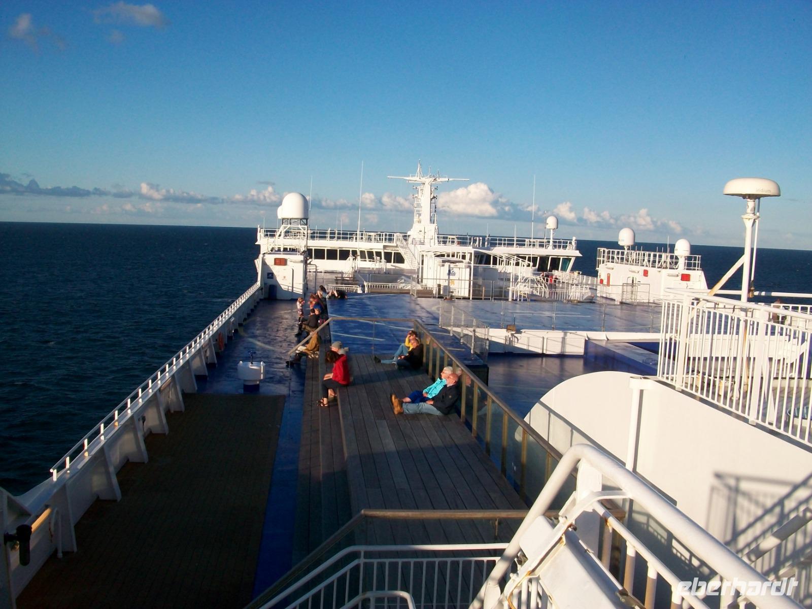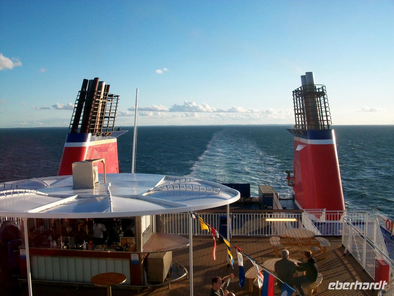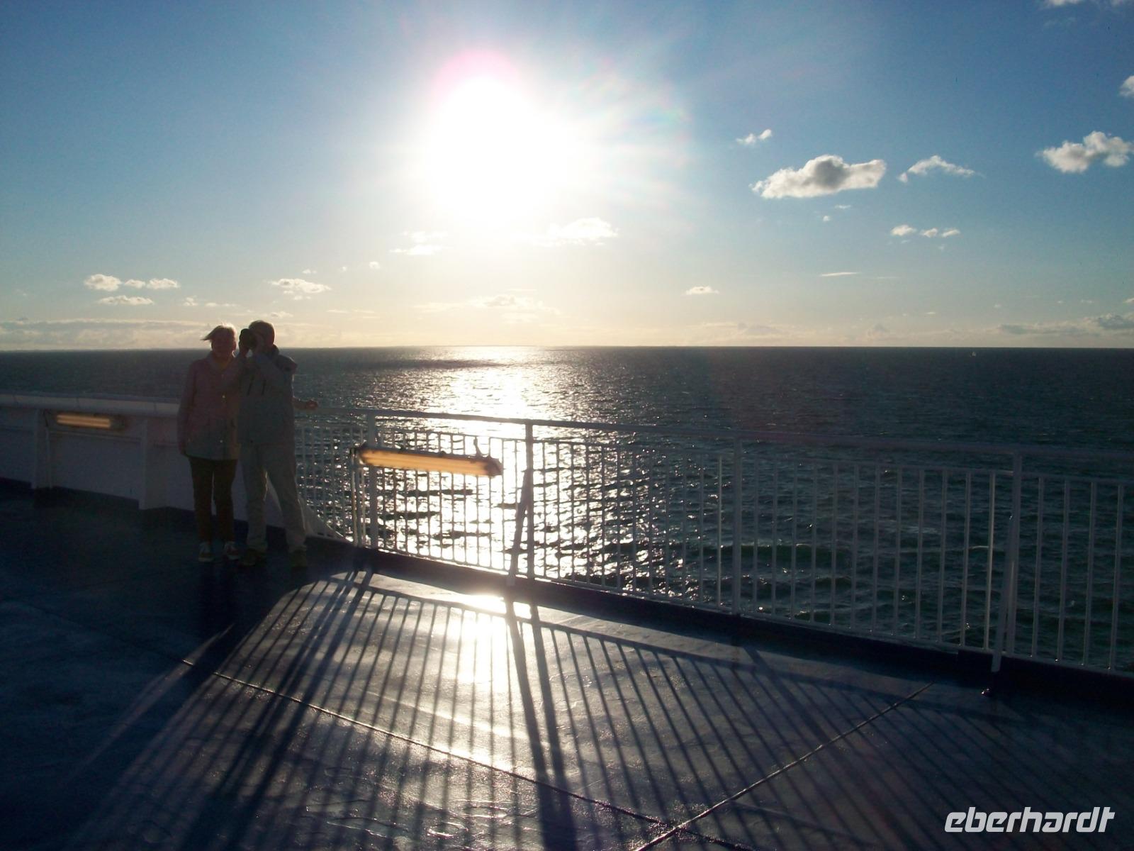 Gegen sieben hat sich unsere kleine Reisegruppe aber wieder eingefunden; mit gutem Appetit genießen wir das leckere Abendessen an Bord, während die Fähre langsam die Kieler Förde hinter sich lässt und das offene Meer erreicht. Dann genießen wir diesen schönen Abend oben auf dem Deck, lassen uns die Seeluft um die Ohren blasen und später am Abend schickt sich die Sonne an, hinter den dänischen Inseln unterzugehen.