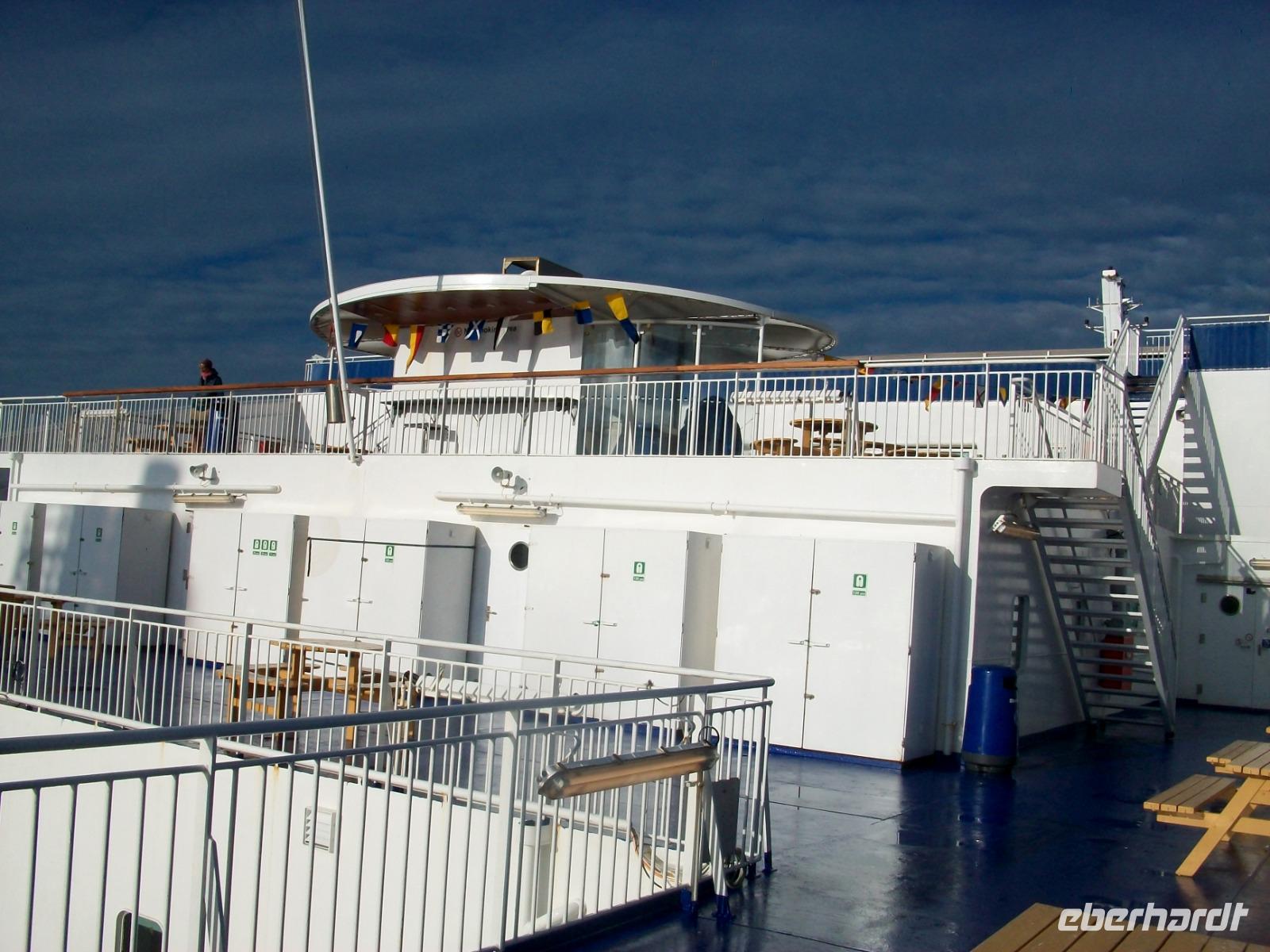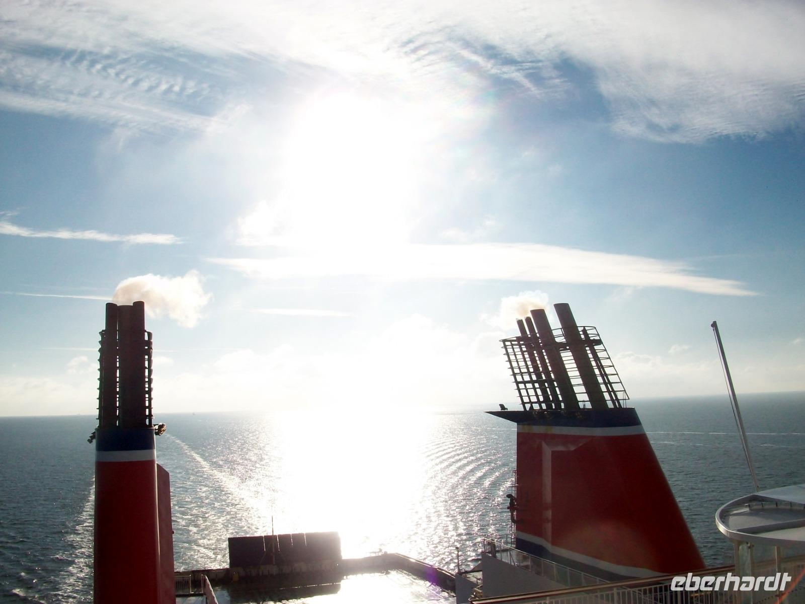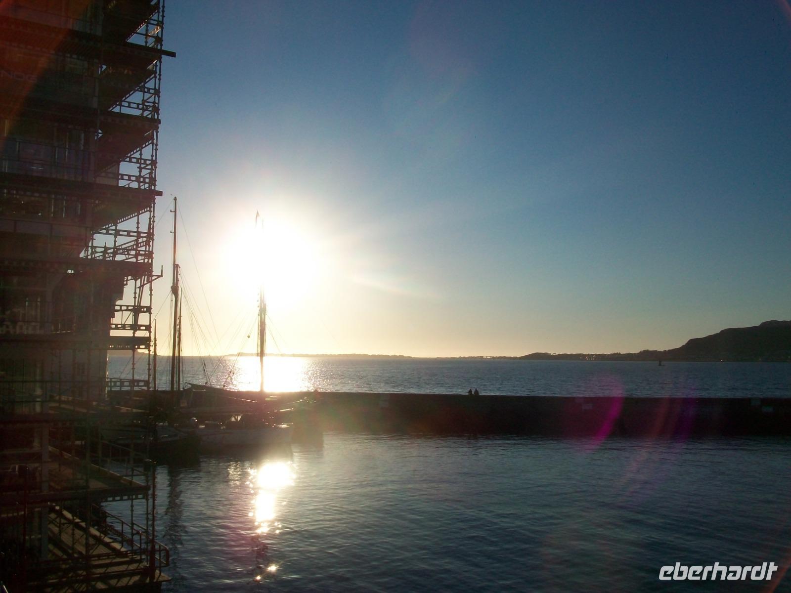 Gegen sieben hat sich unsere kleine Reisegruppe aber wieder eingefunden; mit gutem Appetit genießen wir das leckere Abendessen an Bord, während die Fähre langsam die Kieler Förde hinter sich lässt und das offene Meer erreicht. Dann genießen wir diesen schönen Abend oben auf dem Deck, lassen uns die Seeluft um die Ohren blasen und später am Abend schickt sich die Sonne an, hinter den dänischen Inseln unterzugehen.