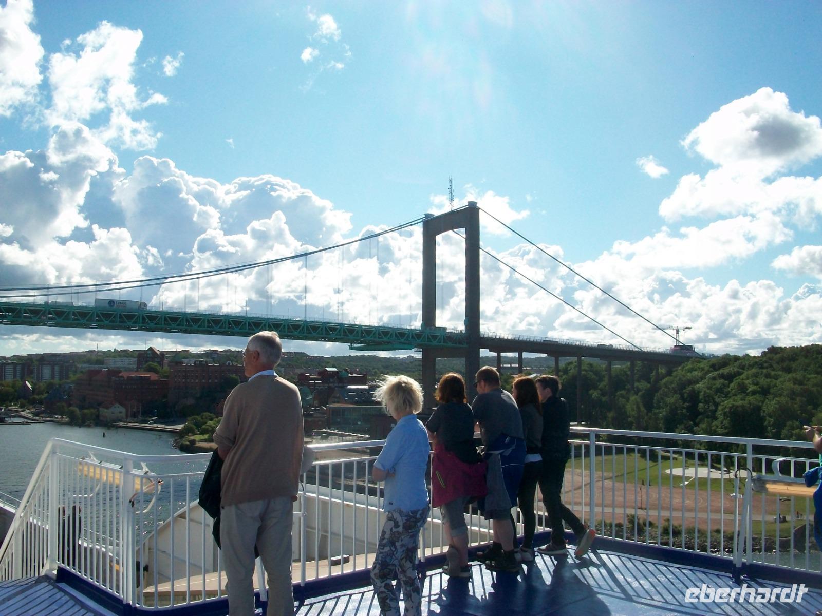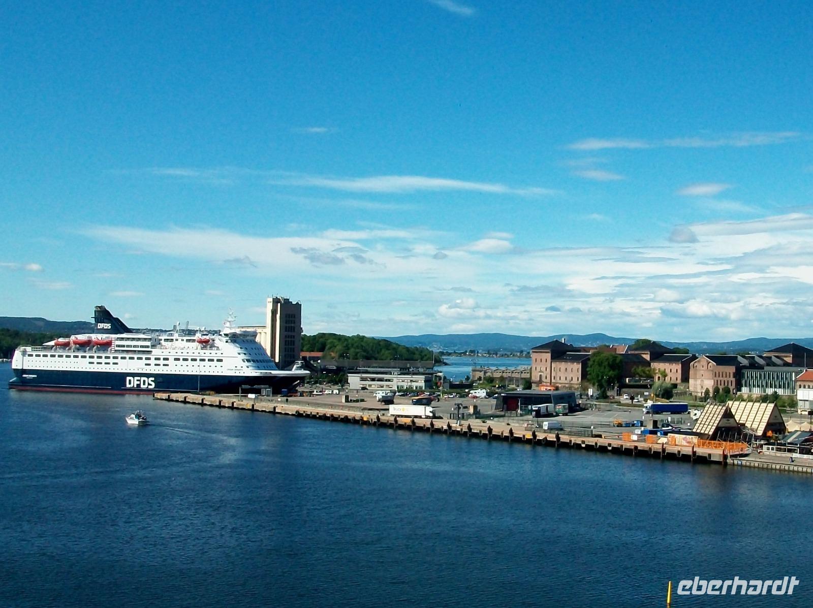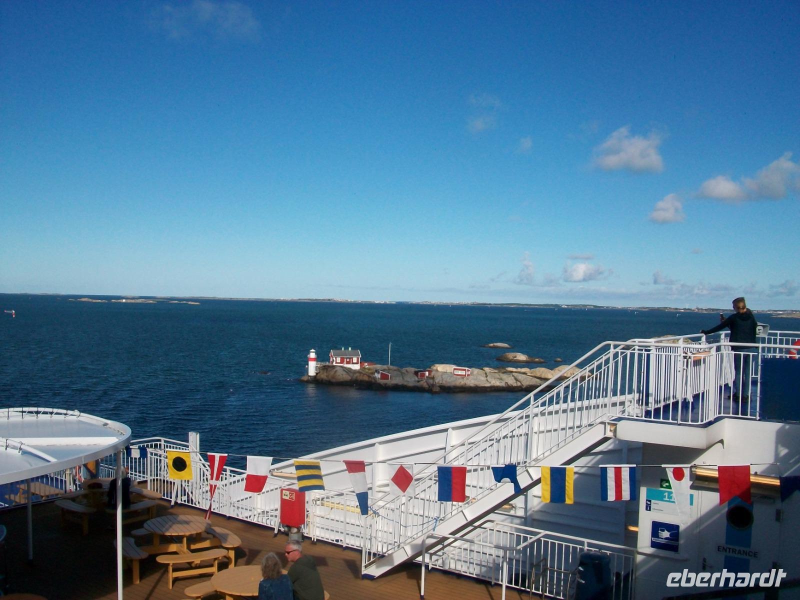 An diesem sonnigen Vormittag gönnen wir uns noch eine schöne Zeit in Oslo. Ein Bummel bringt uns hinauf zur Oper, zur Fußgängerzone und zum Rathaus aus rotem Backstein. Auch ein kleiner Abstecher zur Festung Akershus ist möglich und somit vergeht die Zeit wie im Flug. Gegen Mittag müssen wir aber aufbrechen, unser Weg bis zur Fähre ist noch weit. Vor dem Svinesund genehmigen wir uns aber dennoch eine Mittagspause um dann, gleich im Anschluss, hinüber nach Schweden zu fahren. Die Räder des Busses surren auf dem Beton der Autobahn, Wälder, Felder und Seen huschen an den Fenstern vorbei und, schon in Göteborg angelangt, stehen wir erst einmal einige Minuten im Stau. Dieser vergeht aber schnell und überpünktlich langen wir am Fährterminal an. Das Schiff steht schon bereit, einige Formalitäten müssen noch erfüllt werden, aber dann können wir an Bord.