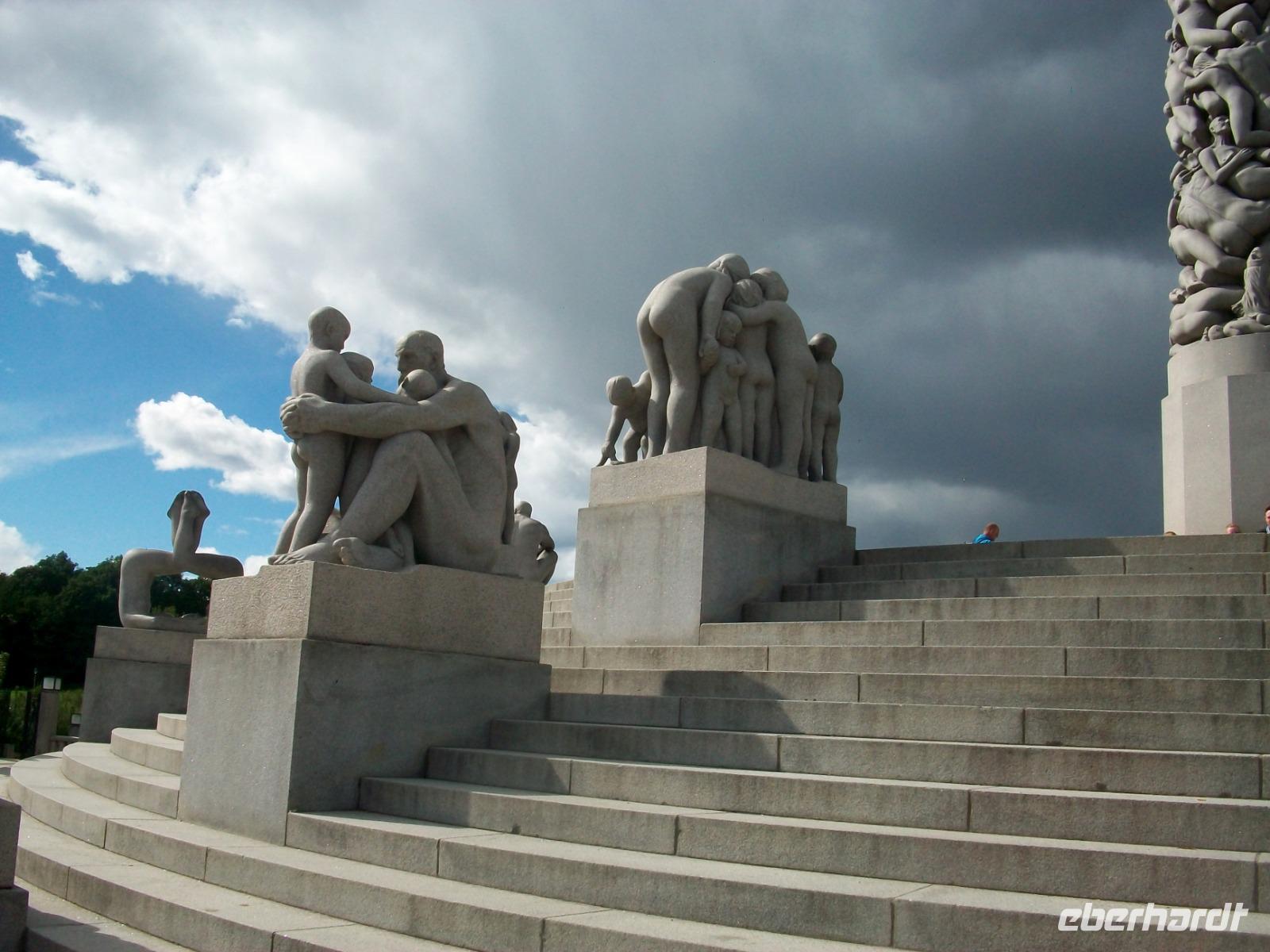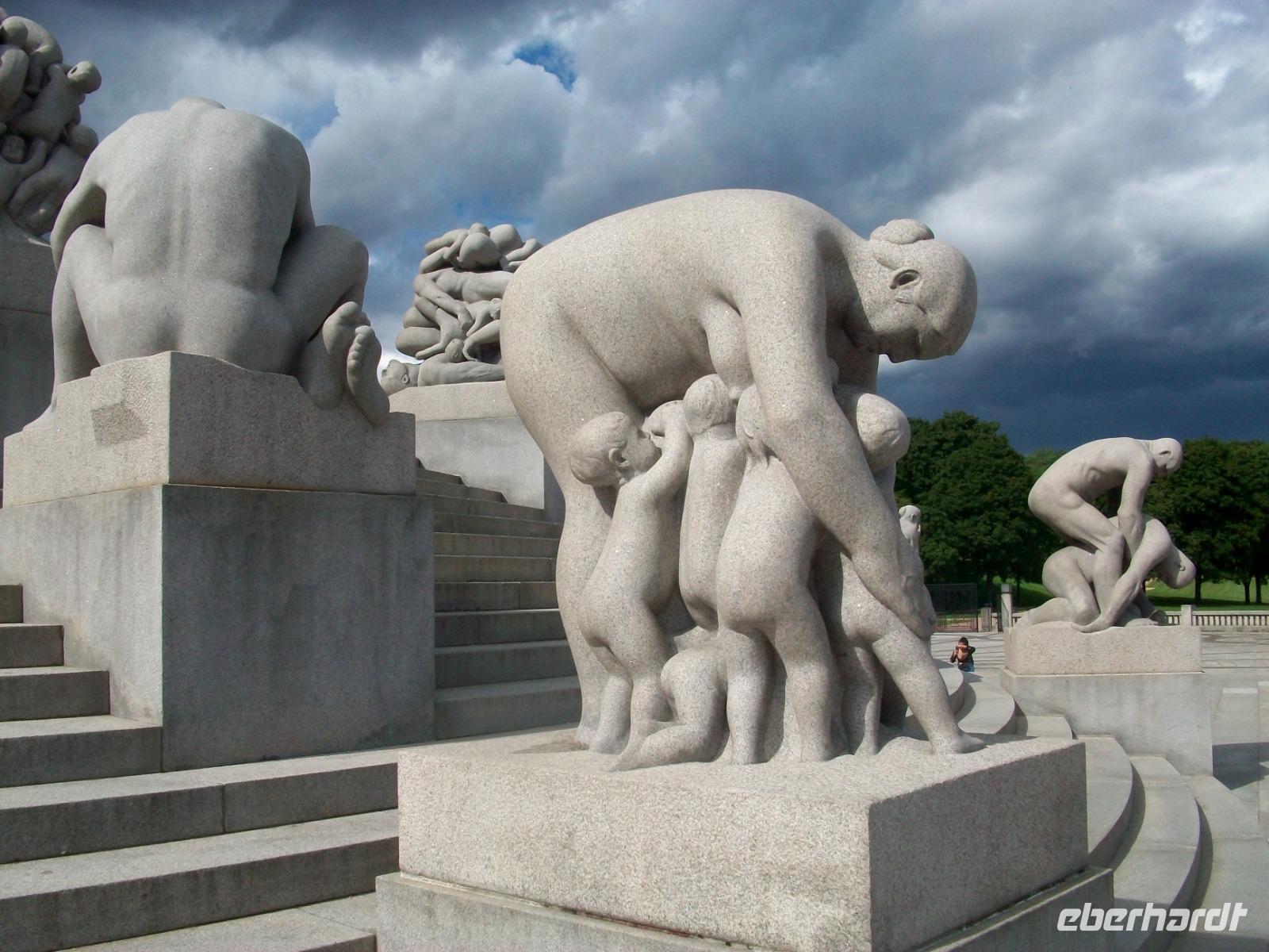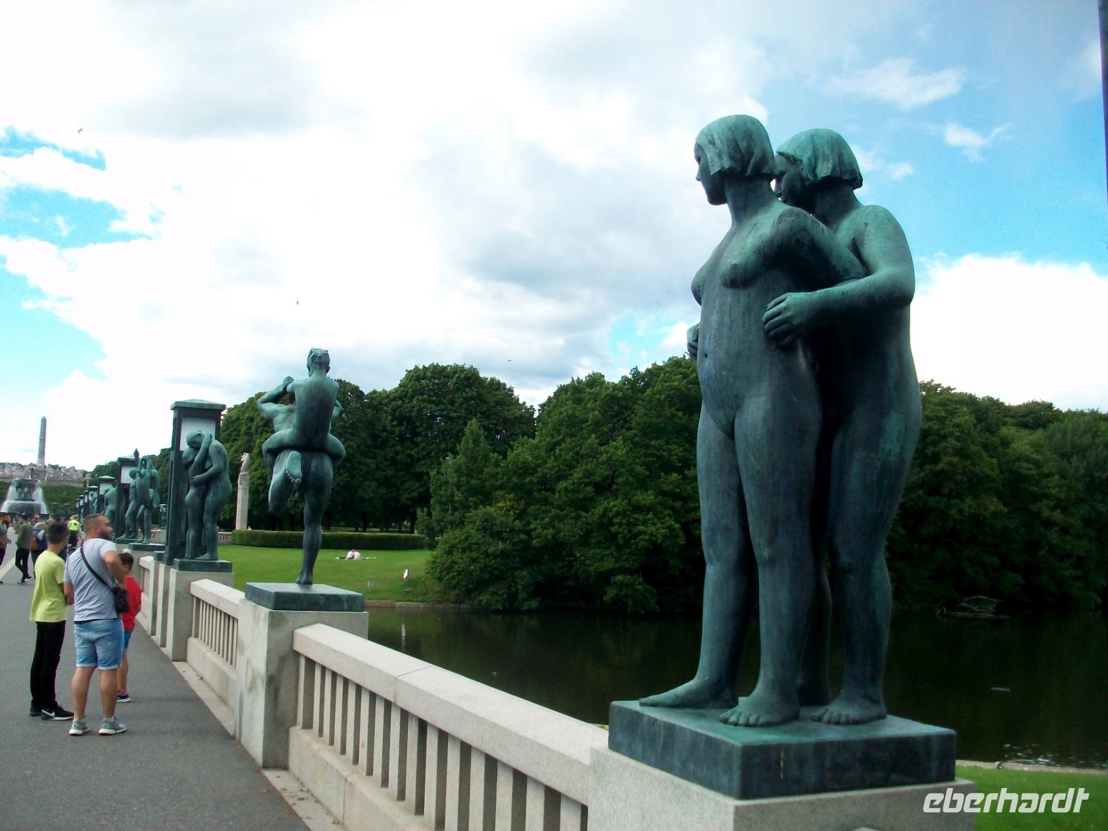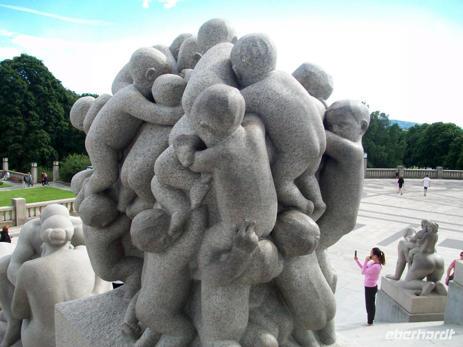 Dann verlassen wir die Fähre; unten erwartet uns schon Roy mit dem Bus. Nun liegt eine gute Strecke vor uns; zunächst geht es ein ganzes Stück durch Schweden und wir genießen vom Bus aus die liebliche Landschaft die an den Busfenstern vorbeizieht. Unsere Mittagspause legen wir schon auf norwegischem Boden ein um danach Kurs auf Oslo zu nehmen. Petrus ist uns auch weiterhin hold und so gelangen wir störungsfrei zum Treffpunkt mit unserer Stadtführerin im Zentrum der Stadt. Oslo hat einiges zu bieten: Wir sehen das sehr moderne Opernhaus, gelangen durch das nette Zentrum mit Fußgängerzone, Schloss und den sehr gepflegten Bürgerhäusern. Die weitere Fahrt führt uns nun zu einer ganz großen Attraktion dieser Stadt. In einem weitausladenden Park sehen wir zahlreiche Skulpturen welche uns der Bildhauer Gustav Vigeland hinterließ und staunen über die lebensechte Darstellung, dabei lauschen wir den Erklärungen unserer Führerin die uns die Symbolik dieser Gruppen erklärt. Leider vergeht hier die Zeit viel zu schnell, bald müssen wir uns aufmachen denn bis Lillehammer haben wir noch einen weiten Weg vor uns, wir werden am Ende der Reise für Oslo noch etwas mehr Zeit haben.