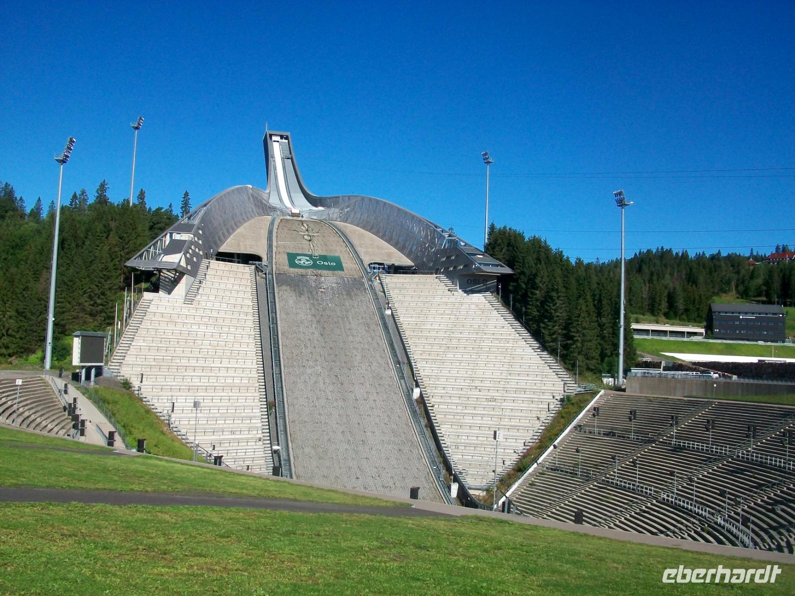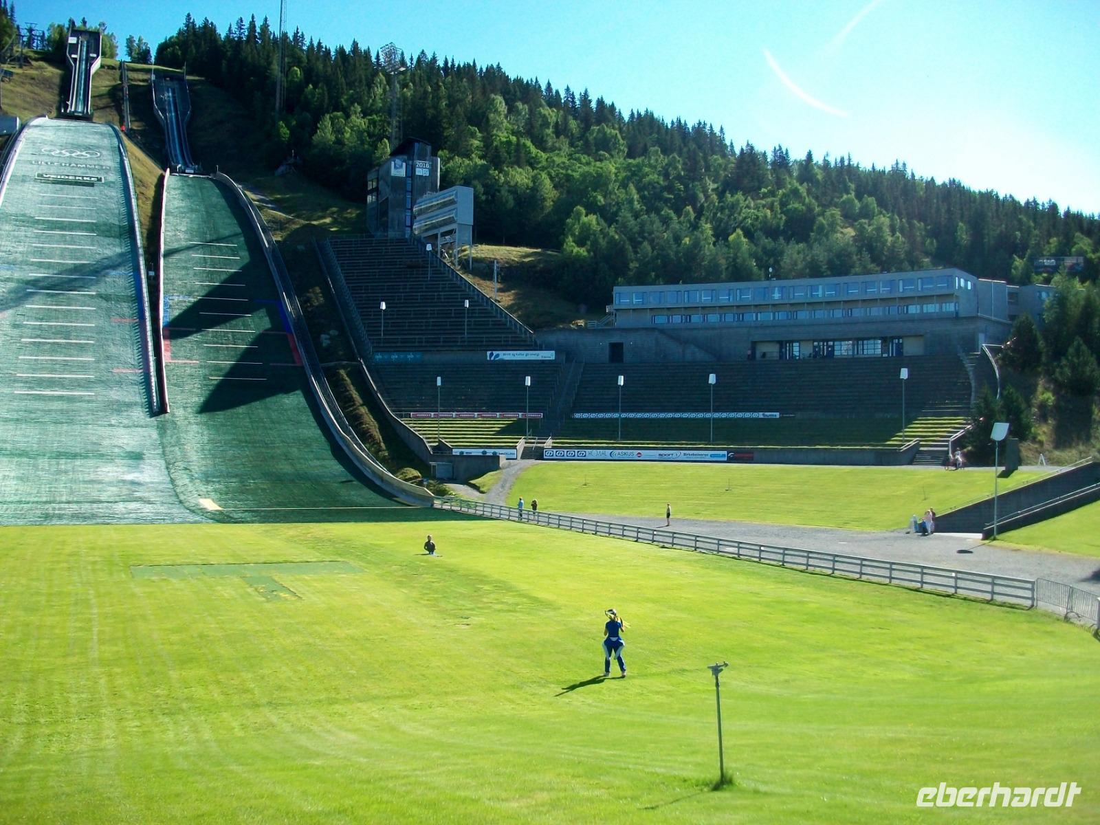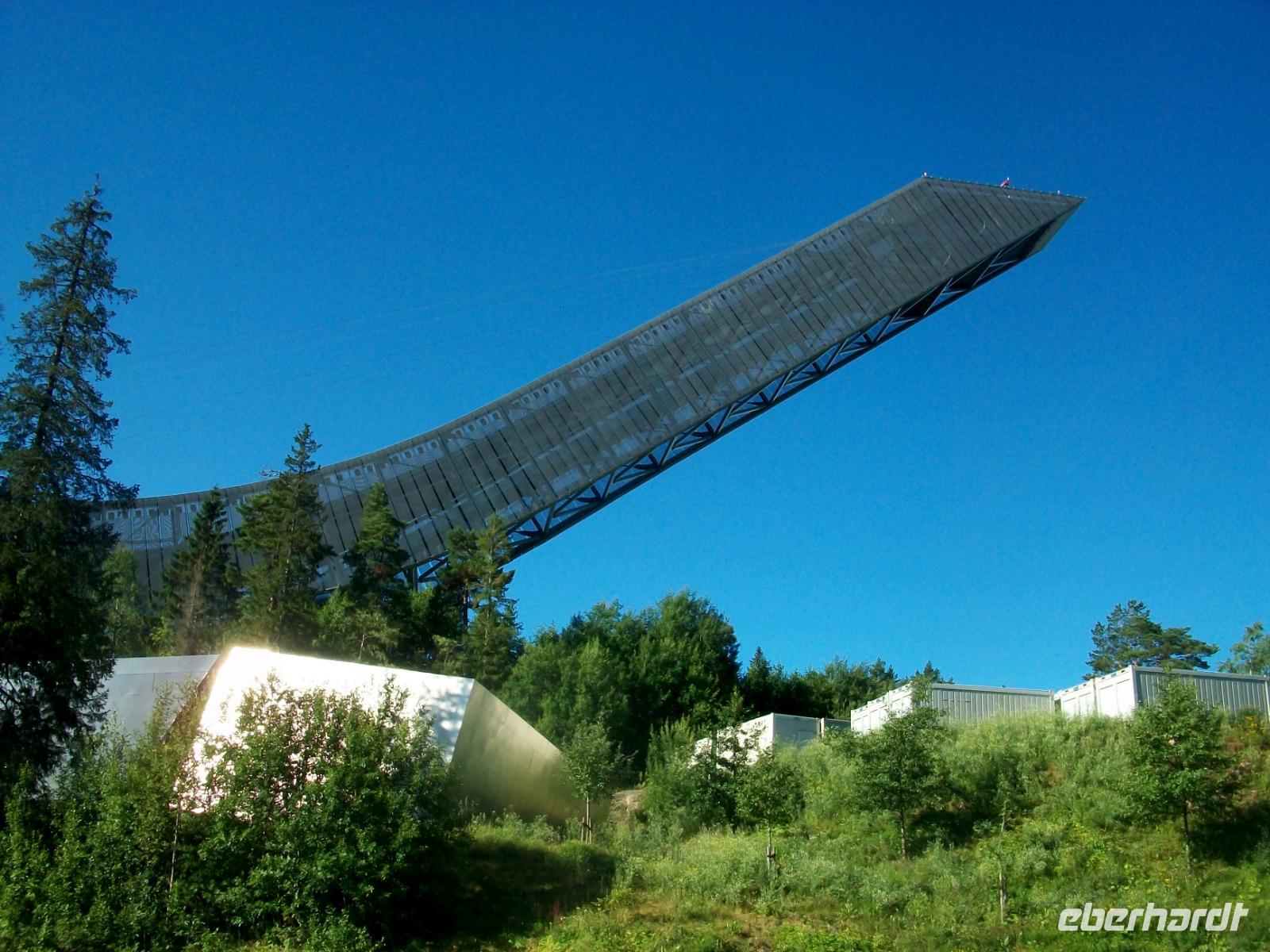 30.7.2020. So wie der alte Tag endete, beginnt der Neue. Kein Wölkchen trübt den Himmel über Oslo als wir die Höhen des Holmenkollen erklimmen. Bald wird die Sicht frei auf den Fjord mit den zahlreichen Schiffen, eine Fähre hat auch festgemacht unser Blick geht aber schnell wieder hinauf zum Berg. Links am Hang ist die futuristische Anlage der Sprungschanze zu sehen; eine mächtige Stahlkonstruktion trägt das Ganze und wir staunen über die Statik dieser Anlage. Auch wenn die Schanze ohne Schnee etwas nüchtern aussieht, in unserer Phantasie sehen wir die Sportler die sich todesmutig zu Tal stürzen, ein leichter Schwindel befällt den der hinunter schaut und sich vorstellt selbst da hinab zu springen.