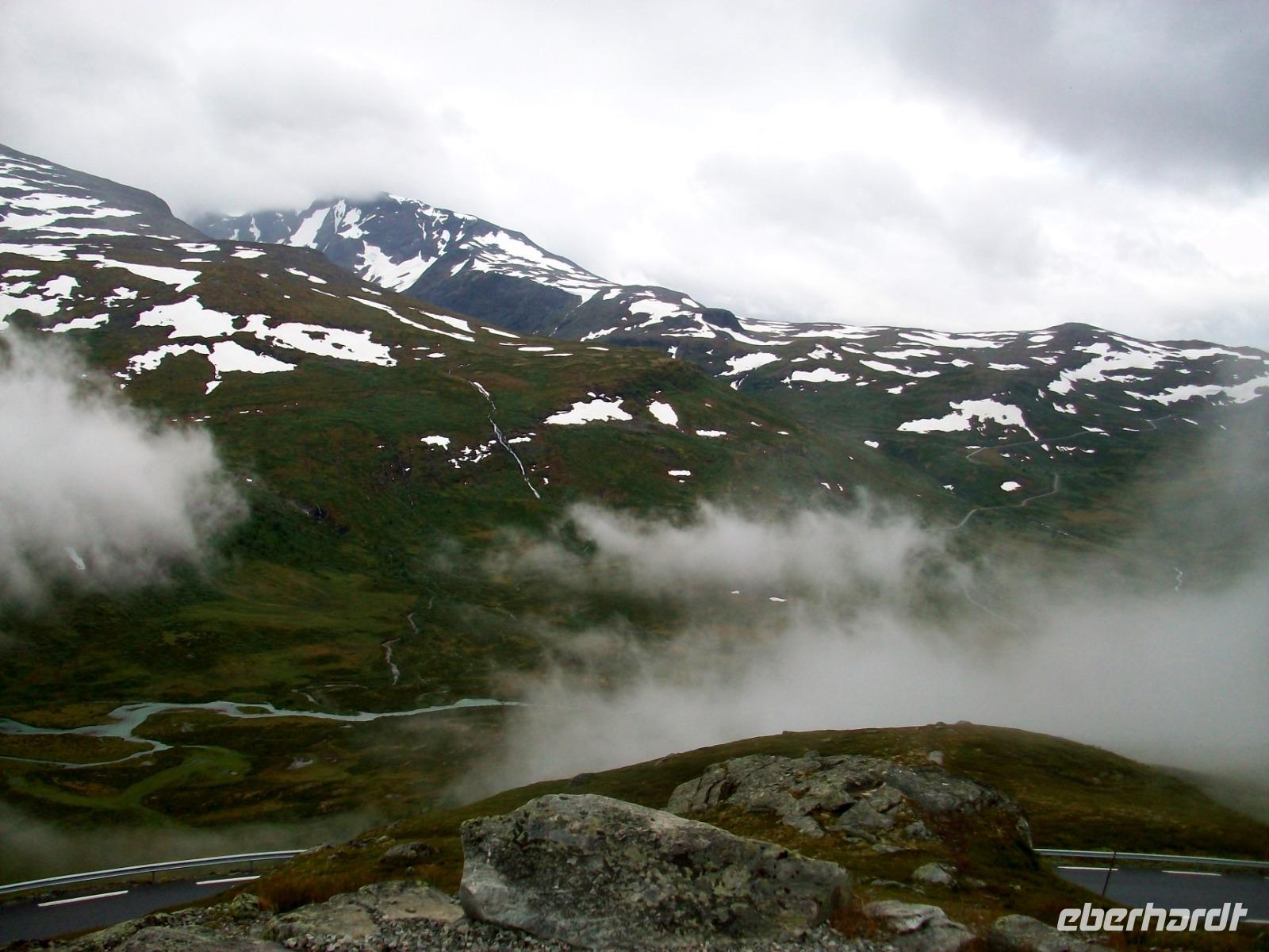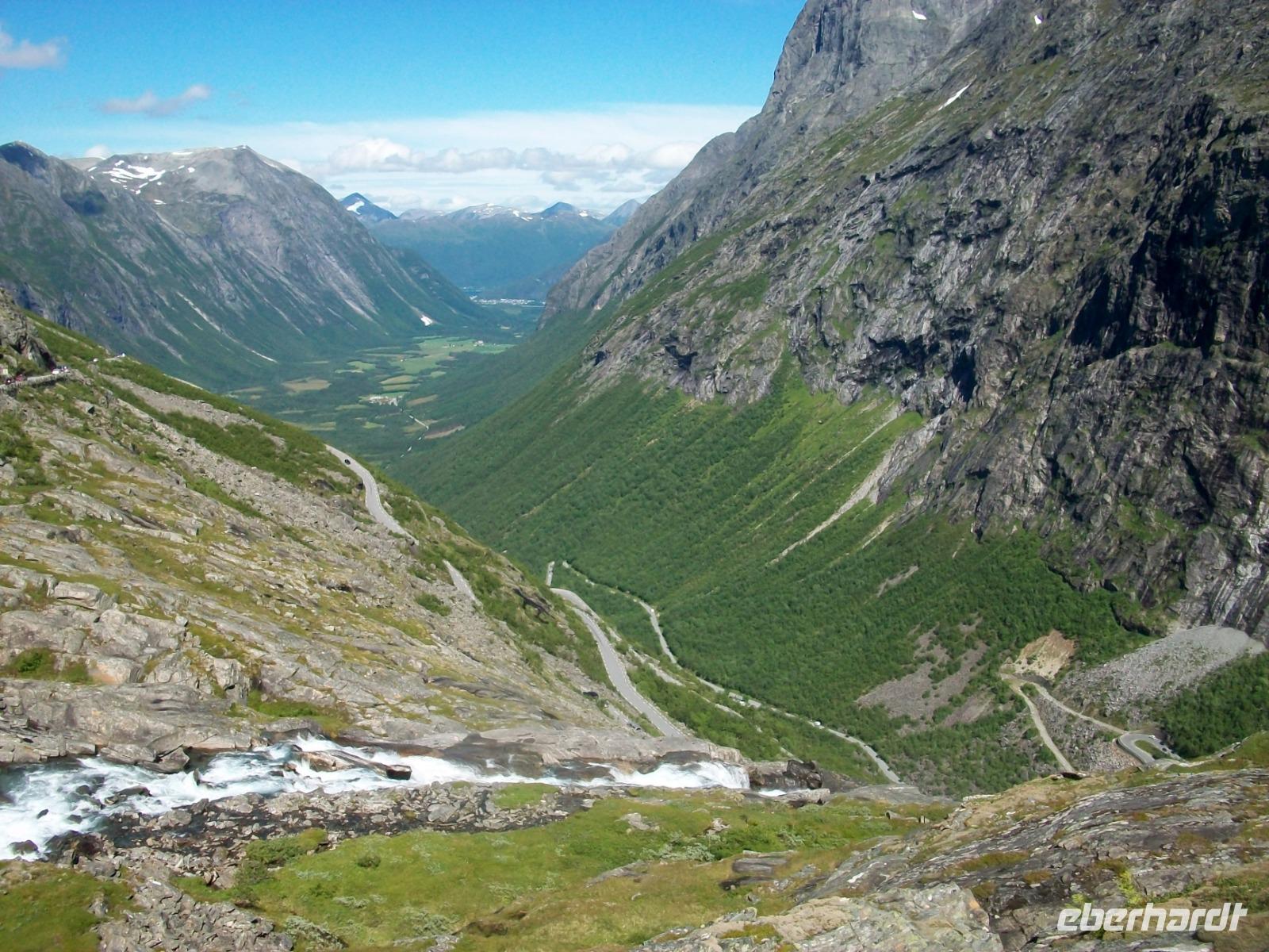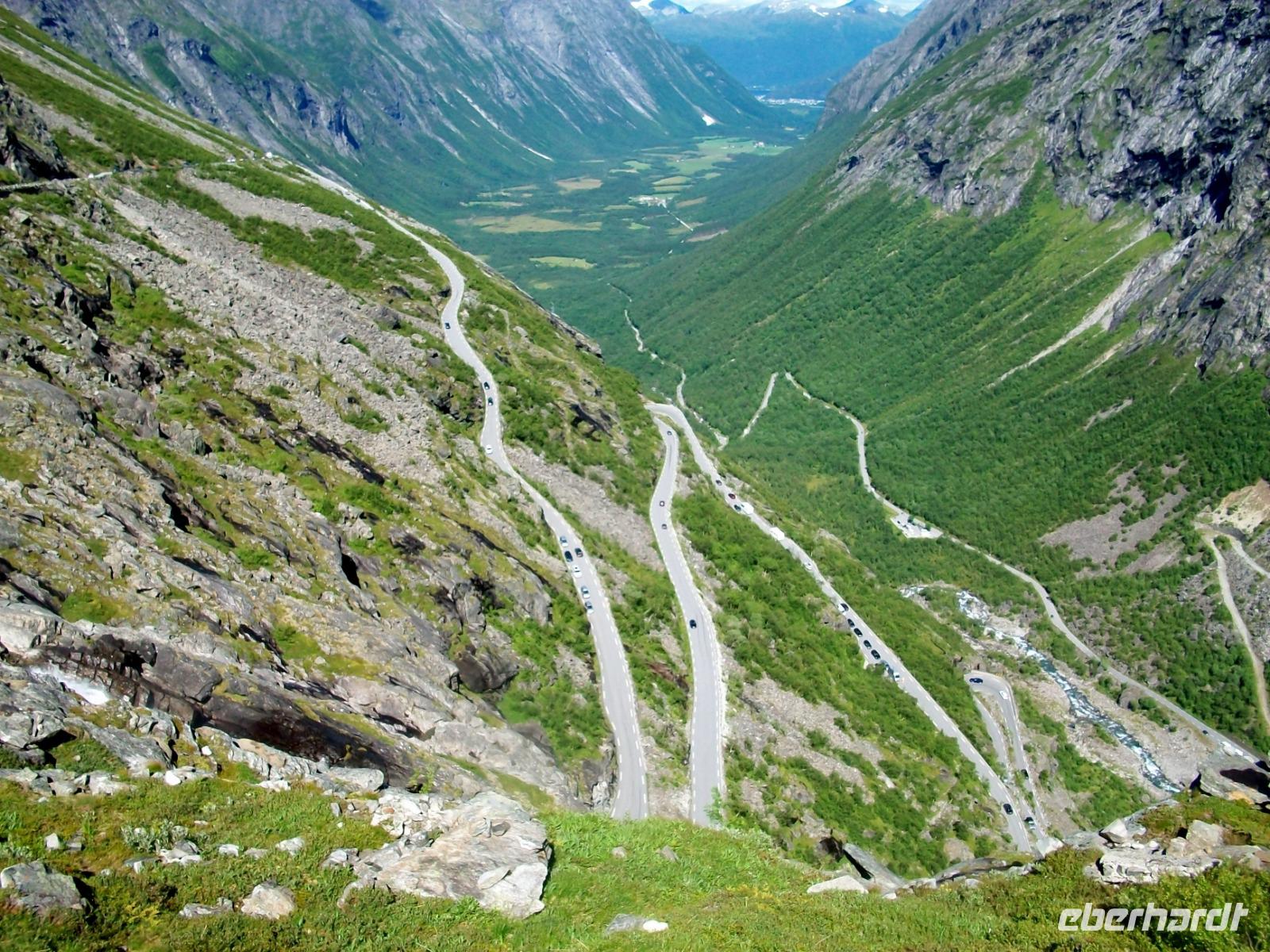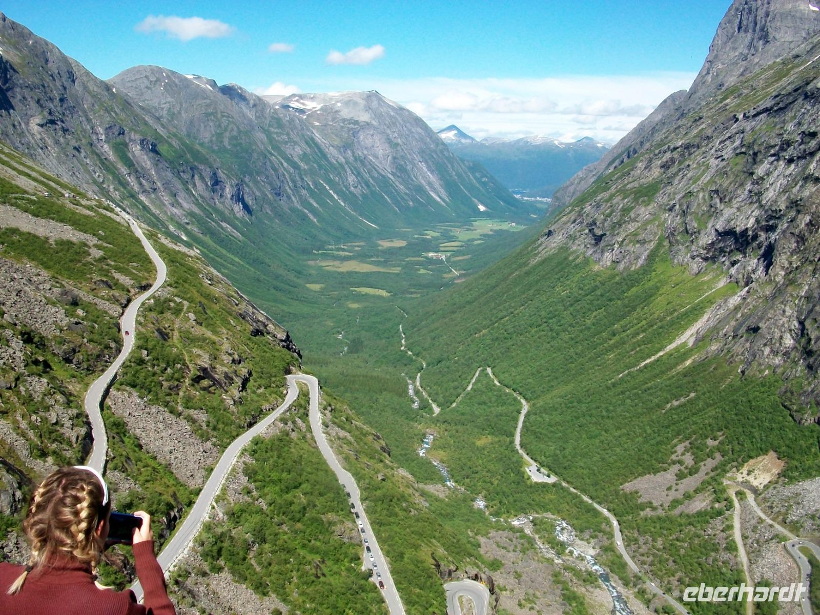 Dann steigen wir wieder ab auf Meeresniveau; ein weiterer Unterseetunnel bringt uns zu einer Fähre und, nach einer nicht allzu langen Fahrt am Fjord entlang, erreichen wir die spektakuläre Trollwand; sie steigt über einen Kilometer senkrecht an. Hier gönnen wir uns eine Stärkung und dann nehmen wir einen weiteren aufregenden Trip in Angriff. Über elf Haarnadelkurven erklimmen wir die Trollstigen; hier sollen einst die Riesentrolle ihre langen Leitern angelegt haben - wir nehmen die Straße. Roy, unser Chauffeur, zeigt hier nun seine ganze Fertigkeit und wir halten den Atem an, selbst ein Wasserfall kreuzt unsere Bahn.