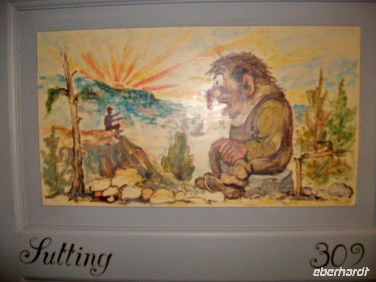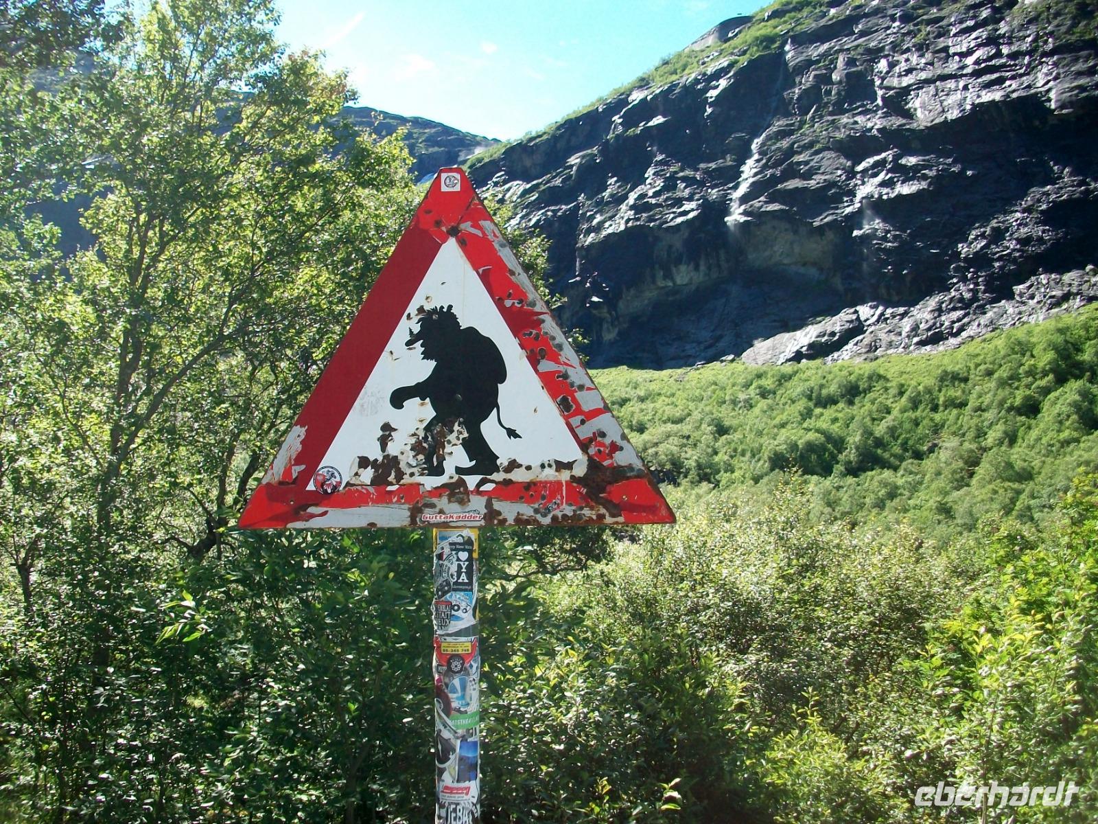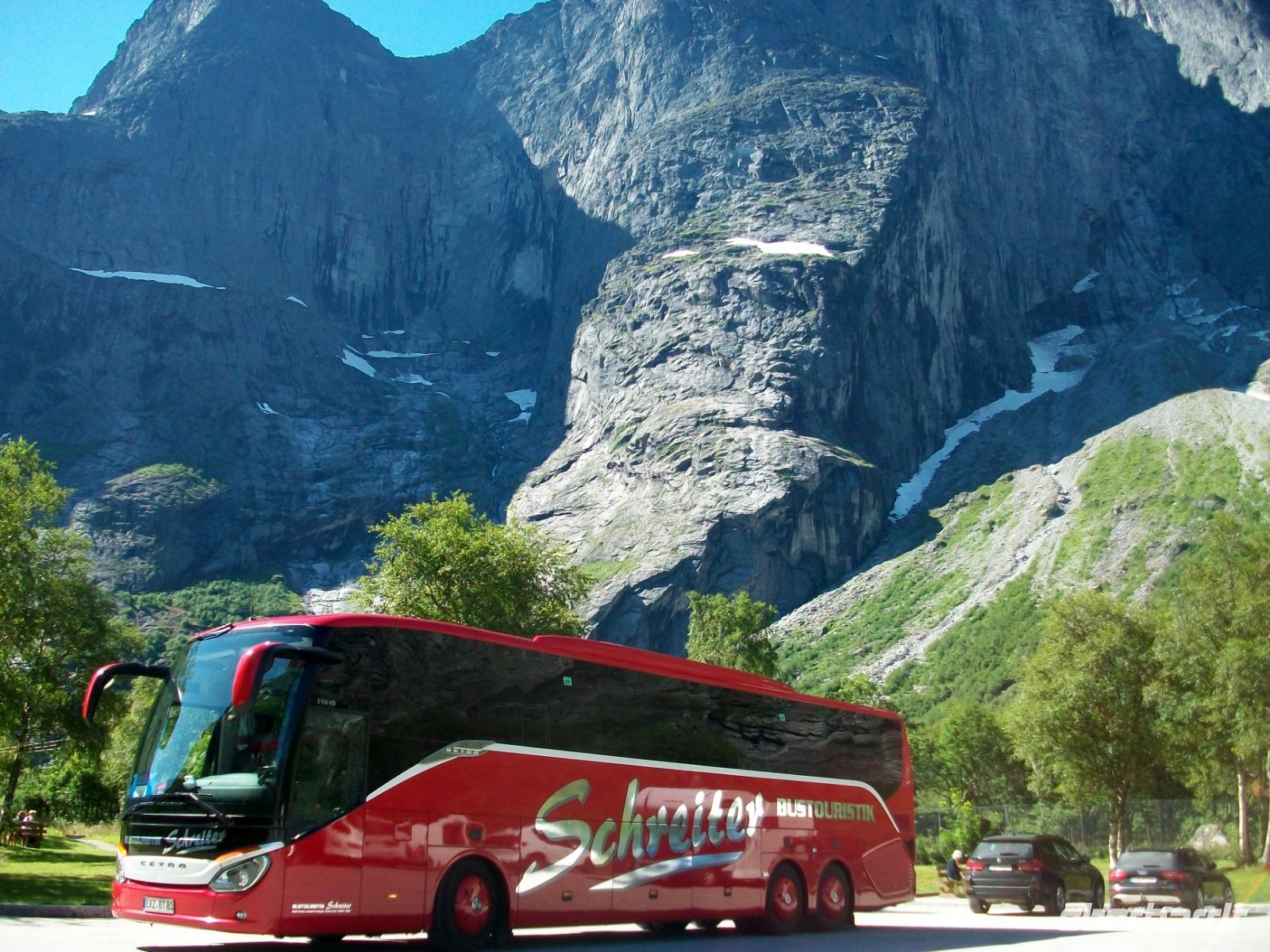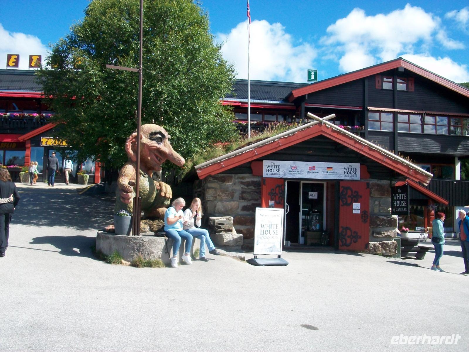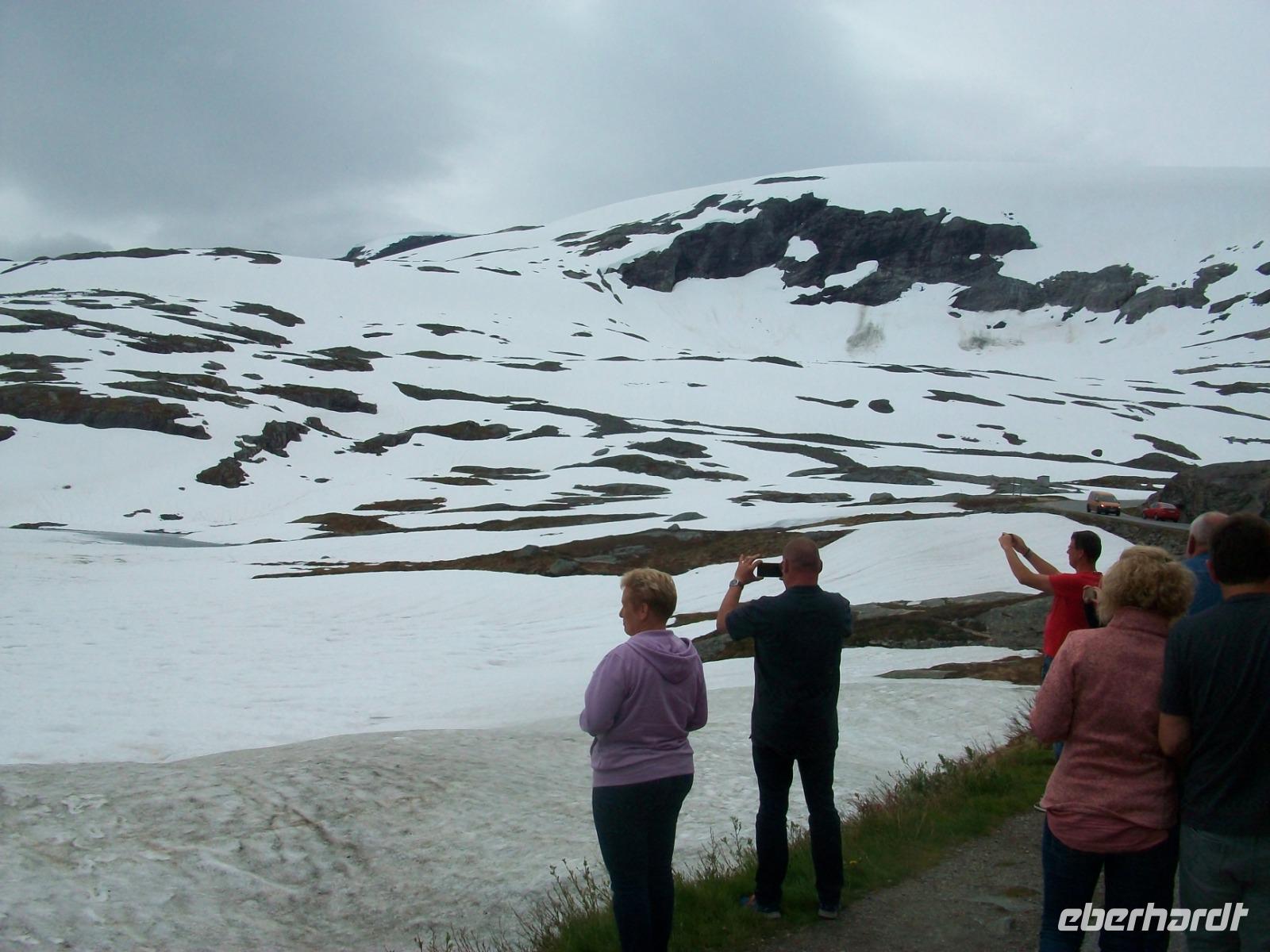 Dann steigen wir wieder ab auf Meeresniveau; ein weiterer Unterseetunnel bringt uns zu einer Fähre und, nach einer nicht allzu langen Fahrt am Fjord entlang, erreichen wir die spektakuläre Trollwand; sie steigt über einen Kilometer senkrecht an. Hier gönnen wir uns eine Stärkung und dann nehmen wir einen weiteren aufregenden Trip in Angriff. Über elf Haarnadelkurven erklimmen wir die Trollstigen; hier sollen einst die Riesentrolle ihre langen Leitern angelegt haben - wir nehmen die Straße. Roy, unser Chauffeur, zeigt hier nun seine ganze Fertigkeit und wir halten den Atem an, selbst ein Wasserfall kreuzt unsere Bahn.