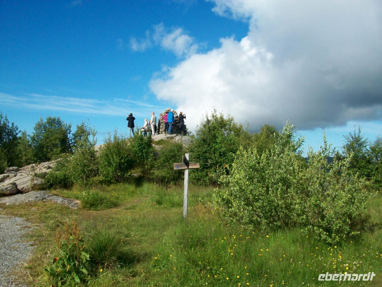 25.7.2020. Petrus hat seine gute Laune wieder zurück; Sonnenschein, blauer Himmel und leichte Schleierwolken versprechen uns wieder einen schönen Tag. Da lassen wir uns auch gar nicht lange bitten und starten gegen neun um schon nach wenigen Minuten 400 Meter anzusteigen und zwar auf den Hausberg von Molde, den Varden. Dabei gelangt unser Bus durch dichten Wald, oben angelangt zeigt sich uns aber das herrlichste Panorama was sich nur denken lässt. Unter uns die Stadt am Fjord, vor uns die schneebedeckten Berge der Romsdal - Alpen und hinter uns der Atlantik. Das Auge mag sich daran kaum satt sehen!