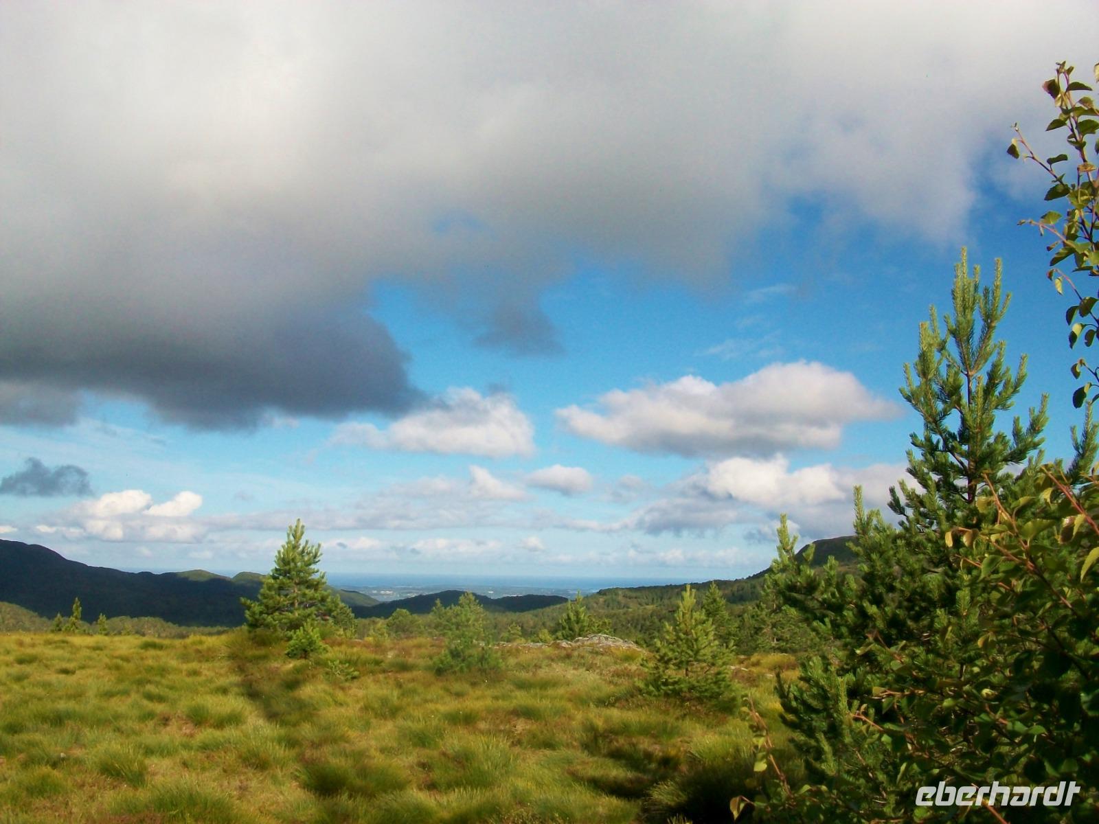 Dann senkt sich die Straße wieder ab; der Weg führt uns durch ein breites Flusstal langsam aber beständig bergab. Hier hat der Sommer wieder Einzug gehalten, aber auch einige Schauer begleiten uns während der Fahrt.
