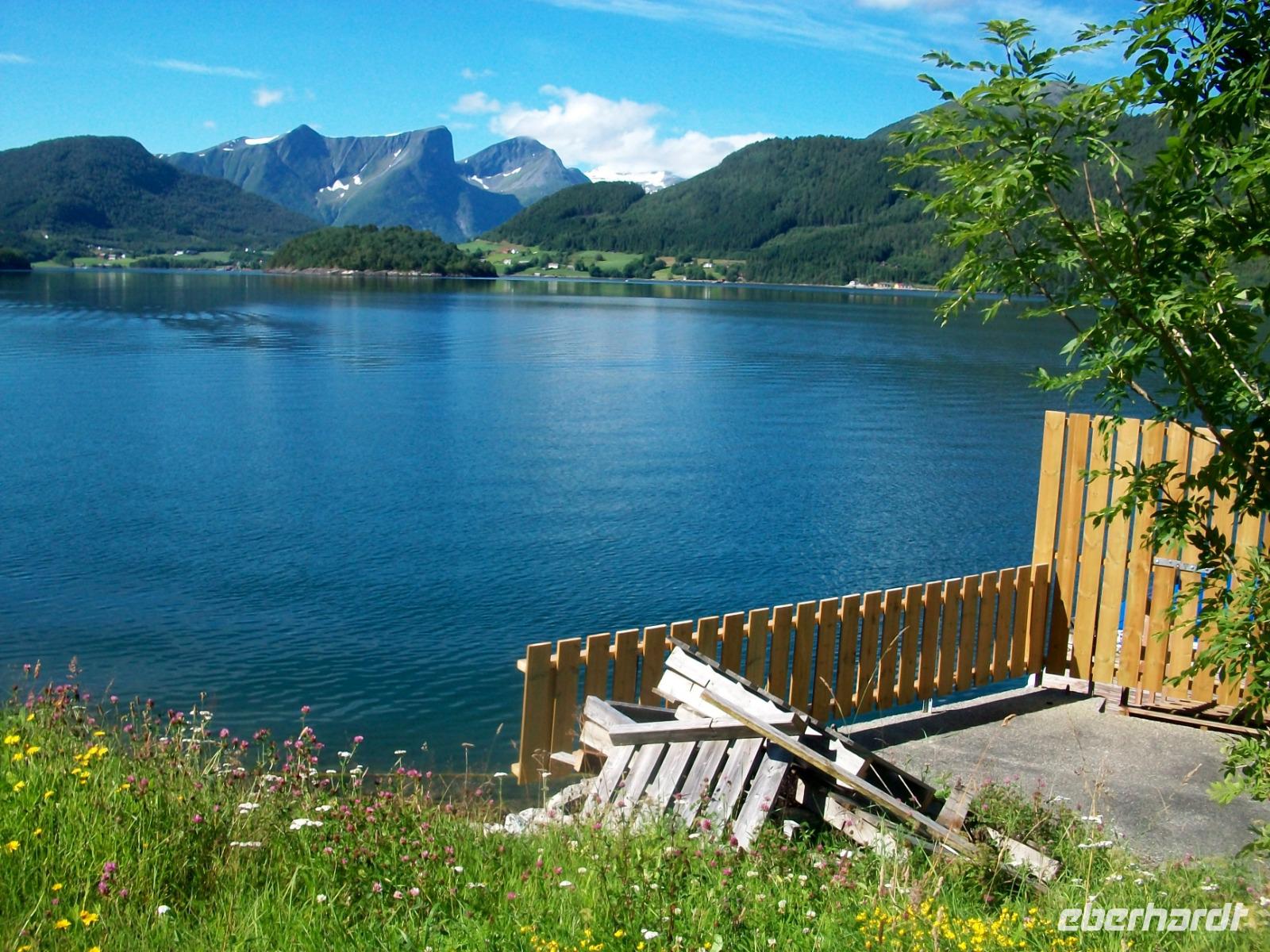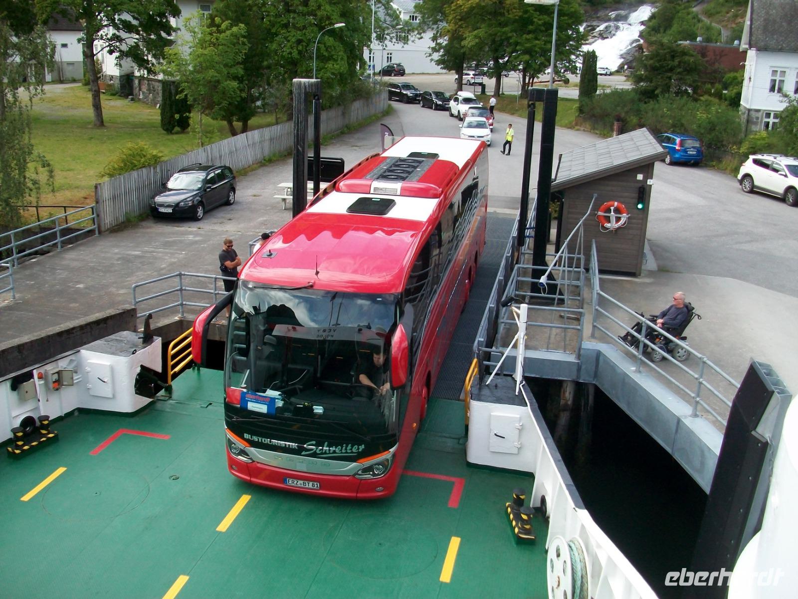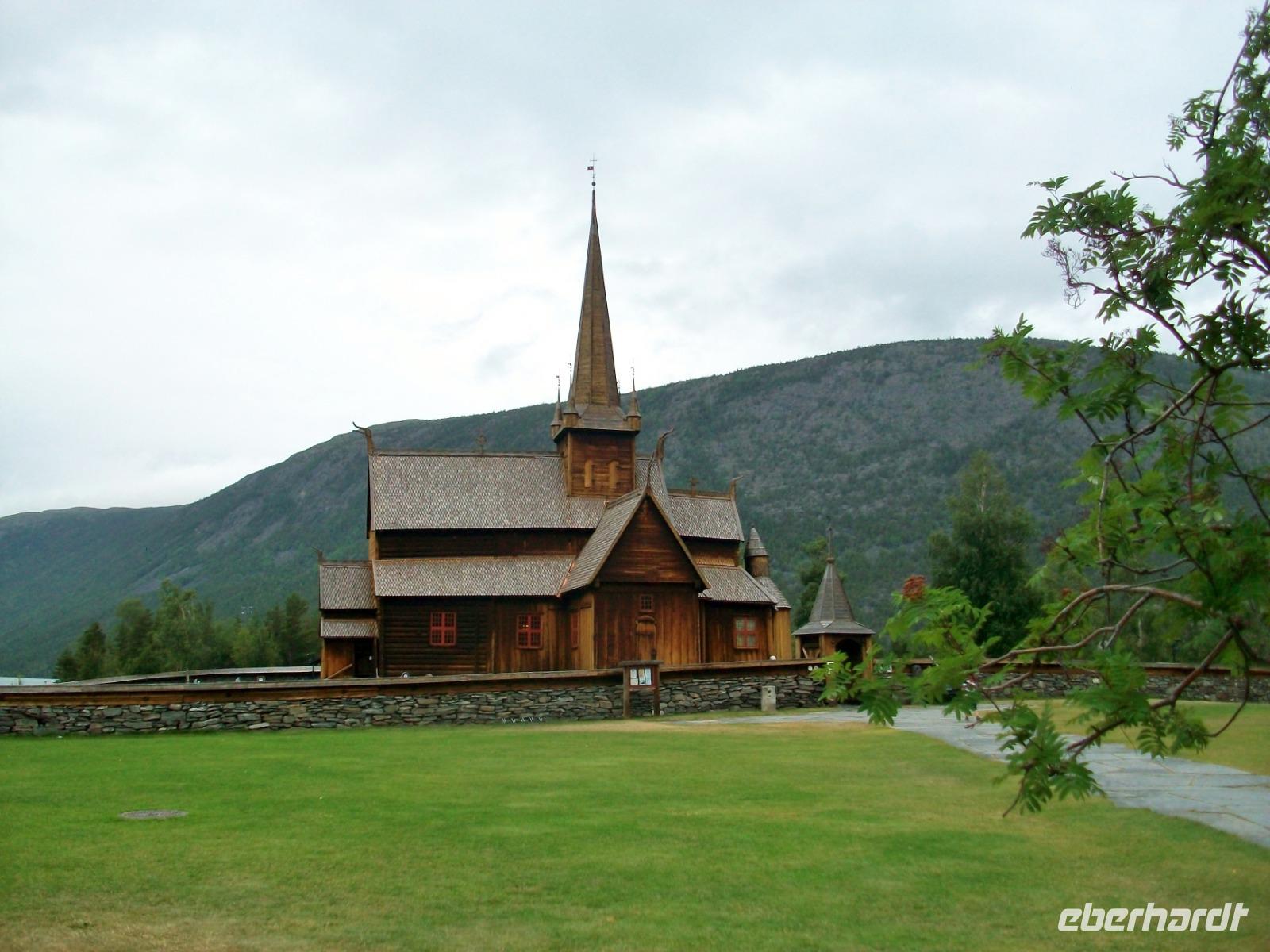 26.7.2020. Heute Morgen hat sich der Himmel etwas bezogen, das wird sich aber im Laufe des Tages ändern. Wir starten jedenfalls voller Tatendrang und gelangen nach noch nicht einmal einer halben Stunde zur Fähre mit welcher wir erneut einen Fjord überqueren werden. An Deck weht uns ein kühles Lüftchen entgegen, aber als wir dann durch ein grünes Tal fahren, kommt langsam die Sonne durch. Ein langer Tunnel führt uns direkt über den Geirangerfjord und an seinem Ende genießen wir einen grandiosen Blick mehrere hundert Meter über dem Wasser. Die Kreuzfahrt auf diesem Fjord wird nun das nächste große Erlebnis unserer Reise werden. Im kleinen Ort Hellesylt warten wir auf das Schiff welches auch bald um die Ecke kommend anlegt und uns, einschließlich Bus, in seinem Bauch aufnimmt. Schnell haben wir die Stufen zum Oberdeck erklommen, nun beginnt die Fahrt. Zunächst kommen wir an verlassenen Bauernhöfen vorbei, doch dann steigen die Berge in ungeahnte Höhen an und senden uns zahlreiche Wasserfälle von oben herab. Wir sehen die Sieben Schwestern, den Freier gegenüber und andere spektakuläre Fälle. Nach einer Stunde kommt dann der kleine Ort Geiranger in Sicht, hier endet, leider viel zu früh, die schöne Fahrt. Im Bus geht es von Bord und bald erklimmen wir wieder die Höhen welche uns weit über die Baumgrenze hinausbringen werden. Erneut zeigt Roy hier sein fahrerisches Können als er mühelos die scharfen Kehren und die schmale Straße meistert. Oben angelangt sehen wir einen, jetzt im Sommer, immer noch zugefrorenen See der von schneebedeckten Bergen umgeben ist; als Kontrast durchfahren wir im Anschluss das Otta - Tal mit seiner grünen und üppigen Vegetation. Als wir dann im Ort Lom anlangen tröpfelt es leicht; in der bekannten Stabkirche kommen wir in den Genuss einer wissenswerten Führung und im Anschluss geht es noch eine halbe Stunde weiter zu dem einstigen Bauernhof und heutigem Erlebnishotel Elveseter.