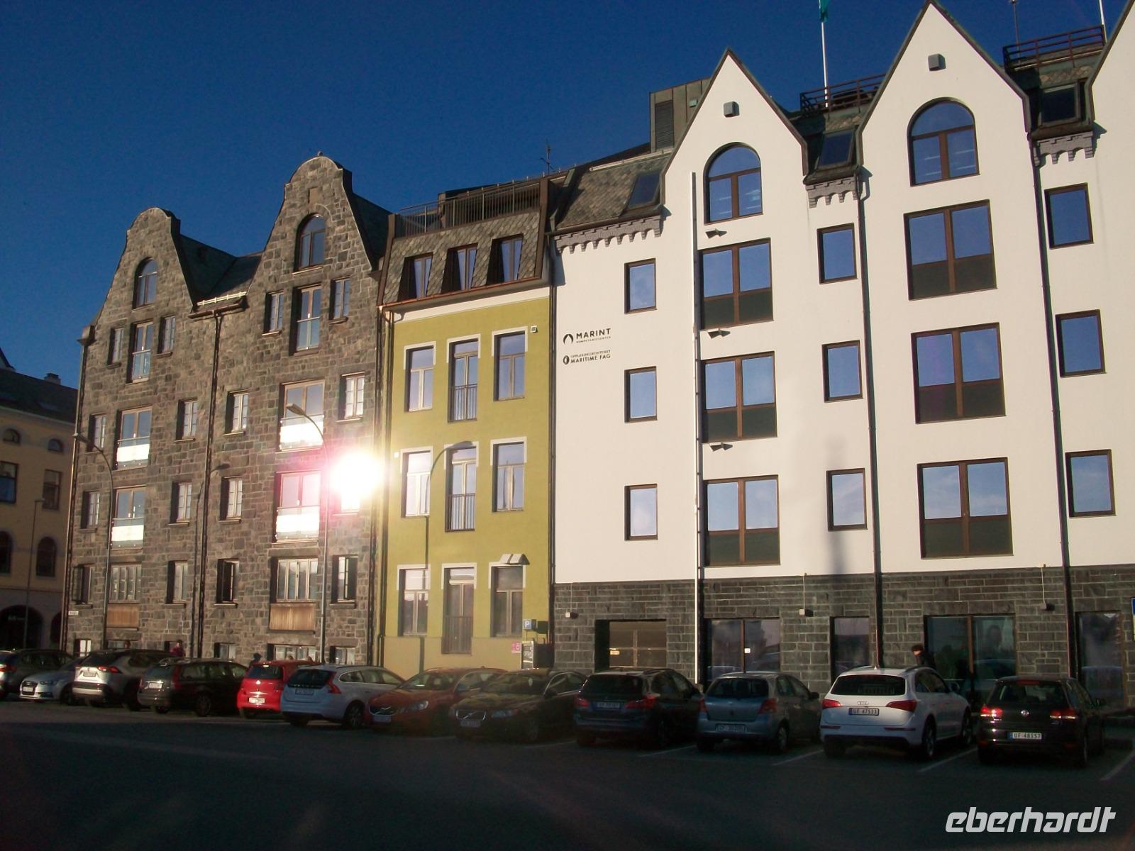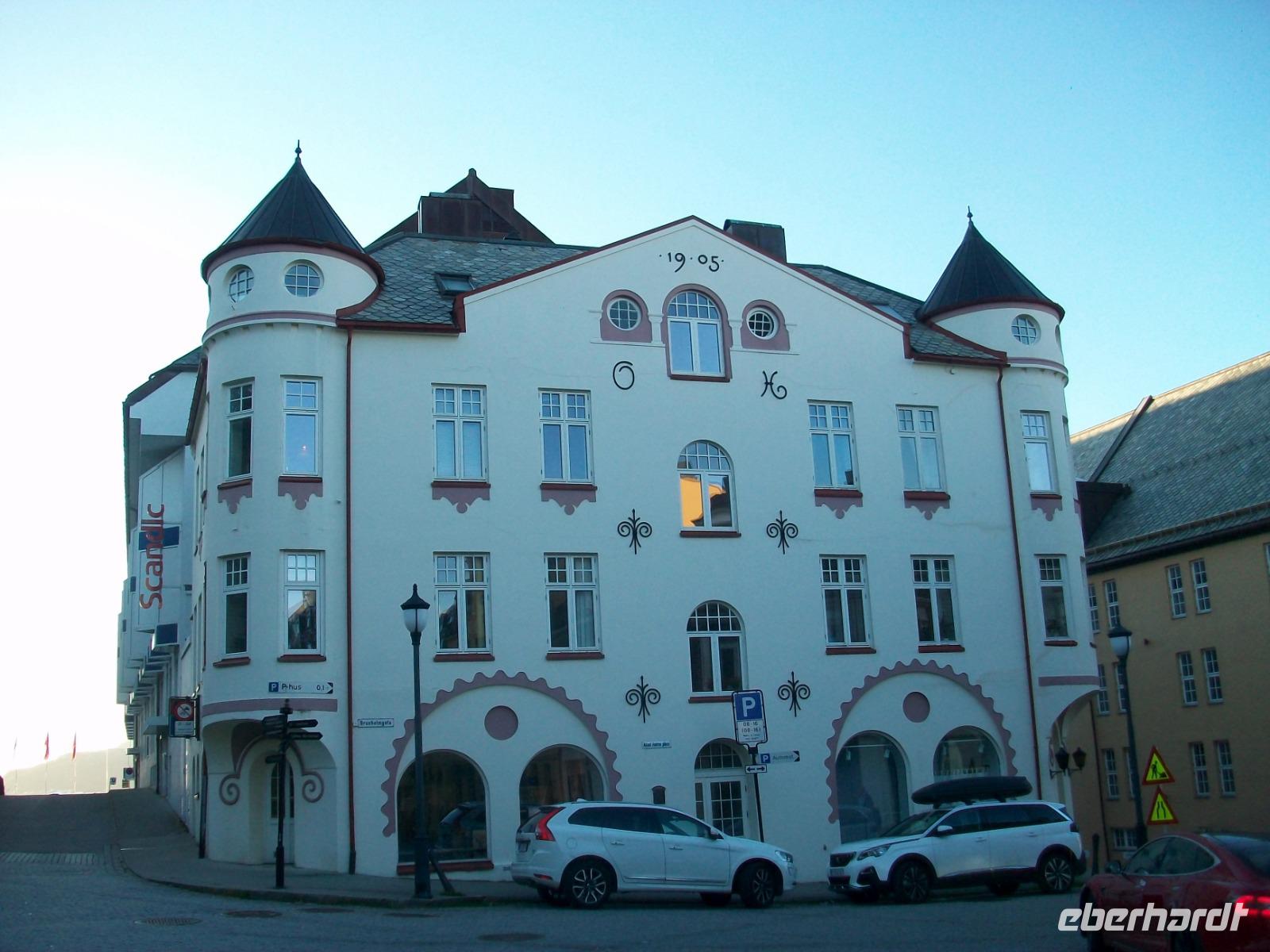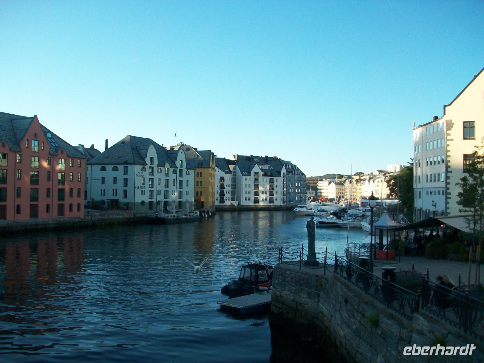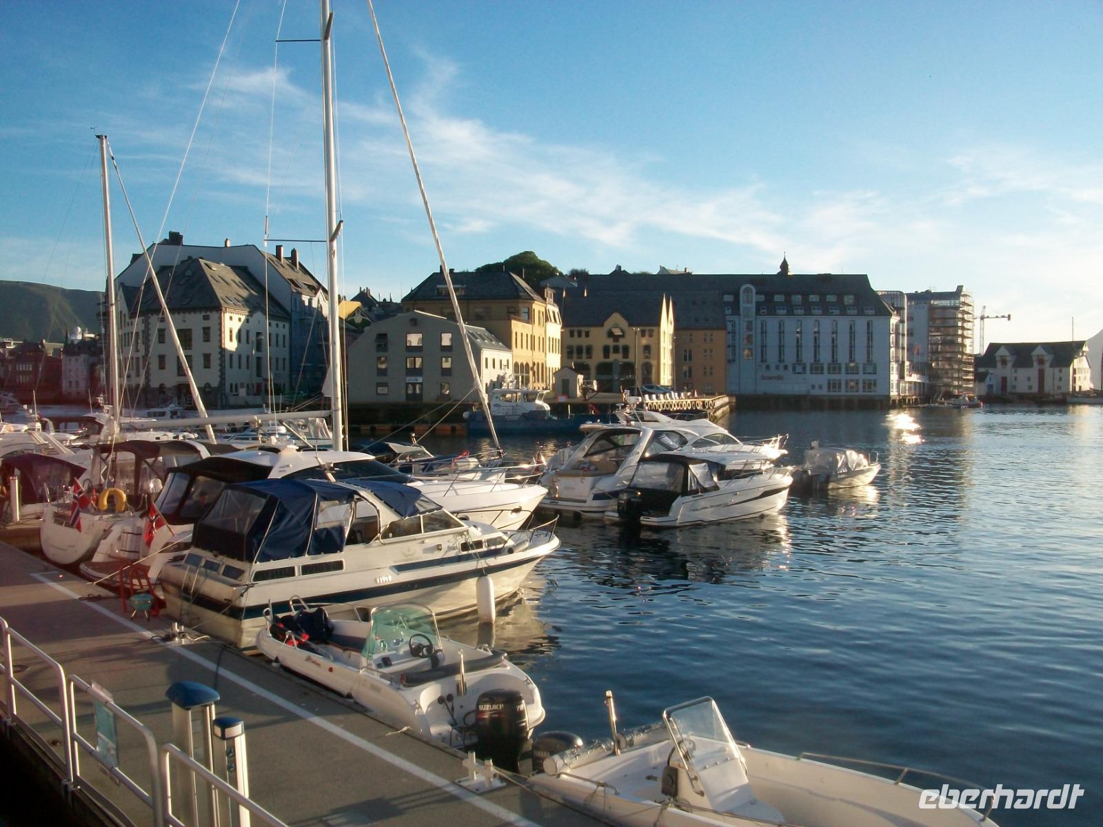 Unser Zielort Ålesund empfängt uns mit strahlendem Sonnenschein; Zeit um mit einem Spaziergang die schöne Jugendstilarchitektur zu entdecken oder vom Hausberg einen grandiosen Blick auf den Ort und die Inseln die ihn umgeben zu werfen.