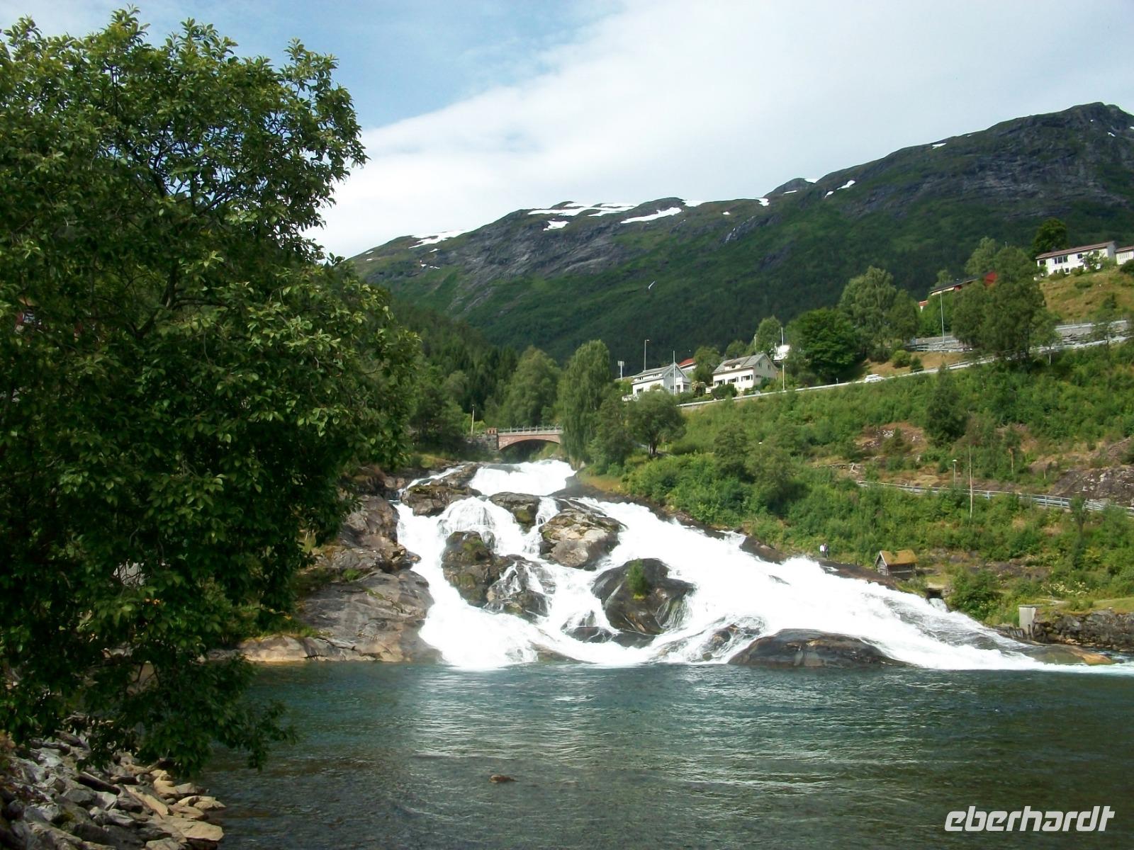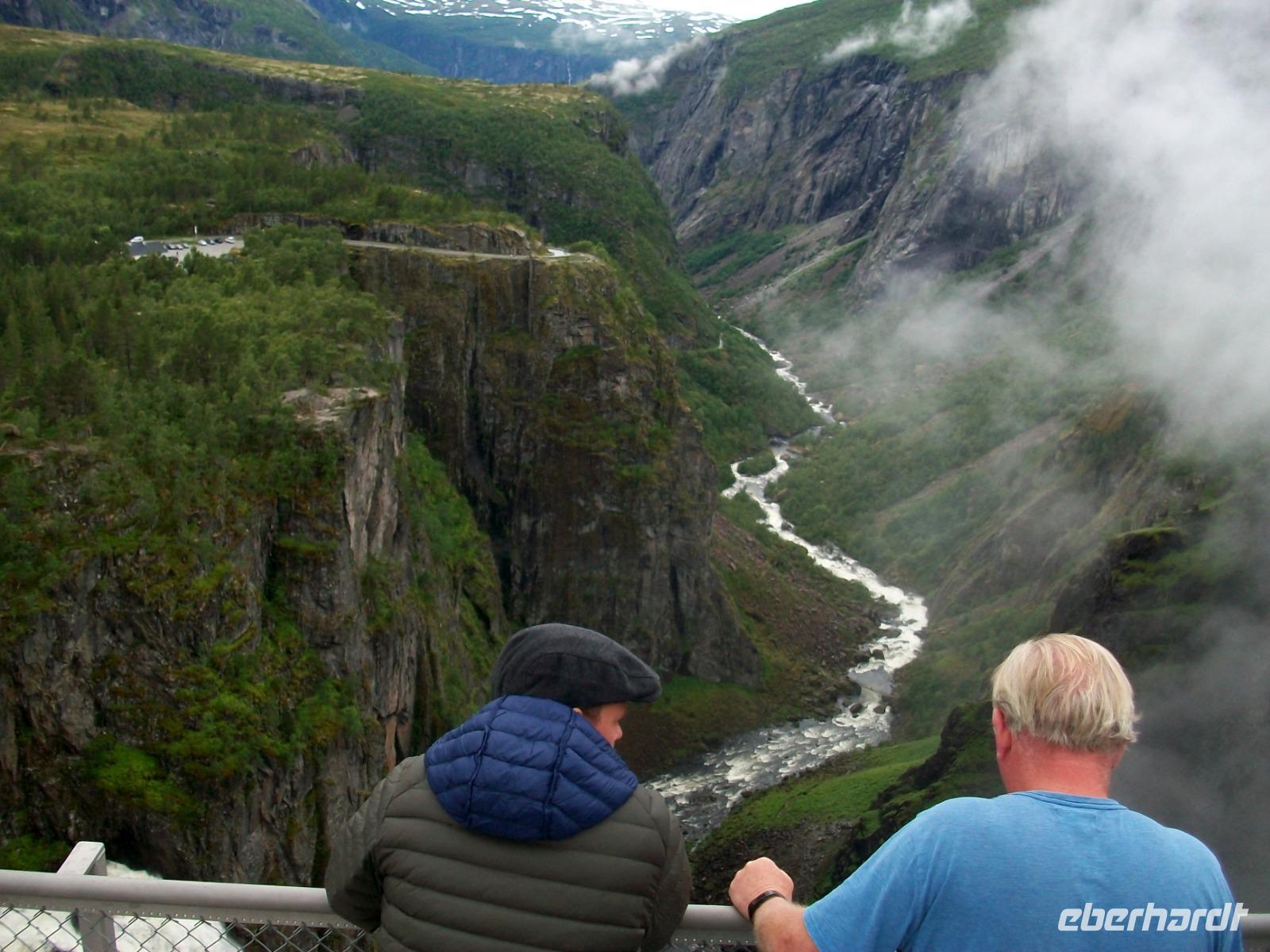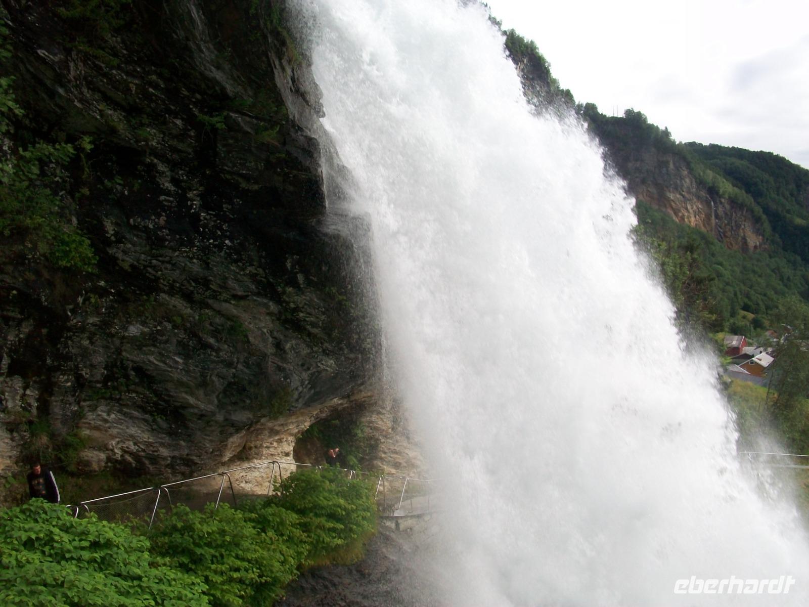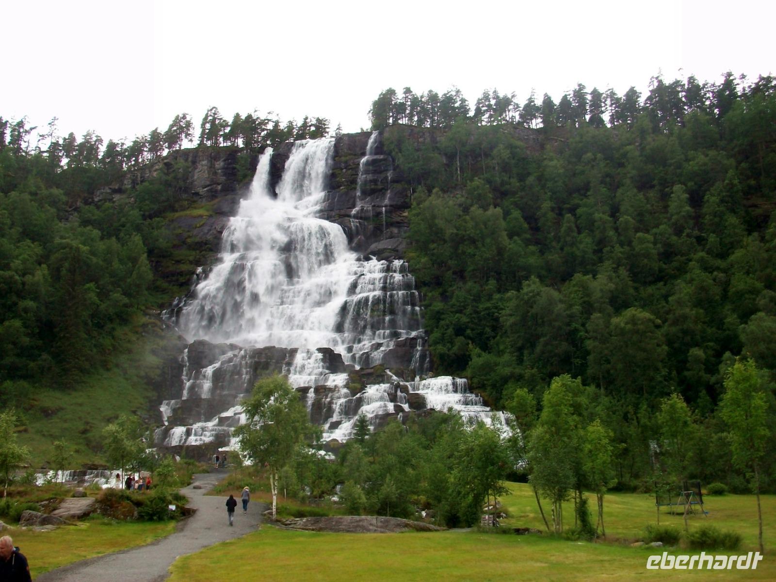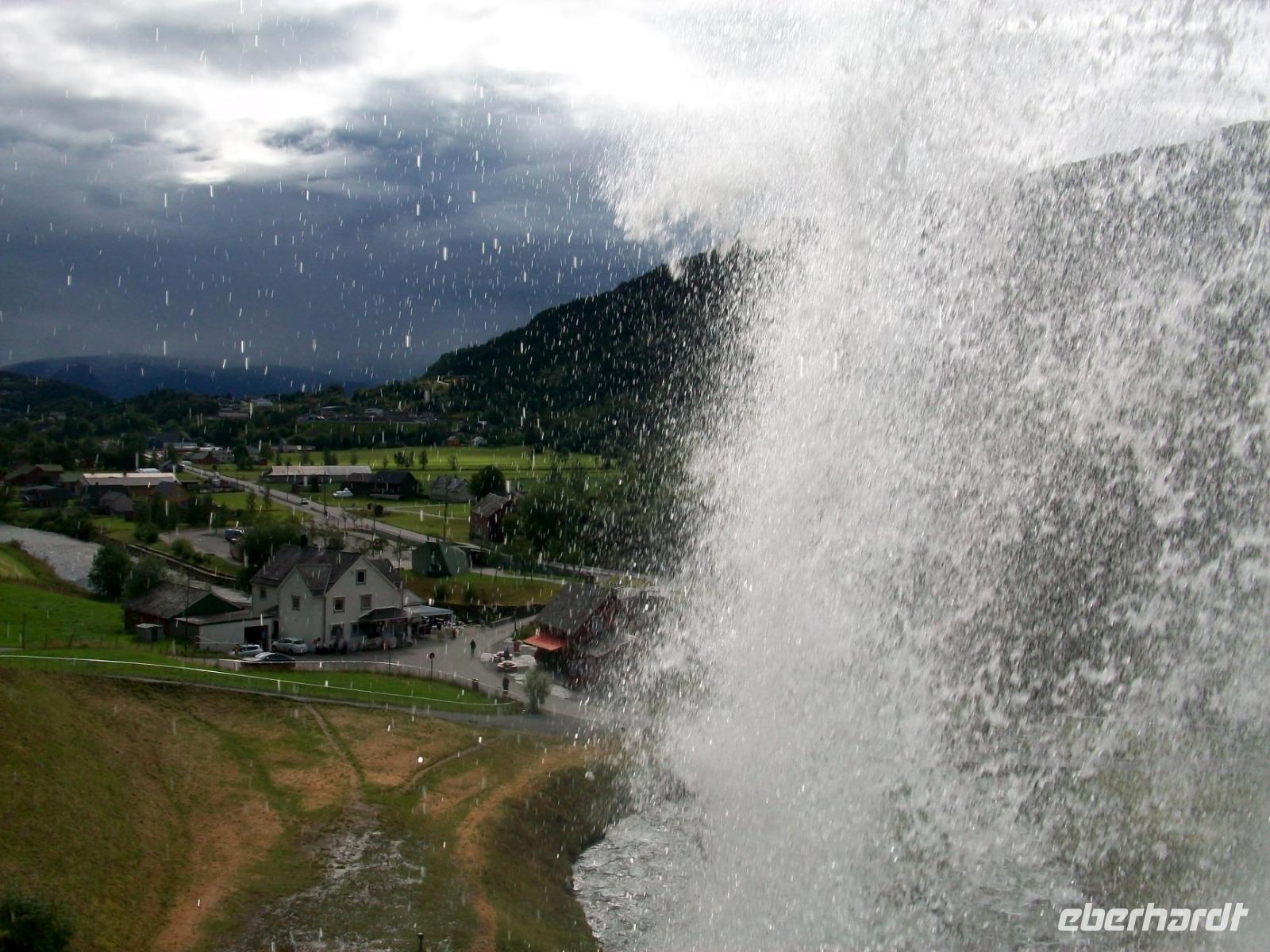 Ein ganz besonderer Ort ist Flåm. Von hier führt eine bekannte Bahnstrecke hinauf in erzreiche Berge, und hier unten, malerisch am Fjord gelegen, genehmigen wir uns eine Mittagspause. In rascher Folge ziehen Wolken über die Erhebungen die uns umgeben, nach einer genussvollen Stunde machen wir uns aber doch auf um einen besonderen Wasserfall zu besuchen, es ist der Tvindefoss. Staunend stehen wir vor den Kaskaden die das Wasser überwindet und müssen dabei den Kopf schon in den Nacken legen, das nasse Element stürzt sich aus mehr als hundert Metern herab.