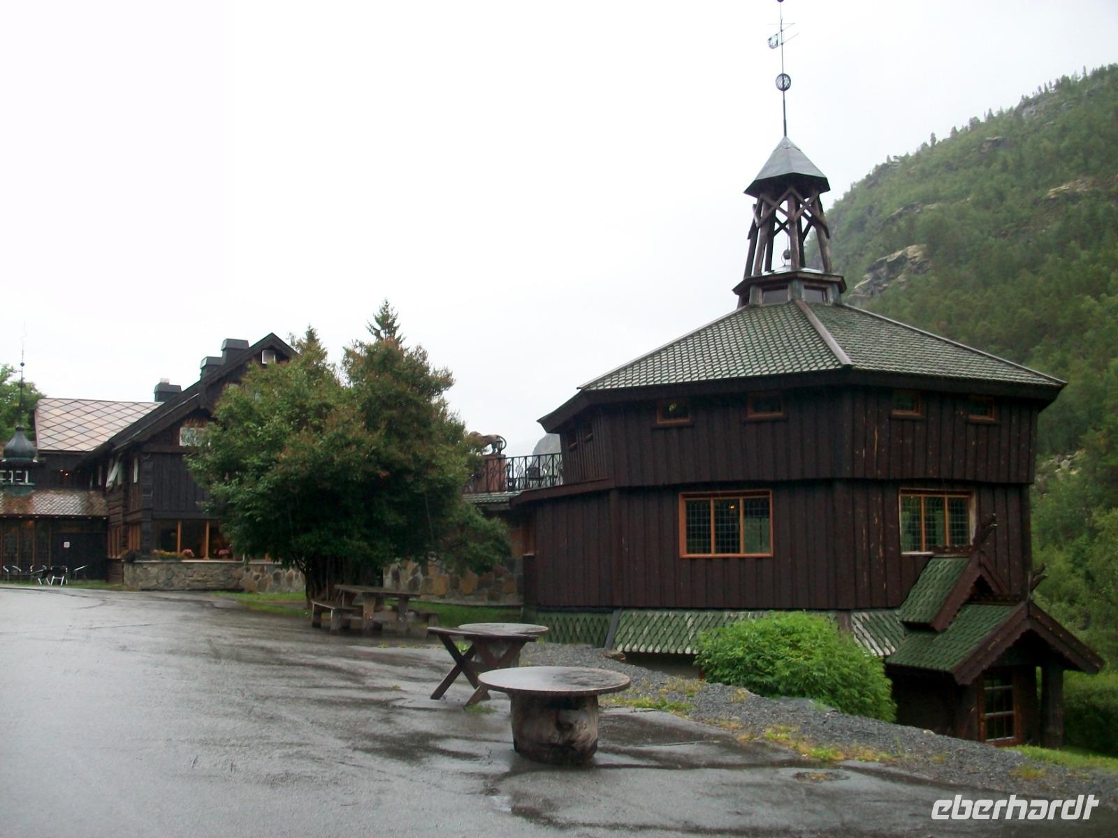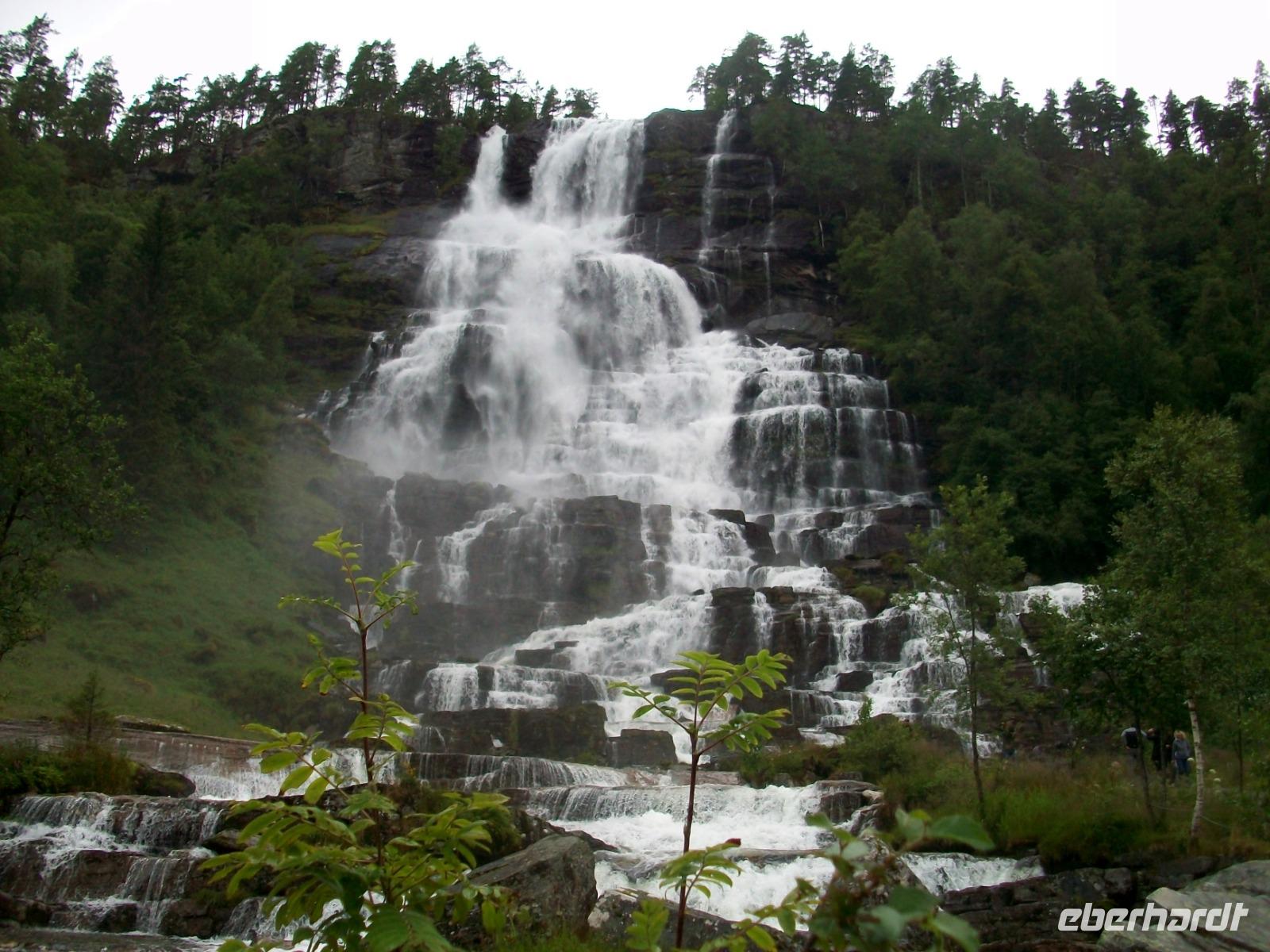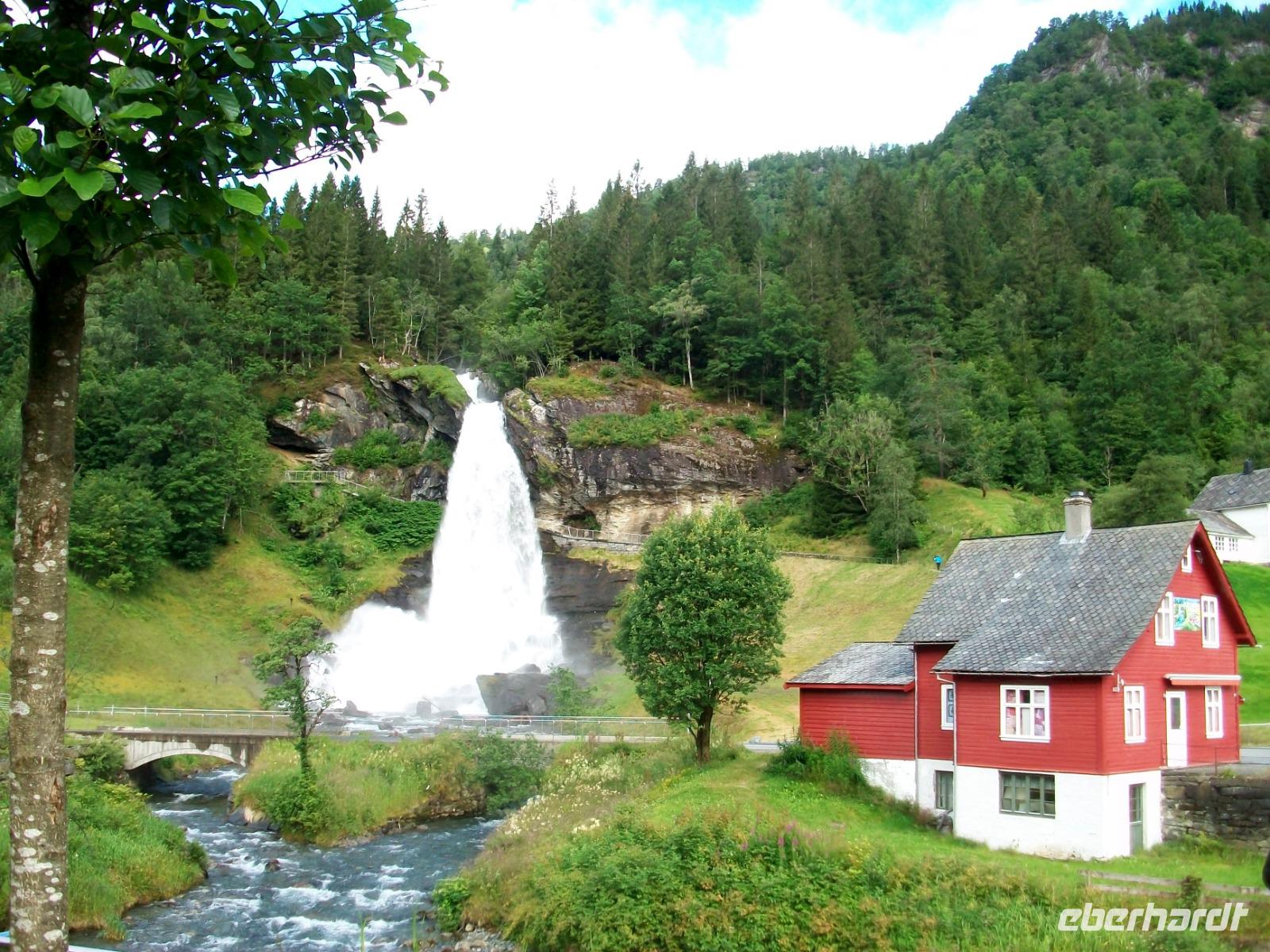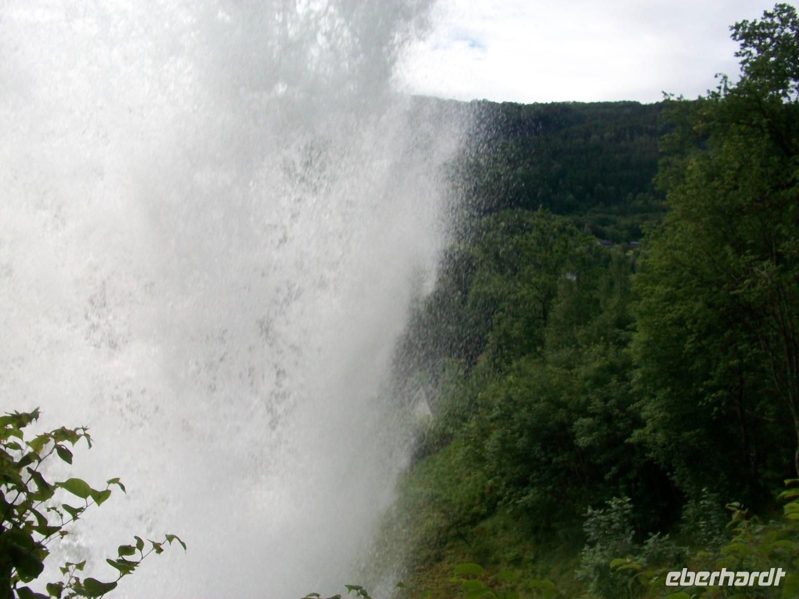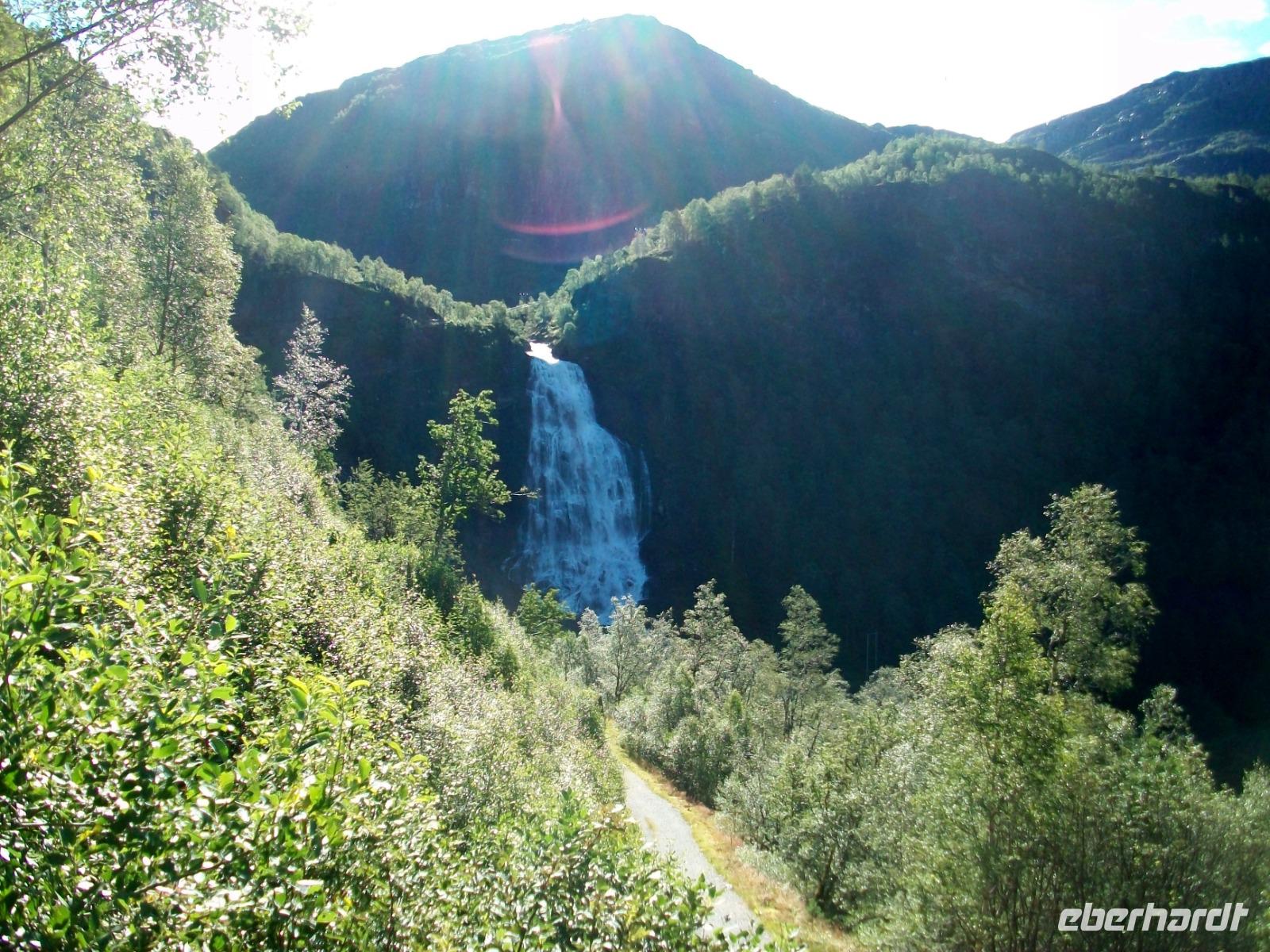 Ein ganz besonderer Ort ist Flåm. Von hier führt eine bekannte Bahnstrecke hinauf in erzreiche Berge, und hier unten, malerisch am Fjord gelegen, genehmigen wir uns eine Mittagspause. In rascher Folge ziehen Wolken über die Erhebungen die uns umgeben, nach einer genussvollen Stunde machen wir uns aber doch auf um einen besonderen Wasserfall zu besuchen, es ist der Tvindefoss. Staunend stehen wir vor den Kaskaden die das Wasser überwindet und müssen dabei den Kopf schon in den Nacken legen, das nasse Element stürzt sich aus mehr als hundert Metern herab.