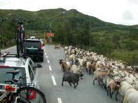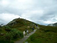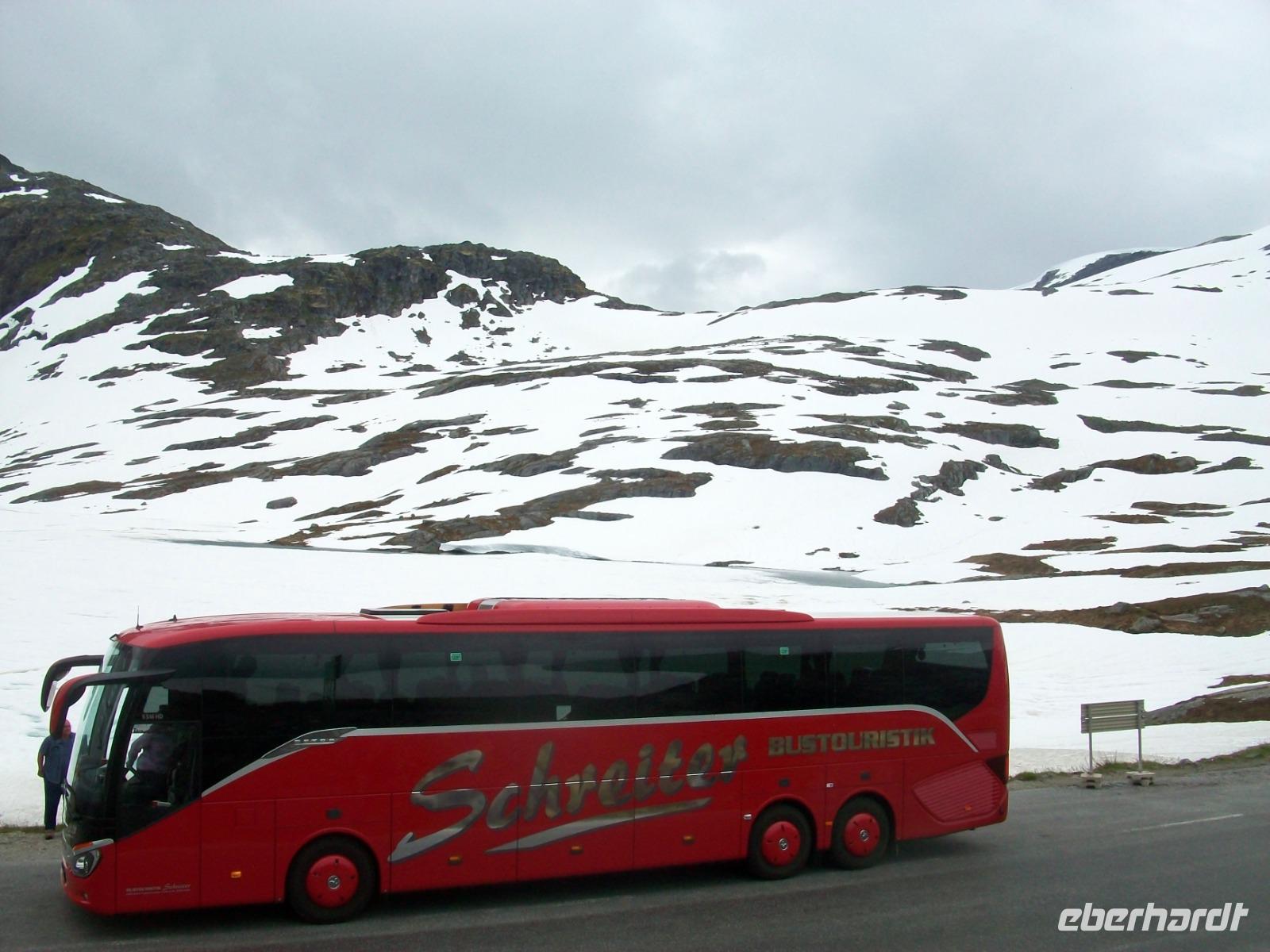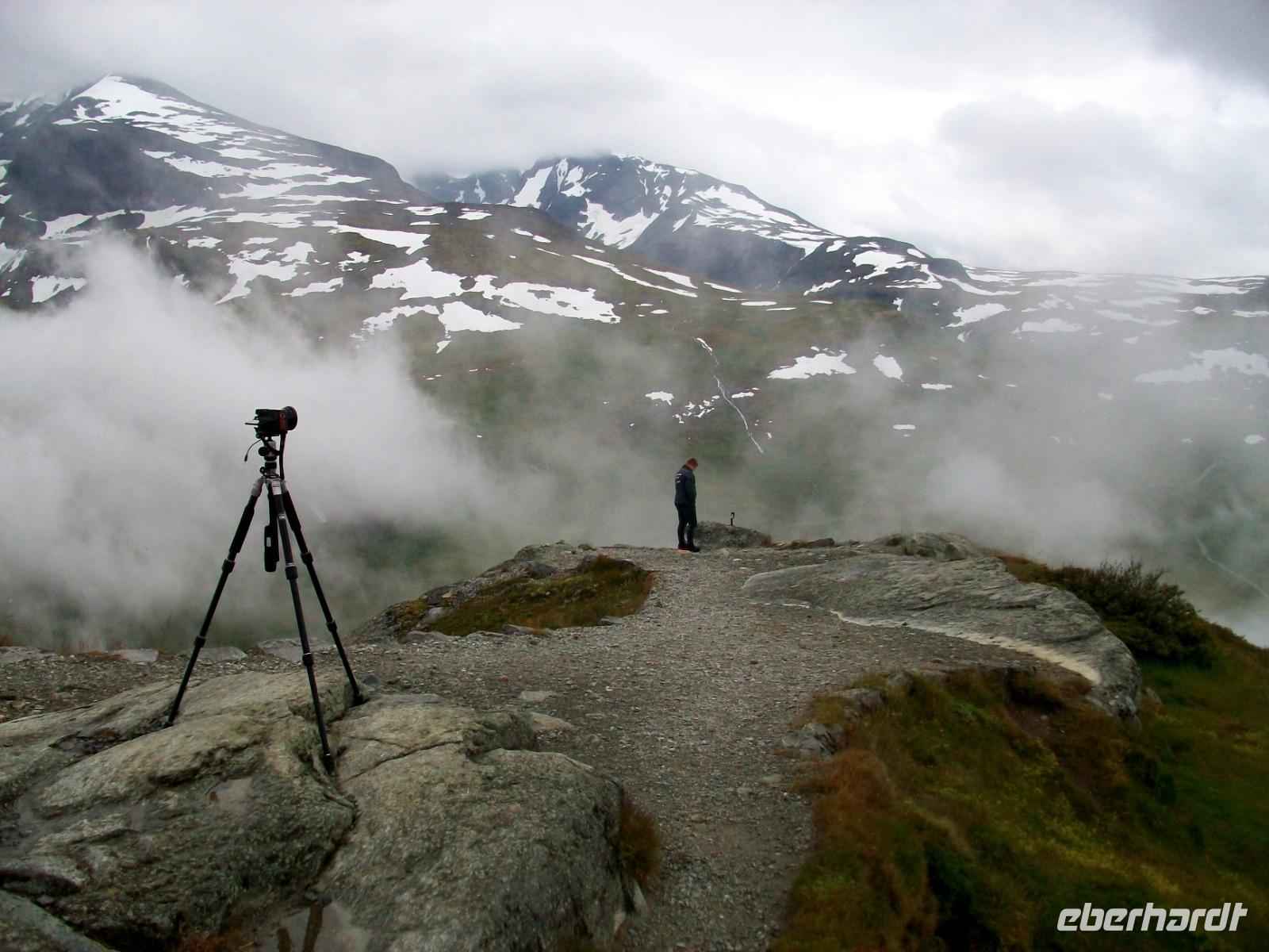 27.7.2020. Zaghafte Sonnenstrahlen stehlen sich durch die Wolken die auf den Erhebungen des Jotunheimen liegen und dringen durch das Fenster meines gemütlichen Zimmers im Bauernstil. Auf geht's! Nach dem uns das Frühstück die erste Stärkung des Tages brachte, wollen wir an diesem Vormittag erneut zu einem Fjell aufsteigen und uns damit noch einmal in den Winter begeben. Von links und rechts rauschen die Wasserfälle zu Tal, dazu tröpfelt es wieder leicht aber das stört uns im Bus sitzend nicht. Gar nicht weit und einige Serpentinen höher, breitet sich nun das schneebedeckte Sognefjell vor unseren Augen aus. Hier ist die Schneeschmelze, Ende Juli, erst einmal in vollem Gange und fasziniert schauen wir über diese alpine Landschaft. Schmal und kurvenreich ist auch diese Straße, bleigraue Wolken hängen regenschwer über den Bergen und so manch kleine Schafherde trotzt diesen rauen Bedingungen. Doch dann geht es merklich bergab; das Grün dominiert wieder unseren Blick und am Storefjord haben wir das Meeresniveau erneut erreicht. Immer entlang der Straße, welche uns an den Fjorden vorbei führt, geht unsere Reise; die Sonne zeigt sich nun auch wieder und bei Mannheller kreuzen wir mit einer weiteren Fähre einen Fjord.