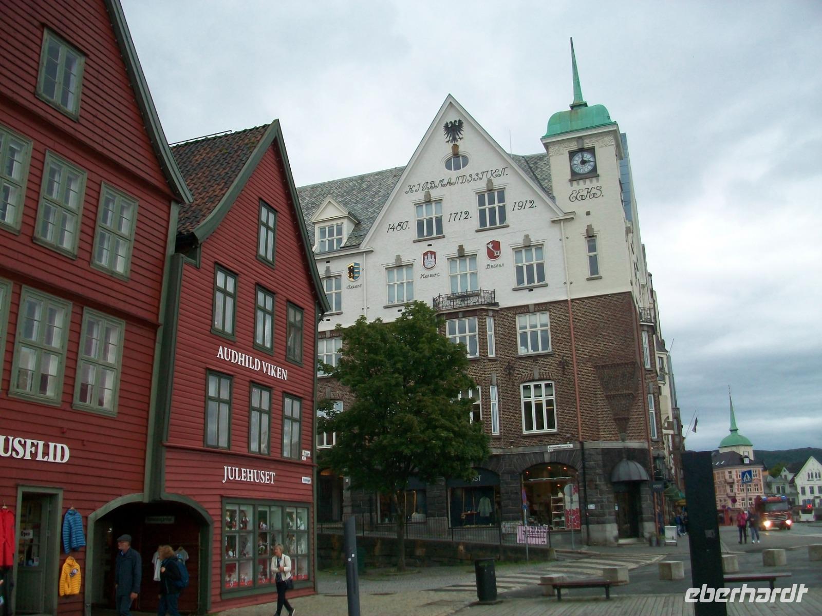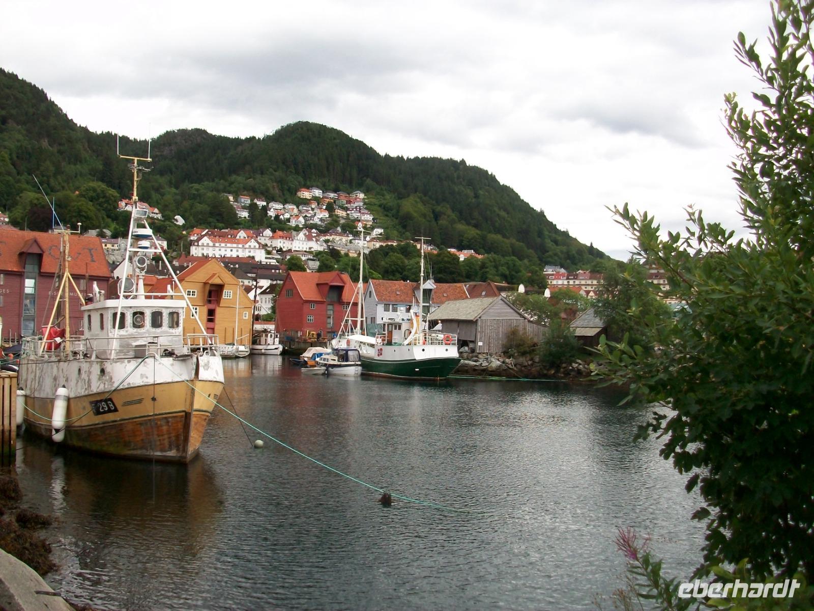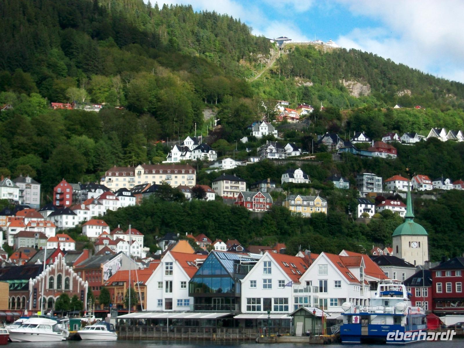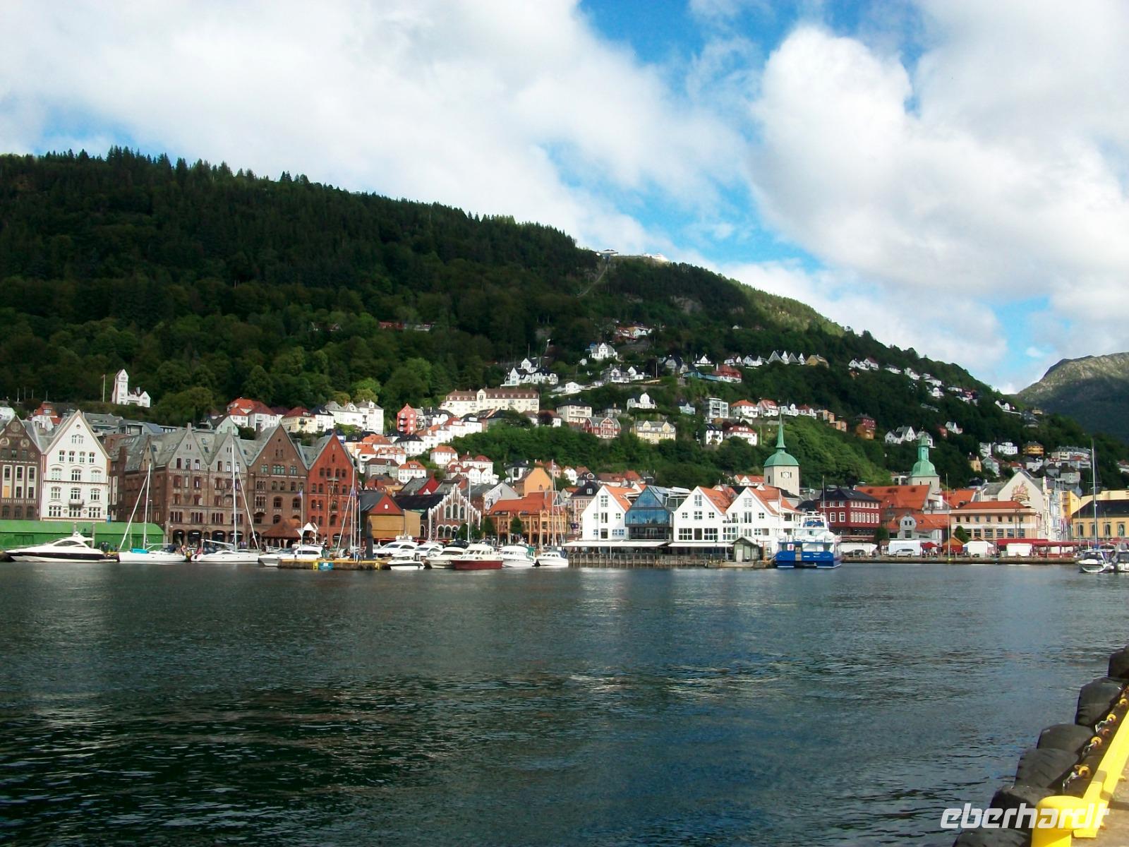 Aber, so schlimm wird es nicht; als wir uns mit dem Bus in Bewegung setzten, hat der Regen aufgehört und wir machen uns auf um eine der schönsten Städte Skandinaviens kennenzulernen. Zunächst geht es etwas nach außerhalb und wir sehen, neben schönen Häusern auch die Technologiezentren, für welche Bergen so bekannt ist. Ein kleines Schlösschen zeigt sich uns etwas später, hier wohnt über den Sommer an einigen Tagen die Königsfamilie. Dann geht es wieder zurück zum Zentrum; einige Fotostopps erlauben uns ganz besondere Perspektiven auf Stadt, Meer und die Schiffe die hier vertäut liegen. Nachdem wir solcherart Bergen vom Bus aus kennenlernen durften, unternimmt Andrea mit uns noch einen Spaziergang zwischen den uralten Holzhäusern von Bryggen. Dieses wirklich einmalige Ensemble beherbergte einst die Kontore der Hanse und diente außerdem den Mitarbeitern als Wohnquartier. Auf unsrem Spaziergang drehen wir nun die Uhren gleich um mehrere Jahrhunderte zurück und erahnen das Leben der Männer von damals. Wieder am Wasser angelangt, mit Blick auf die Frontseite der bunten Holzhäuser, verabschiedet sich unsere sympathische Führerin und nun beginnt für alle die wohlverdiente Freizeit im reizvollen Bergen. Zahlreich sind hier die Angebote: Ein leckerer Fischteller auf dem Fischmarkt, die Auffahrt mit der Fløybahn zum Hausberg mit einer grandiosen Sicht, der Besuch eines der zahlreichen Museen, ich glaube es ist für alle etwas an diesem Tag dabei gewesen, auch für diejenigen welche einfach nur etwas Bummeln wollten. Petrus war uns gnädig, auch wenn sich die Sonne nicht blicken ließ, geregnet hat es aber auch nicht und das will für Bergen schon etwas heißen!