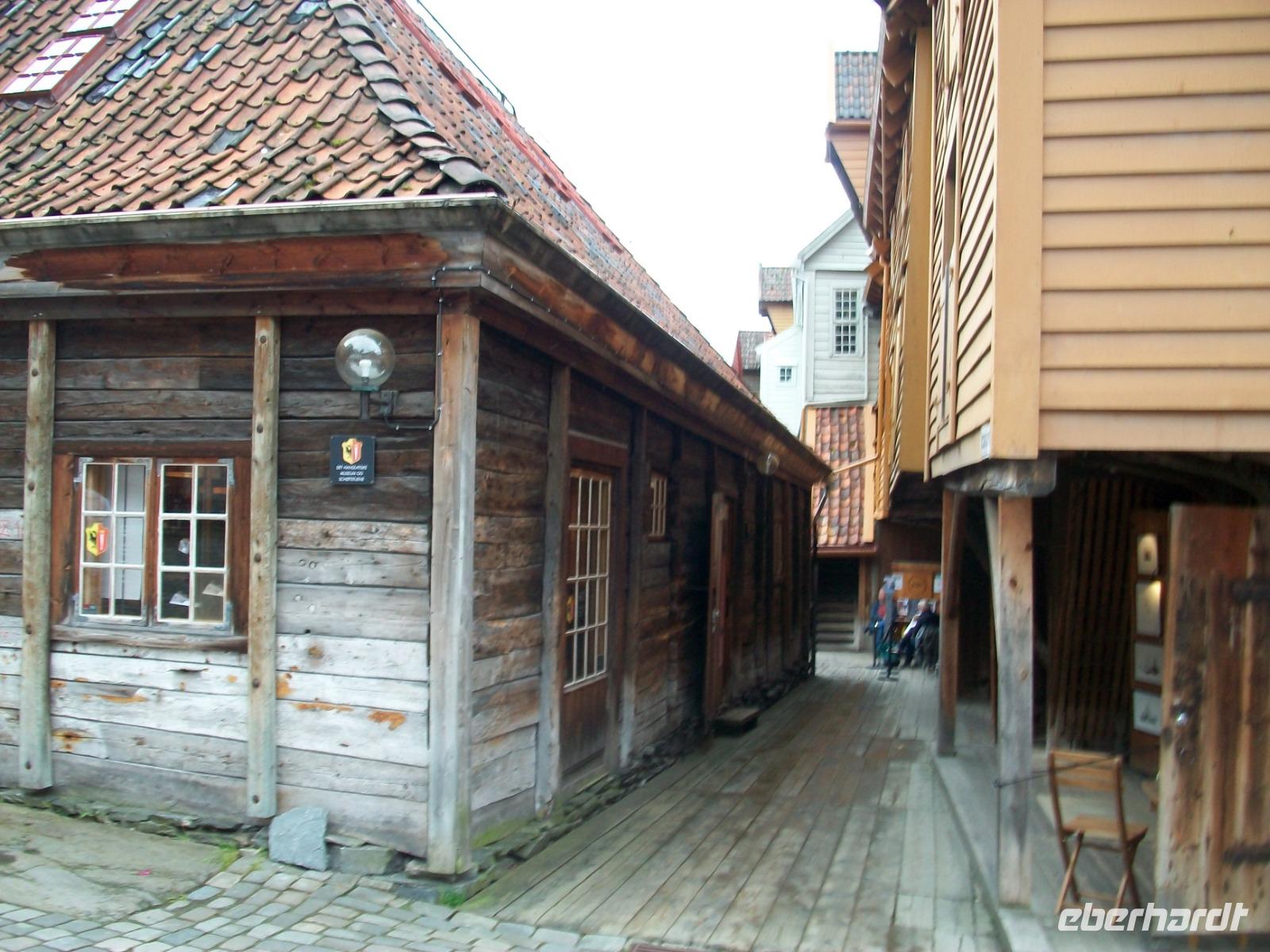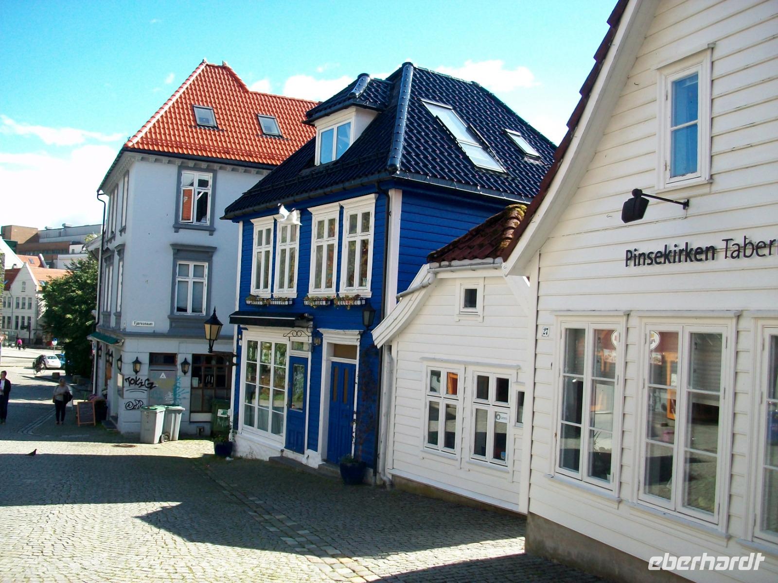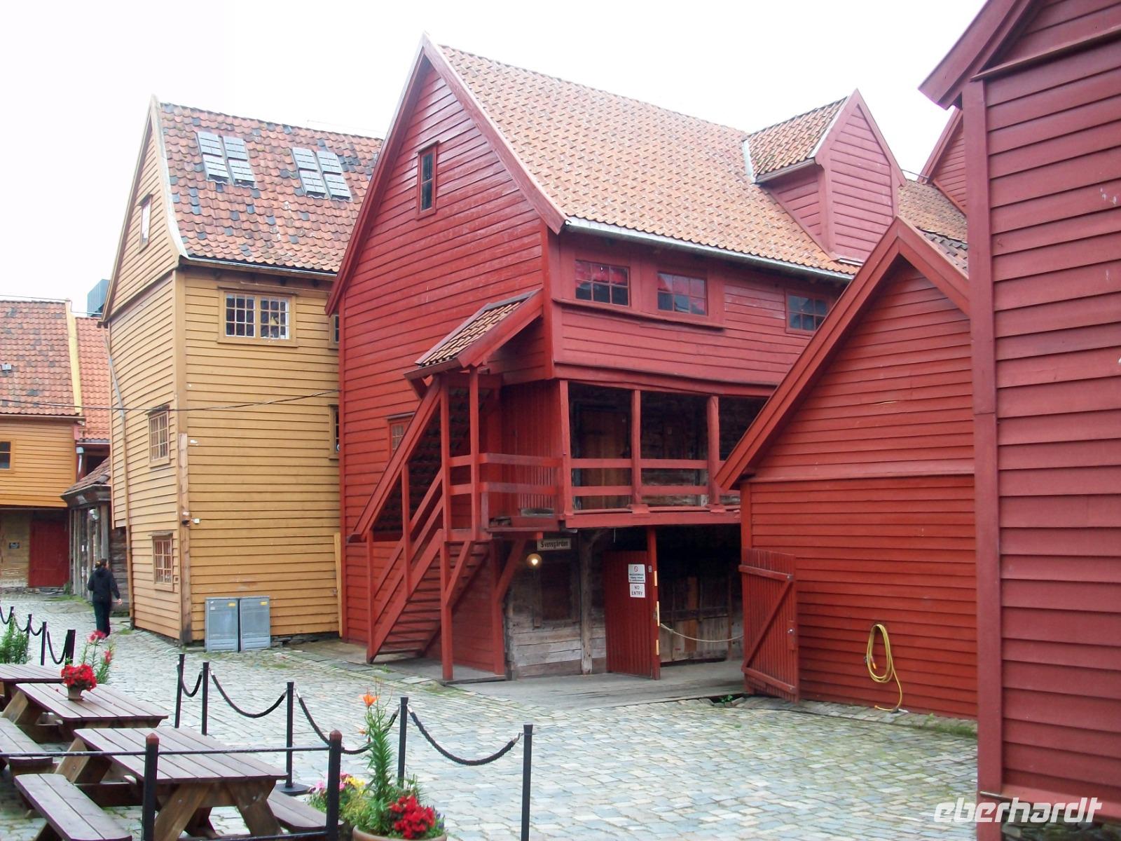 Aber, so schlimm wird es nicht; als wir uns mit dem Bus in Bewegung setzten, hat der Regen aufgehört und wir machen uns auf um eine der schönsten Städte Skandinaviens kennenzulernen. Zunächst geht es etwas nach außerhalb und wir sehen, neben schönen Häusern auch die Technologiezentren, für welche Bergen so bekannt ist. Ein kleines Schlösschen zeigt sich uns etwas später, hier wohnt über den Sommer an einigen Tagen die Königsfamilie. Dann geht es wieder zurück zum Zentrum; einige Fotostopps erlauben uns ganz besondere Perspektiven auf Stadt, Meer und die Schiffe die hier vertäut liegen. Nachdem wir solcherart Bergen vom Bus aus kennenlernen durften, unternimmt Andrea mit uns noch einen Spaziergang zwischen den uralten Holzhäusern von Bryggen. Dieses wirklich einmalige Ensemble beherbergte einst die Kontore der Hanse und diente außerdem den Mitarbeitern als Wohnquartier. Auf unsrem Spaziergang drehen wir nun die Uhren gleich um mehrere Jahrhunderte zurück und erahnen das Leben der Männer von damals. Wieder am Wasser angelangt, mit Blick auf die Frontseite der bunten Holzhäuser, verabschiedet sich unsere sympathische Führerin und nun beginnt für alle die wohlverdiente Freizeit im reizvollen Bergen. Zahlreich sind hier die Angebote: Ein leckerer Fischteller auf dem Fischmarkt, die Auffahrt mit der Fløybahn zum Hausberg mit einer grandiosen Sicht, der Besuch eines der zahlreichen Museen, ich glaube es ist für alle etwas an diesem Tag dabei gewesen, auch für diejenigen welche einfach nur etwas Bummeln wollten. Petrus war uns gnädig, auch wenn sich die Sonne nicht blicken ließ, geregnet hat es aber auch nicht und das will für Bergen schon etwas heißen!