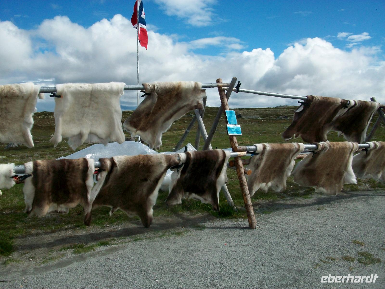 Bei einem ganz besonderen Wasserfall müssen wir aber anhalten: dem Steindalfoss. Er stürzt sein Wasser munter über einen Felsvorsprung und der Besucher kann hinter das rauschende Wasser treten und durch den Schleier hinunterschauen, wunderbar! Dann führt uns die Reise hinunter zum Hardangerfjord; auf einer Panoramastraße geht es oberhalb entlang, der Blick zum Wasser und den Höhen ist grandios. Dann steigen wir wieder an; durch zahlreiche Kehrtunnel gelangen wir in eine Schlucht über welcher sich eine Wolke gebildet hat. Oben angelangt sehen wir auch die Ursache: Der Vøringfoss, einer der höchsten Wasserfälle in Norwegen, sendet seine Wasser in einen tiefen Talkessel, die aufsteigenden Nebel verdichten sich oberhalb zu dieser Wolke. Selbstverständlich schauen wir uns auch dieses Naturschauspiel von der Nähe an und halten einmal mehr den Atem über solche Urgewalten an. Nach einer kleinen Stärkung sind wir dann im Reich der wilden Rentiere unterwegs. Schnell treten die Bäume zurück und vor unseren Blicken dehnt sich die Hardangervidda aus. Mächtige Bäche kommen uns entgegen und wir sehen die typische Tundra - Vegetation dieser Hochebene mit dem besonderen Licht. Schneeflecken säumen unsere Bahn auf der schmalen Straße, selbst eine Sami - Siedlung können wir hier oben bewundern.