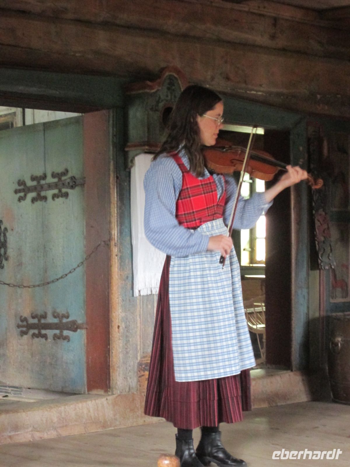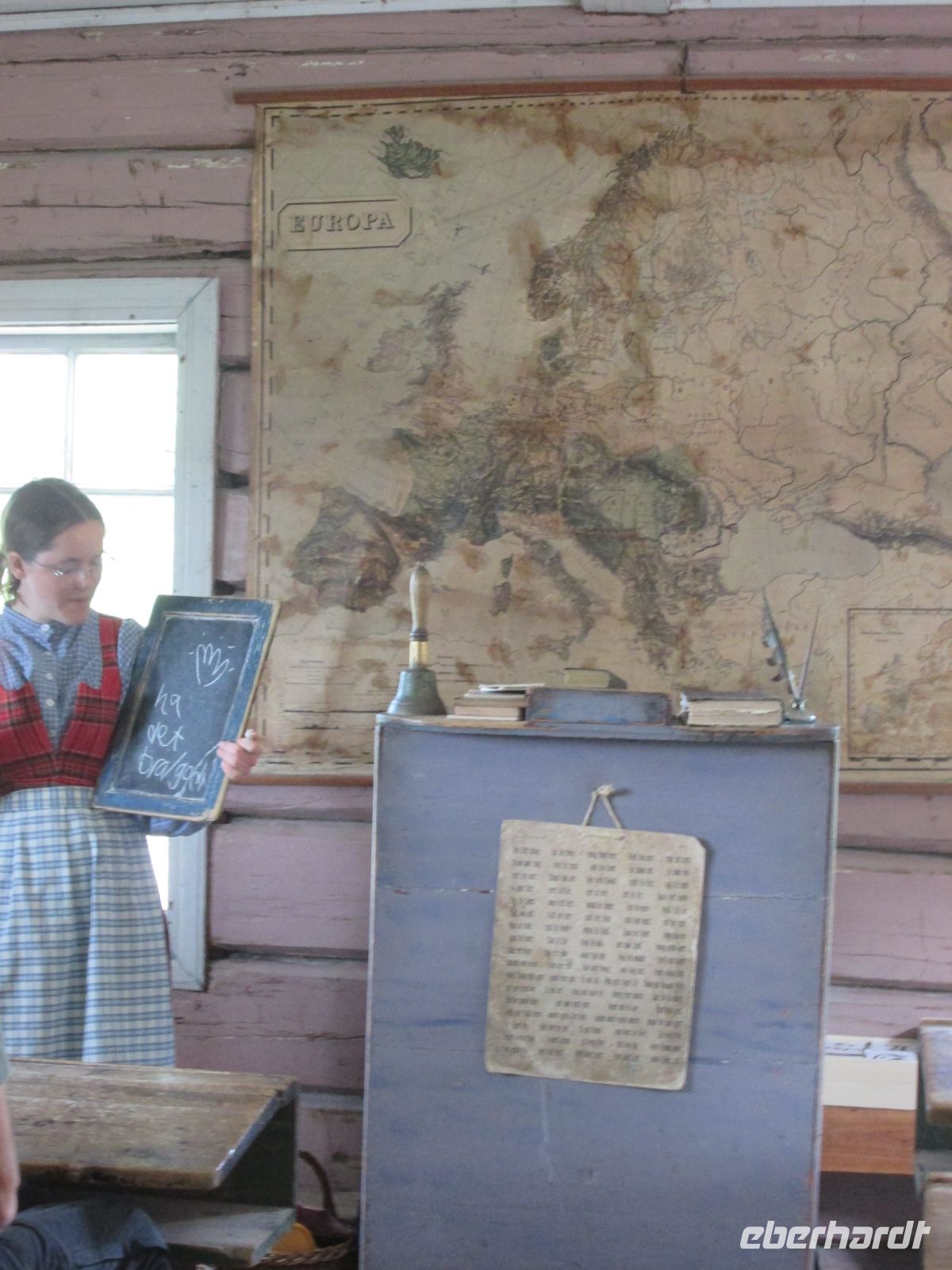 Eine Museumsführerin berichtete uns über die Geschichte der Anlage, über das Leben des Zahnarztes Anders Sandvik und führte uns über Höfe und durch einstige Bauernhäuser. Das erste Mal konnte man auch eine für Norwegen typische Stabkirche sehen. Stabkirchen sollten uns im weiteren Reiseverlauf nochmals beschäftigen. Durch das Pfarrhaus und den Bauernhof führte uns die Tour, aber auch in die Schule. Dort, Frauen und Männer getrennt, lernten wir die norwegischen Buchstaben und einige Wörter. Es war ein lustiges Erlebnis.