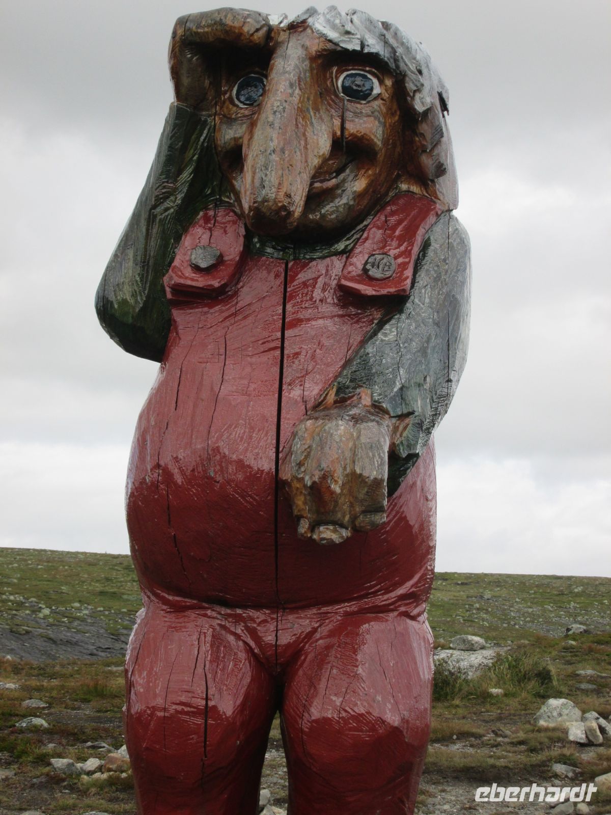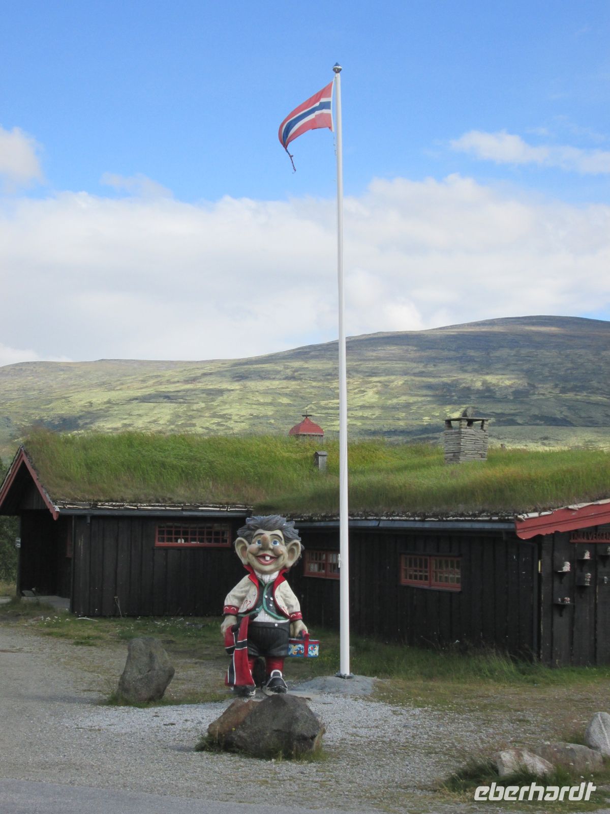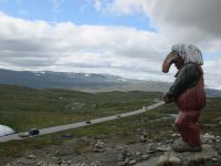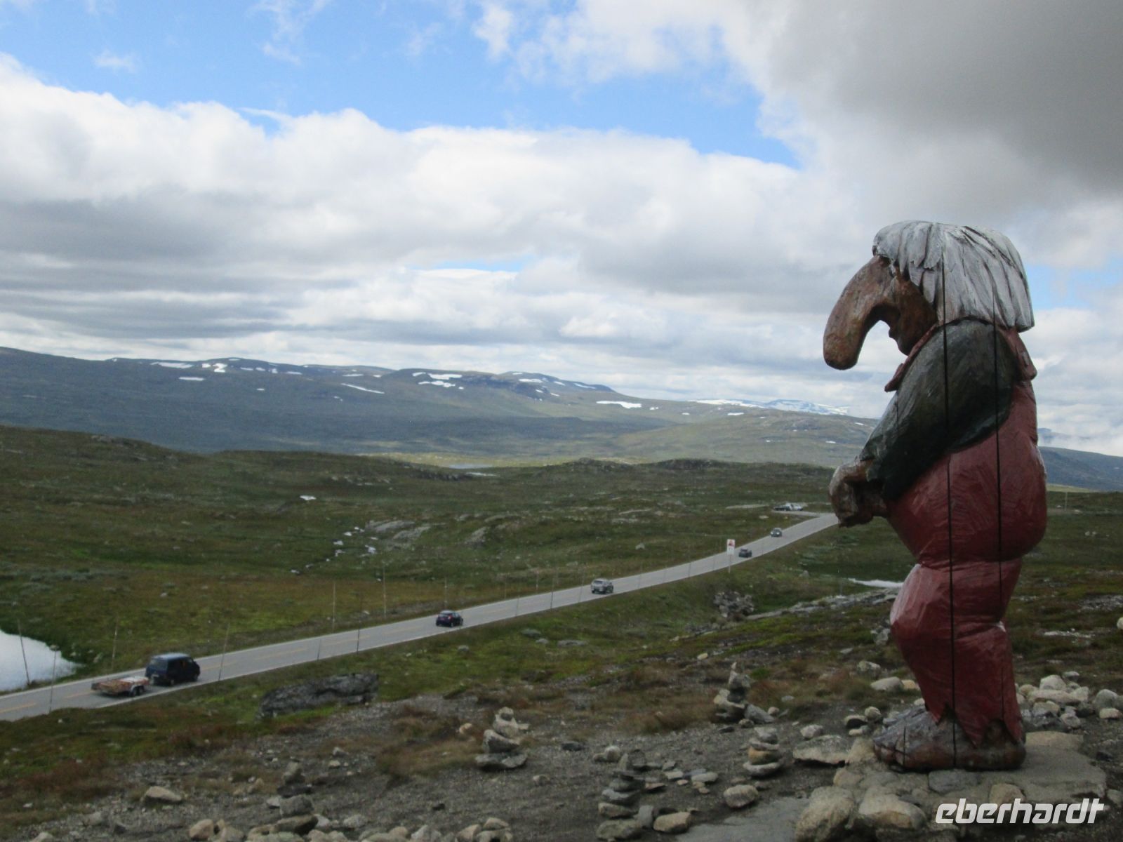 Konnten wir das Sognefjell ohne Regen, tiefhängende Wolken oder Nebel überqueren? Das war die Frage, denn die einmalige Landschaft sollte man doch genießen. Ja! So erfolgte die Fahrt über die Passhöhe von 1434 m mit geschichtlichen Erläuterungen und vielen Ausblicken in die beiden uns begleitenden Nationalparks Jotunheimen und Breheimen mit Gletscher, Seen und Wildbächen. Jotunheimen wird das "Reich der Riesen" genannt. Ihren Ursprung haben sie in der nordischen Mythologie.