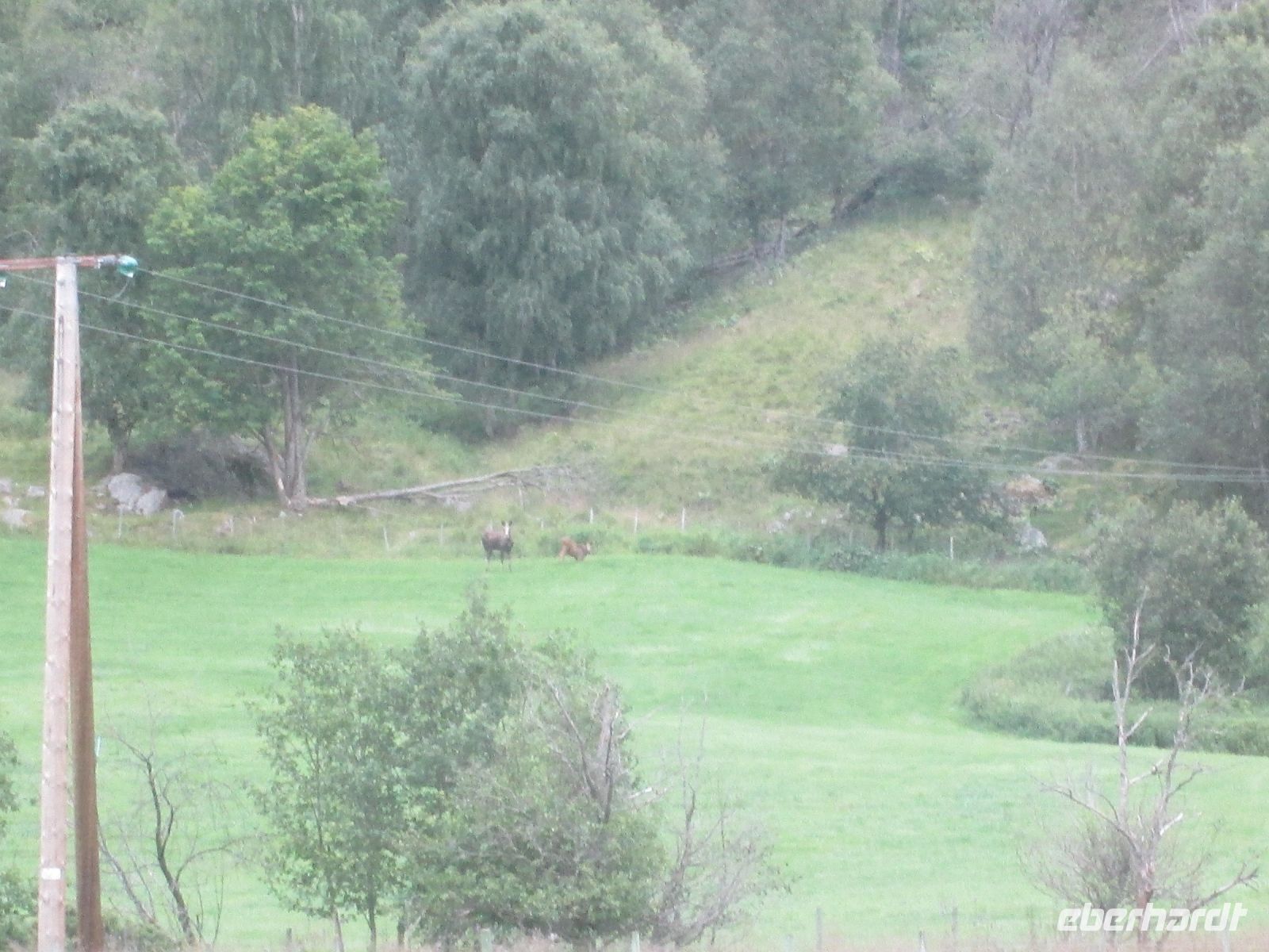 Lom gilt als wichtiger Verkehrsknotenpunkt, es zweigen die Straßen in das Gudbrandstal und auf das Sognefjell ab. Wenige Kilometer lagen noch vor uns für uns bis zum Hotel Elveseter. Und plötzlich wurden 2 Elche entdeckt, oder waren es Pferde, Kühe ? Sicherheit verschaffte uns unser Busfahrer Maik, der eine Wendemöglichkeit fand und zurück fuhr. Ein Fernglas und das Wegtraben der Tiere brachte Gewissheit, wir hatten Elche gesehen!