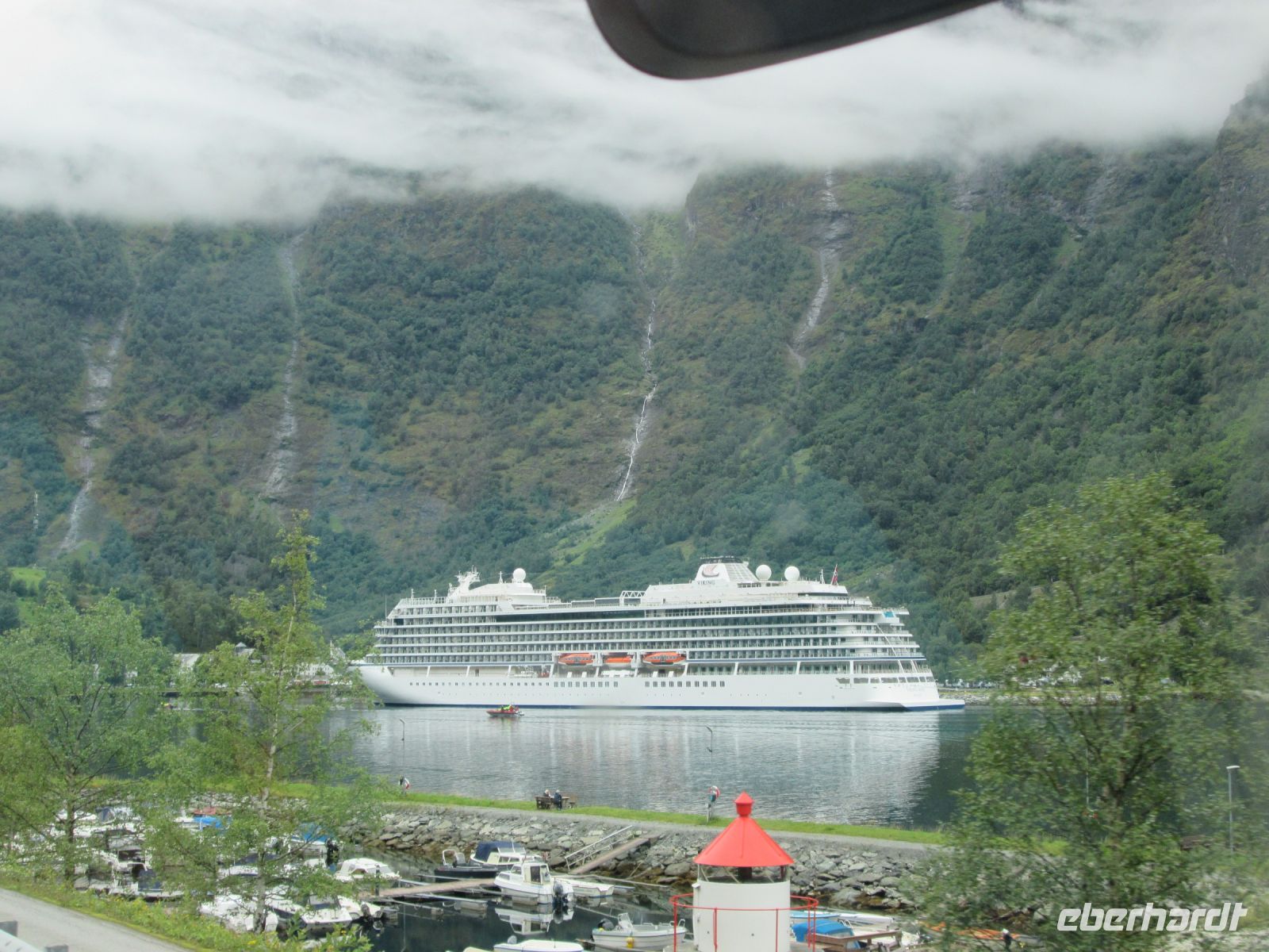 Vom Fjell an den Fjord, um die Mittagszeit war dies der Fall. Flam am Auerlandsfjord hieß uns willkommen. Eine kleine Siedlung, die durch den Kreuzfahrttourismus und die Flambahn bekannt wurde. Die Flambahn ist eine 1924 fertiggestellte Gebirgsbahn mit einer Länge von 20 Kilometern.