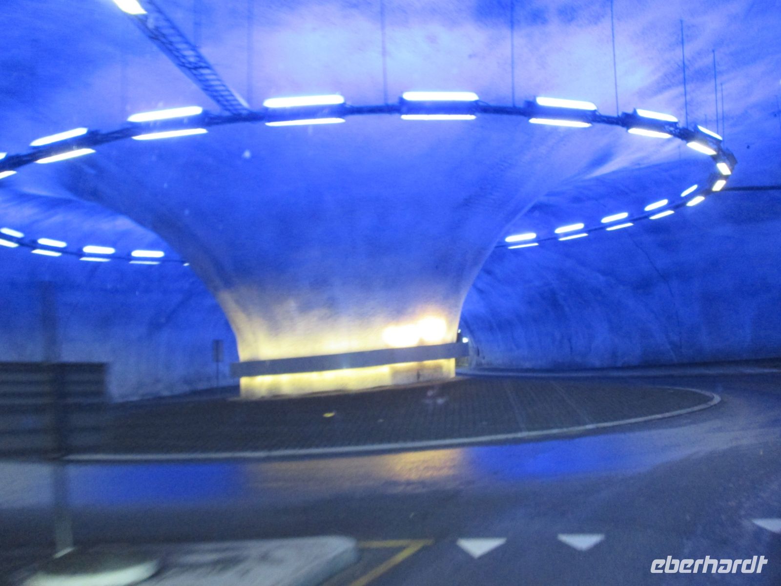 Die Brücke beginnt und endet jeweils in einem Tunnel, in denen es auch noch Kreisverkehre gibt. Die Norweger sind wahre Meister im Tunnel-und Brückenbau.