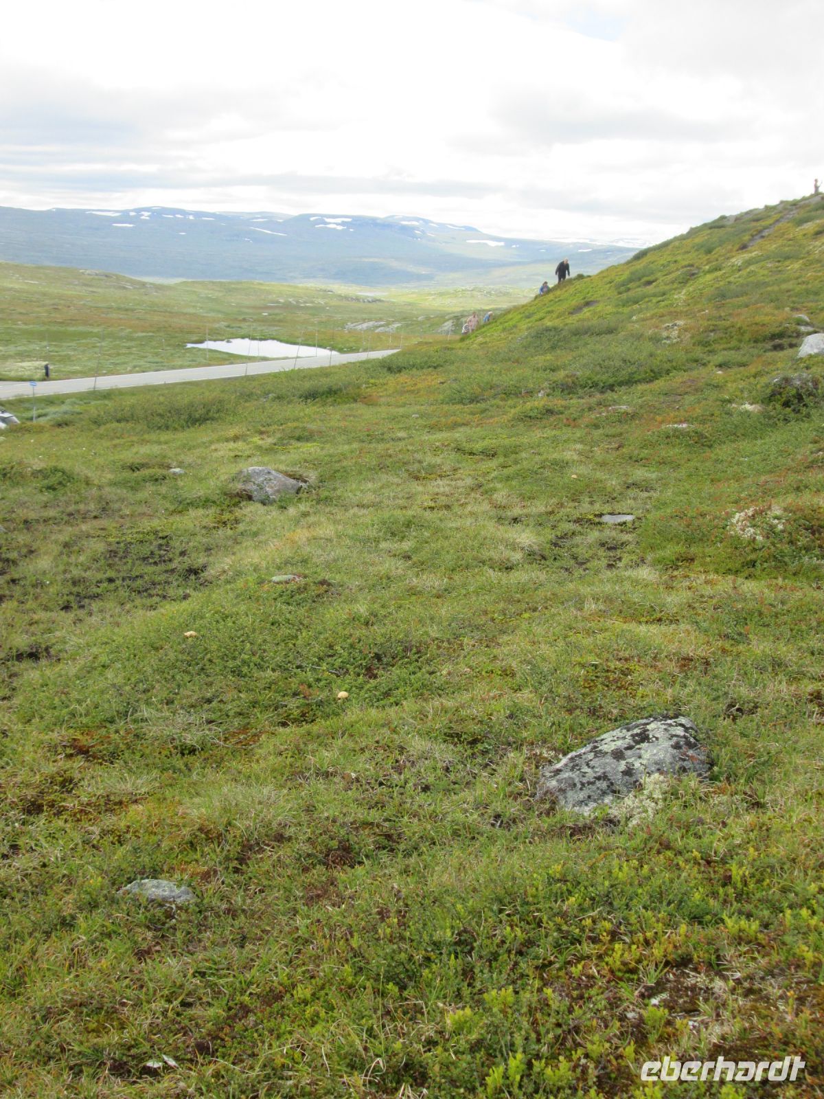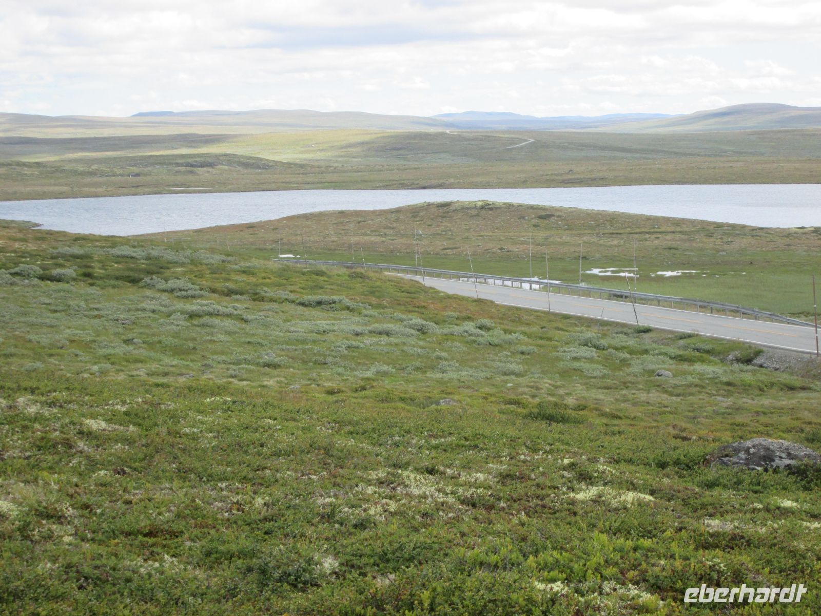 Schnell war das letzte großflächige Fjellgebiet dieser Reise erreicht, die Hardangervidda. Sie ist Europas größte Hochfläche mit 8000 qkm. Entstanden ist sie vor etwa 600 Millionen Jahren. Heute führt die Hauptachse des RV 7 mitten hindurch. Interessant war noch einmal zu sehen, wie das Meer die Oberfläche glättete, und jetzt Flechten und Moose diese rauhe Landschaft, in der es durchaus Wintertemperaturen von bis zu 35 Grad unter Null gibt, bedecken. Auch der Blick zum Gletscher Hardangerjökulen war aufgrund der tollen Fernsicht möglich.