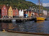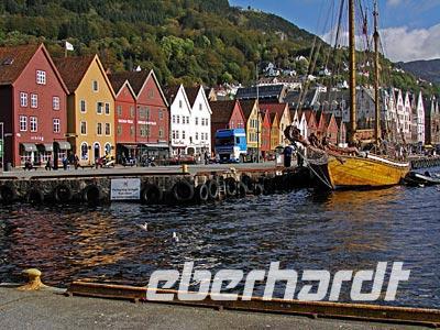 Für Bergen - die regenreichste Stadt Europas - war ausgesprochen schönes Wetter. : Unser örtlicher Reiseleiter in Bergen war von Geburt Franzose und sprach hervorragend deutsch mit interessantem Akzent. Jedenfalls war die Führung interessant und witzig gestaltet. Vom Hafen ging es durch die Altstadt mit der alten Festung, dann zum neueren Teil Bergens und zum anderen Hafen, in dem heute die Kreuzfahrtschiffe anlegen. Hier befindet sich die größere der beiden Bergenfestungen mit der historischen Håkonshalle und dem Rosenkranzturm. Daneben aber liegt das, was Bergen am interessantesten macht: Bryggen, das alte Hanseviertel, das überwiegend aus Holzhäusern besteht und zum UNESCO-Weltkulturerbe zählt. Dieses Viertel war im Mittelalter die Niederlassung der Hanse, lag aber außerhalb der Stadt Bergen. Deshalb war Bergen nie Hansestadt, besaß aber ein Hansekontor in der Nachbarschaft. Nachdem Monsieur Berard uns Bergen und das Hanseviertel erklärt hatte, blieben noch ein paar Minuten Freizeit am Fischmarkt übrig, bevor wir uns am Bus trafen und dann zur langen Tagesstrecke abfuhren. Kaum zu glauben - aber heute ging es schon zur letzten Übernachtung in Norwegen - sozusagen schon ?Heimweg"!