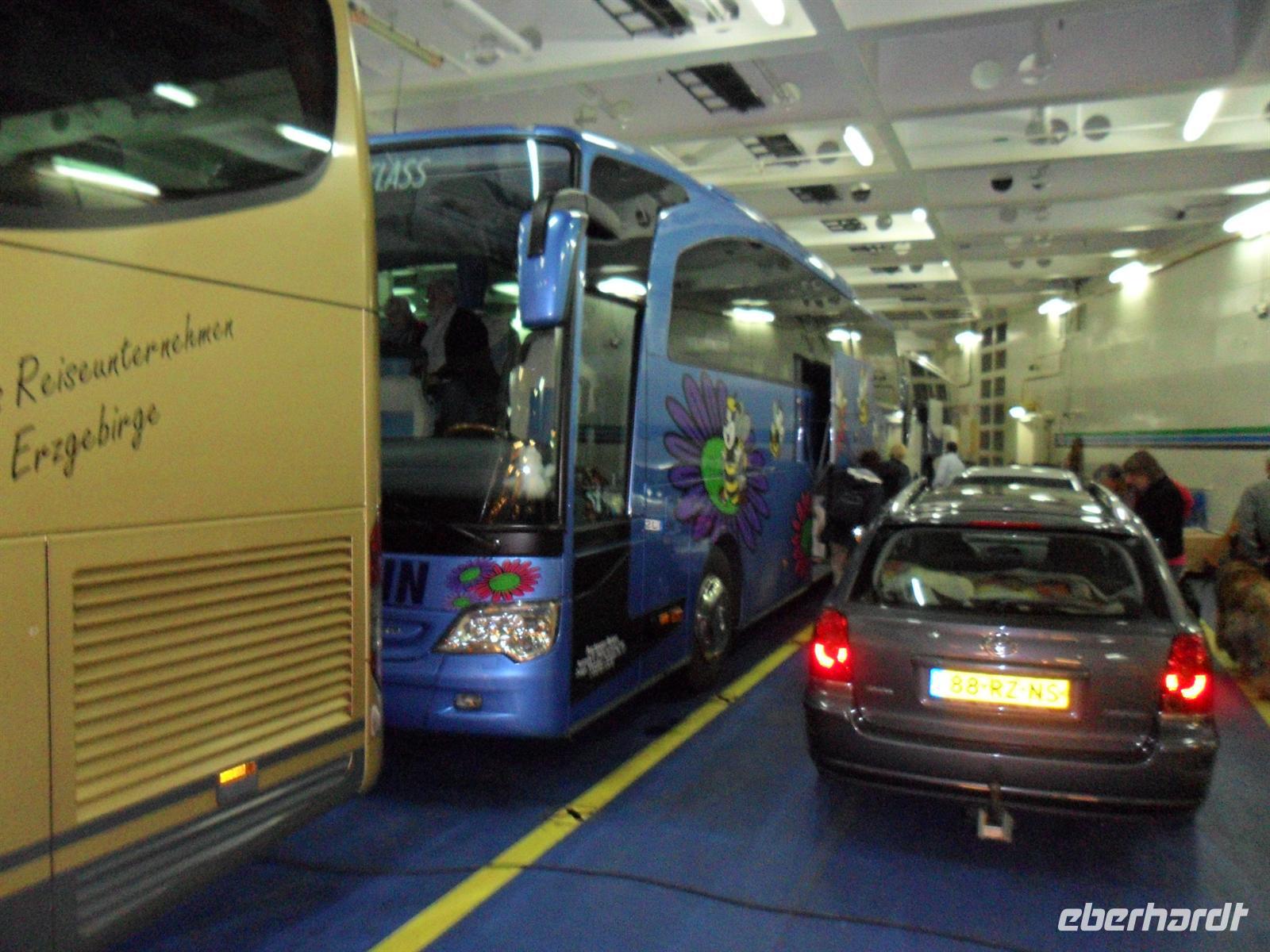 Wir hatten dieses Mal wieder einige Abholstellen, an denen noch Gäste zustiegen - denn nicht alle sind ja Dresdner und so richtet sich die Fahrtstrecke des ersten Tages immer ein wenig - im Rahmen des Reiseziels versteht sich - nach den Einzugsgebieten, aus denen die gebuchten Gäste kommen. Denn bei Eberhardt ist ja die Abholung an der Haustür im Preis inbegriffen und so treffen wir uns mit den Taxis und Transferfahrzeugen an ausgewählten Stellen. Über Leipzig, Halle und Braunschweig führte diesmal unsere Strecke, denn das Tagesziel war die im Hafen von Kiel bereitliegende Fähre der STENA-LINE.