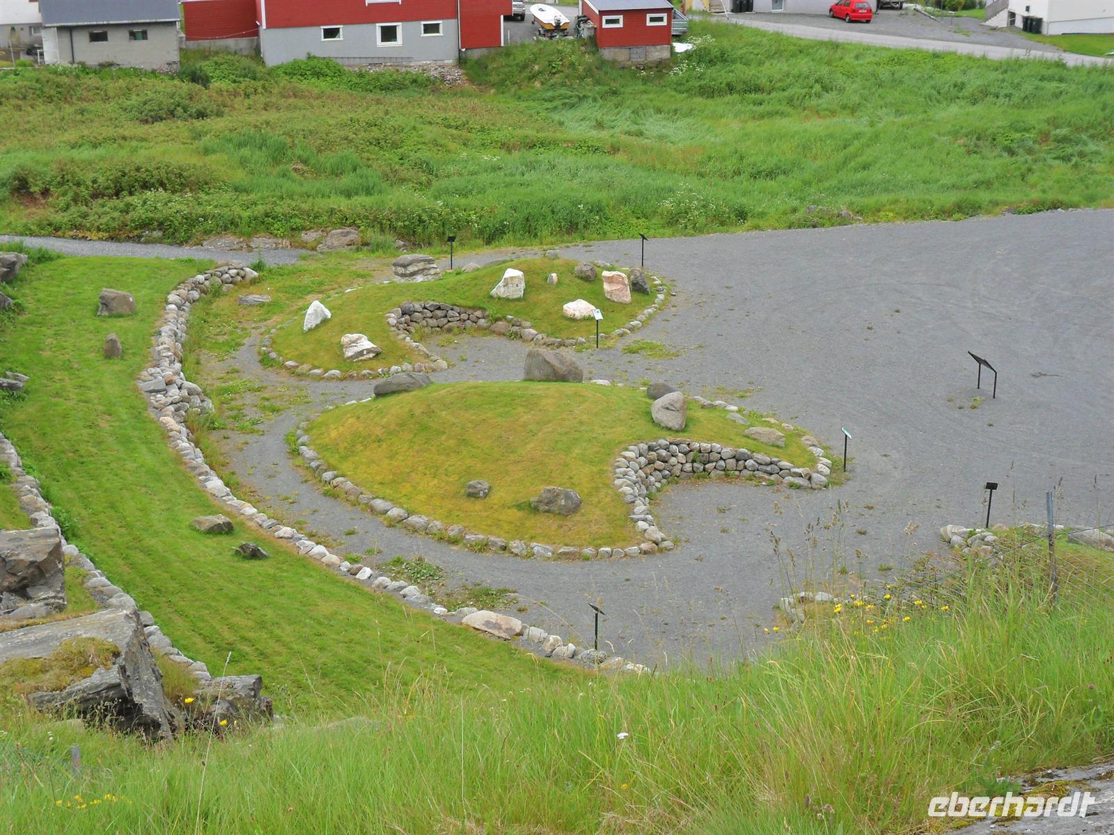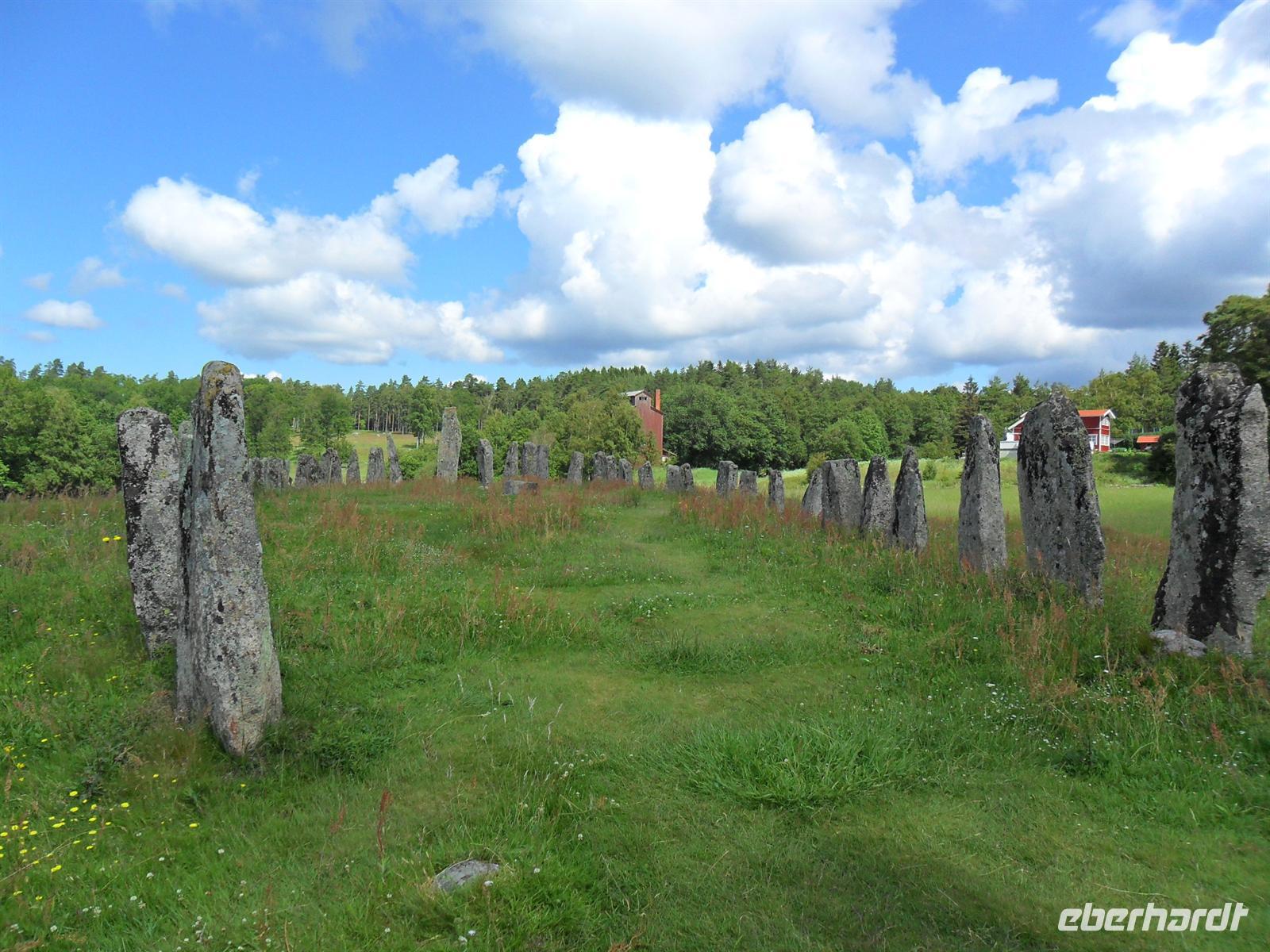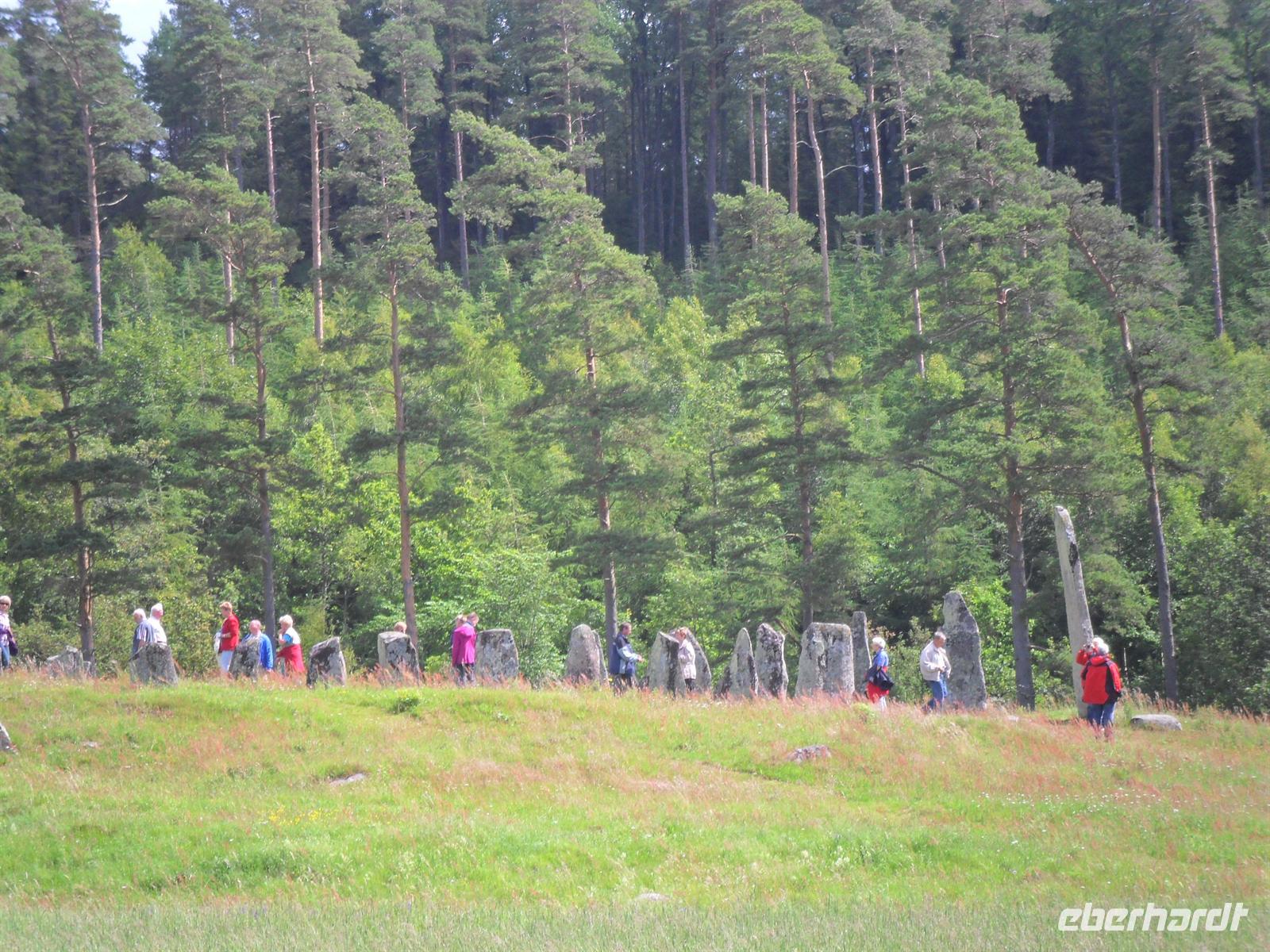 Zunächst folgten wir der E 6 von Göteborg nach Norden und wie immer nach etwa zwei Stunden machten wir an einer Raststätte Pause zum Beinevertreten und Toilette Aufsuchen. Danach ging es weiter, aber noch Erreichen der norwegischen Grenze verließen wir die E 6 für einen kleinen Abstecher: Das Gräberfeld von Blomsholm liegt nicht weit von der Durchgangsstraße entfernt. Das sicherlich interessanteste Detail daran ist eine sogenannte ?Schiffssetzung". Dias ?Blomsholm Schiff" besteht aus 49 gewaltigen Steinen, die auf einem Hügel zu einer riesigen Schiffsform - 42 m lang - aufgestellt sind. Man kann sie nicht genau datieren, manche Forscher verlegen ihren Bau noch in die ausgehende Bronzezeit, andere in die Eisen oder gar Völkerwanderungszeit. Interessant ist dieses steinerne Objekt allemal und so wurde es rasch ein begehrtes Fotomotiv.